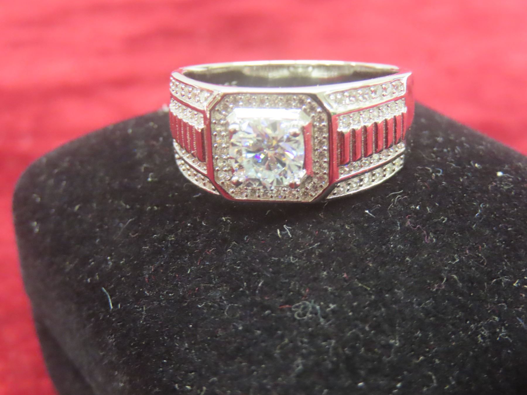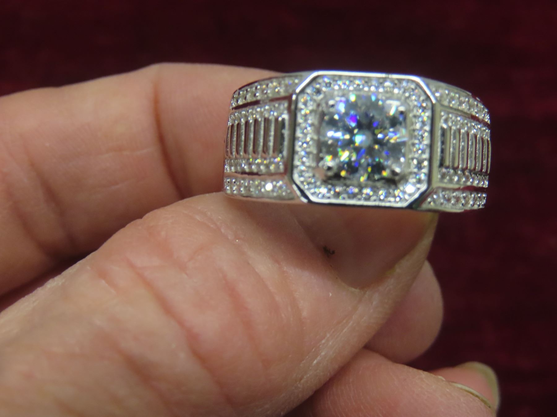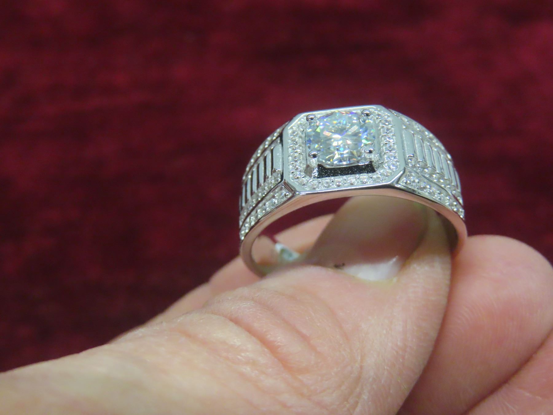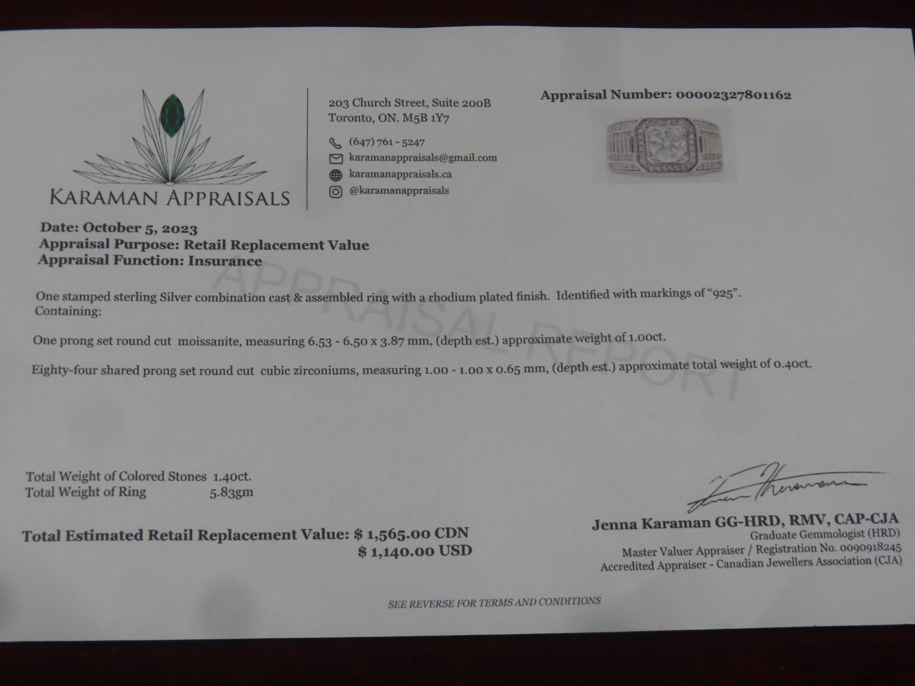 1.00 CT GRA Certified Round Brilliant Cut Moissanite Stone VVS D Color With 84 Round Brilliant Cut Cubic Zirconia Set in Square Halo and in Shanks in 2 Rows Set in 925 Silver Ring Size 11.5 Retail Value $1,565.00