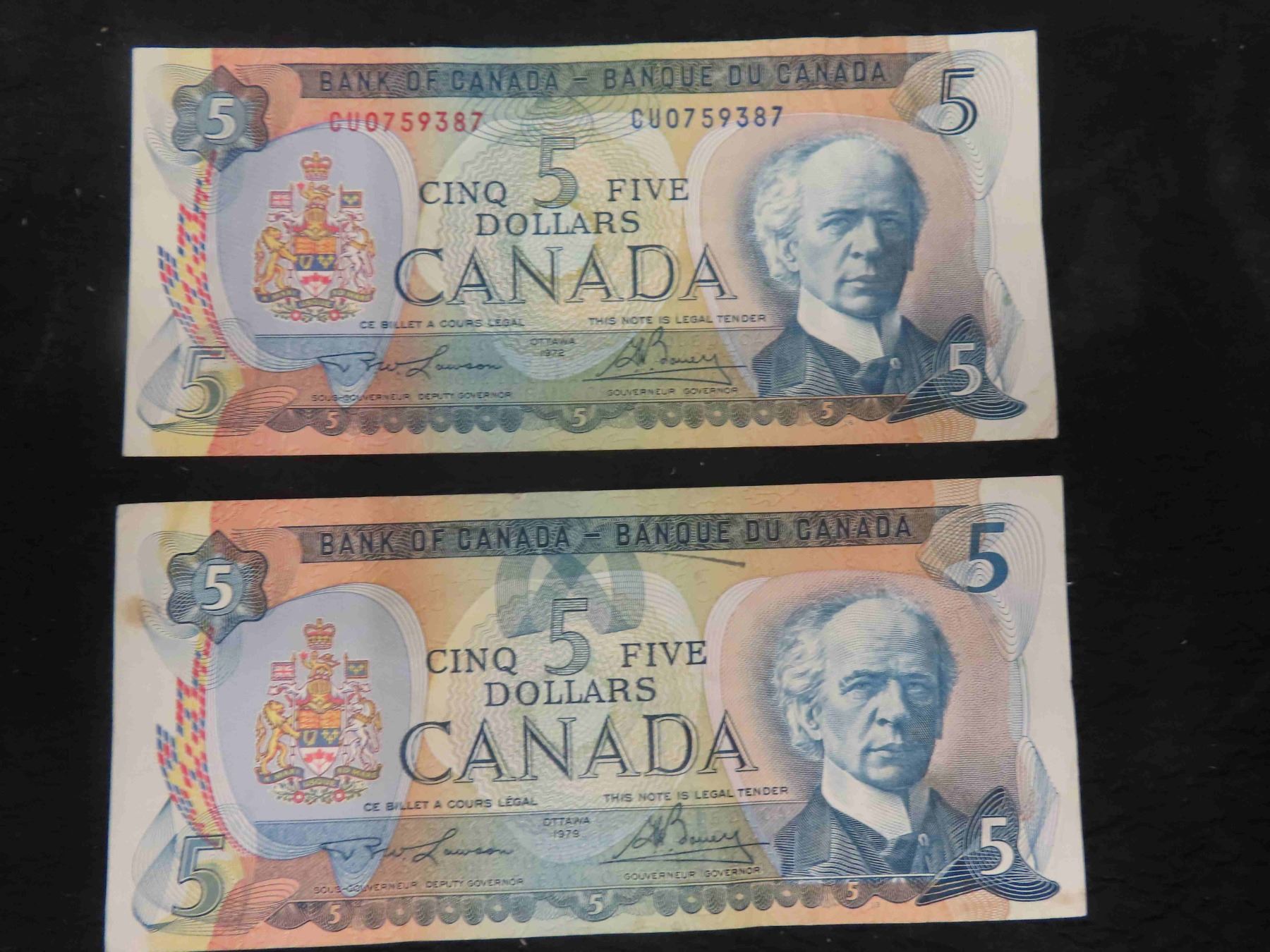 1 1972 and 1 1979 Canada $5 Bills- Very Nice Condition