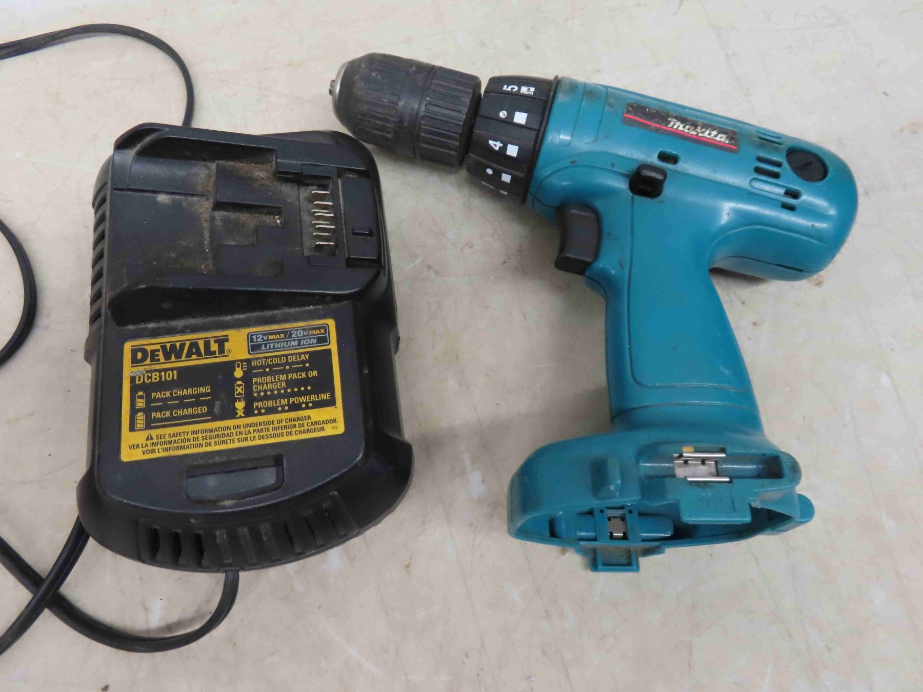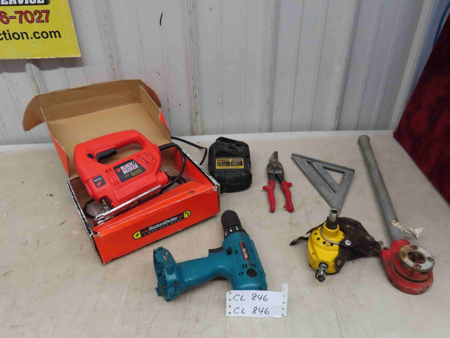 1/2'' Pipe Threader, Black and Decker Power Jig Saw, Air Palm Nailer, Dewalt Charger 12-20V , Cordless Makita Drill No Battery or Charger, Tin Snips