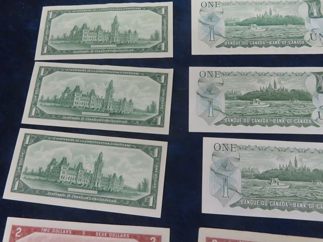 10 Canadian $1 Bills; 5 between 1867- 1967 + 5 1973 & 10 - $2 Bills 5 are 1954 + 5 1974