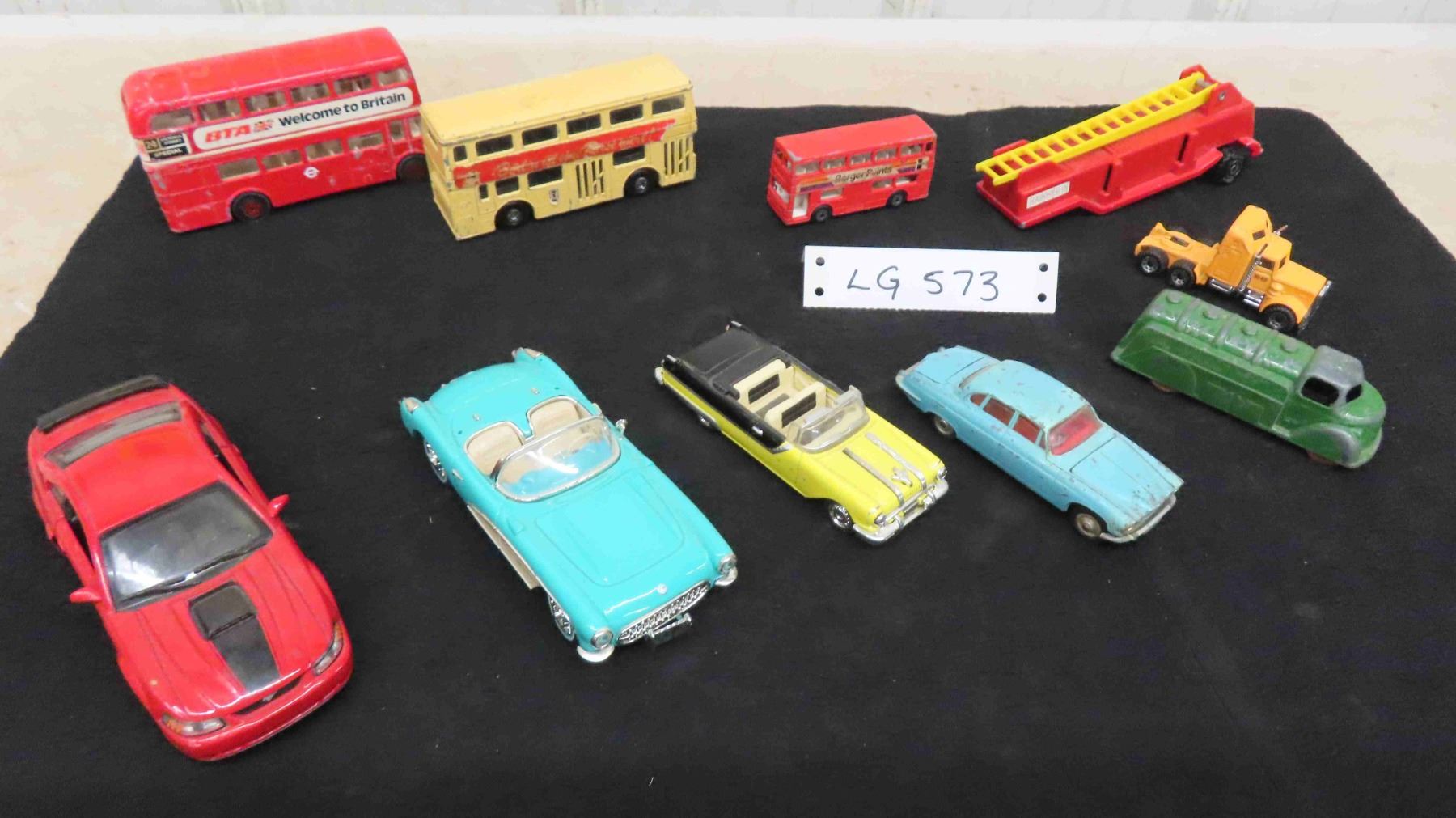 10 Die Cast Vehicles ; Double Decker Busses, Corgi Jaguar, Corvette, Different Scales, plus others