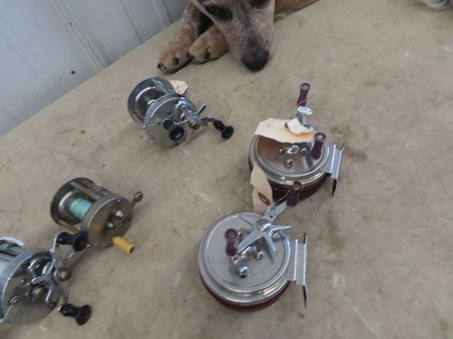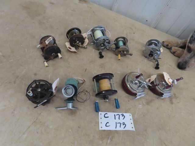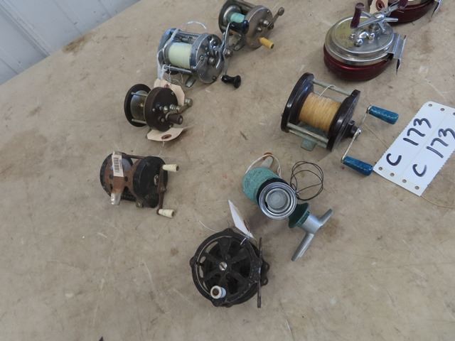 10 Fishing Reels 2) Shakespeare Service 2) Good All EL Mfg 2) No Markings, Acme Mdl MB, Penn #77, Viking, Flo- Line