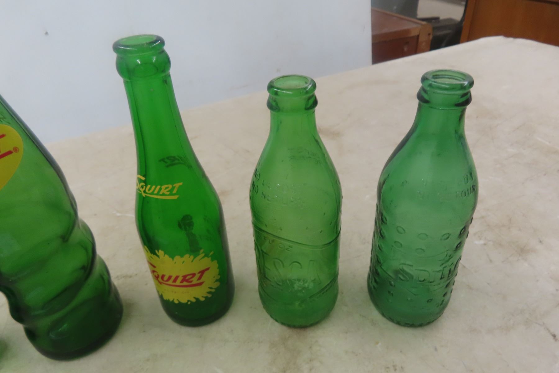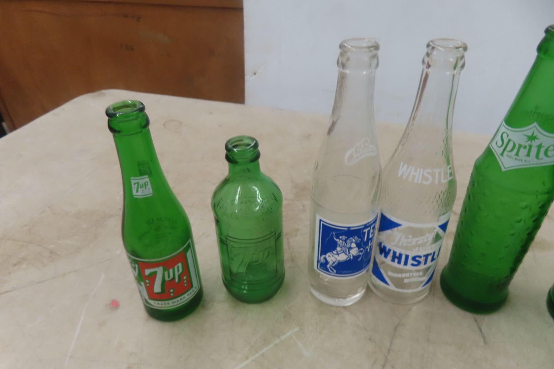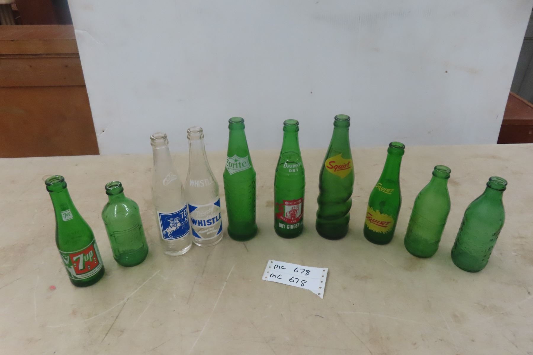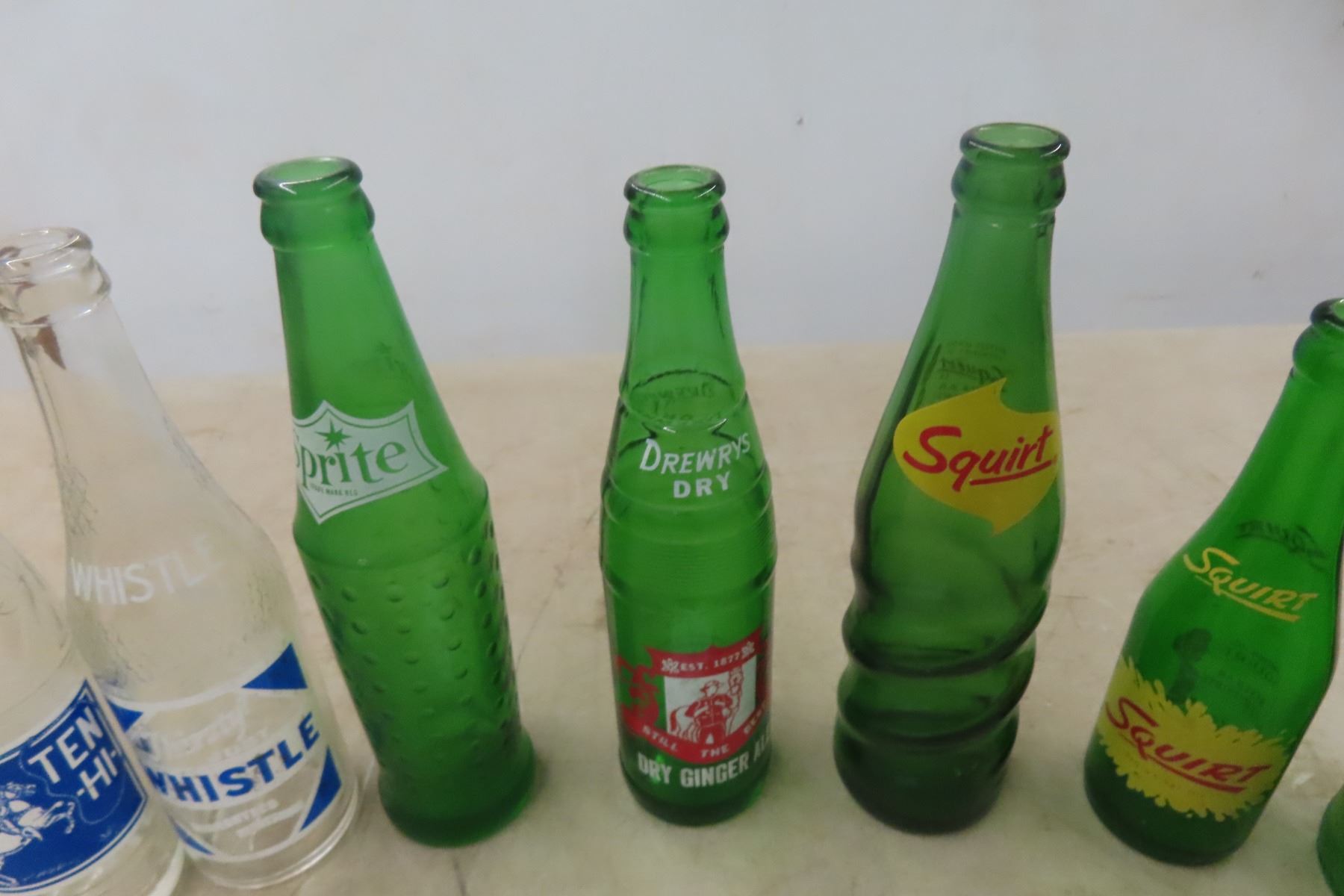 10 Pop Bottles : Drewrys , Dry, Squirt, Fresca, 7up, Ten hi, Sprite, Whistle.