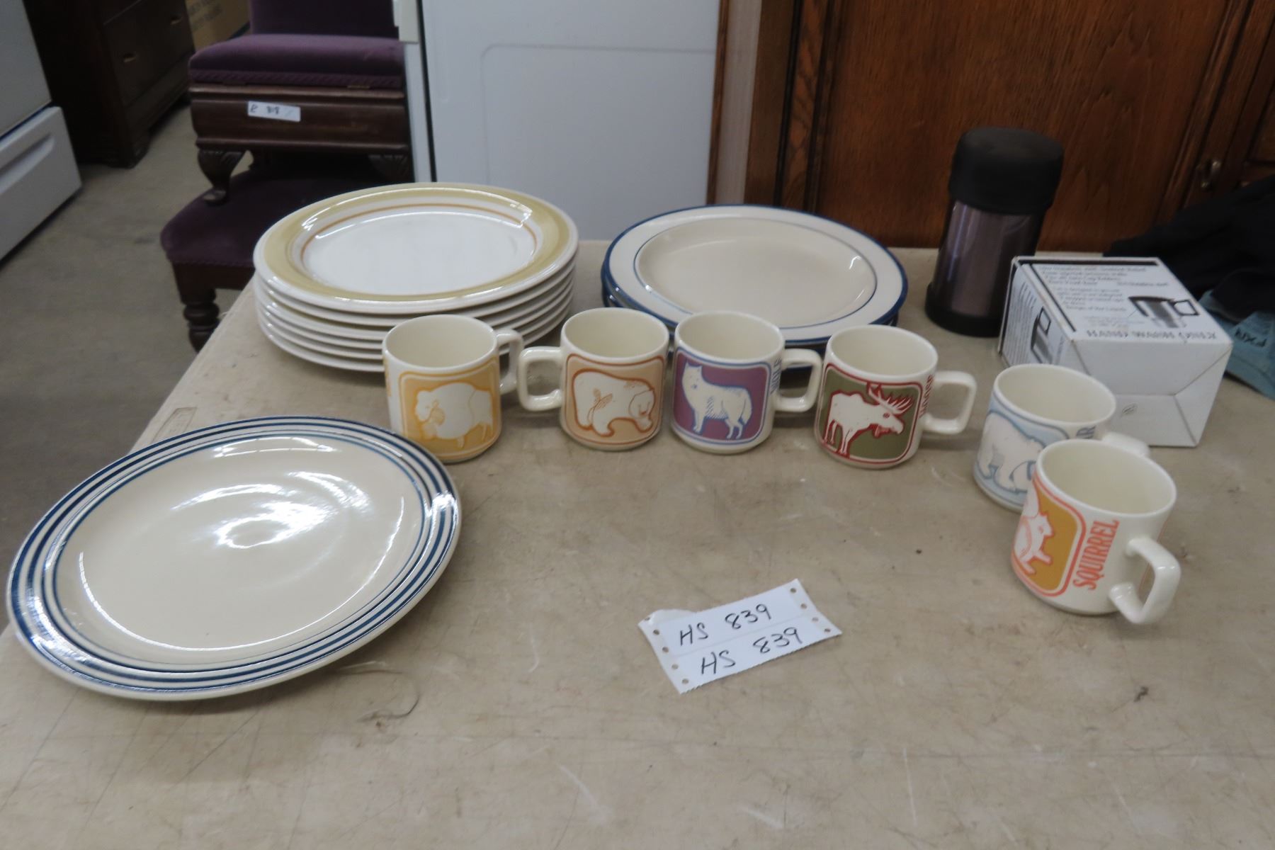 10 Stoneware Dinner Plates, 6 Critters Coffee Mugs + 2 Travel Mugs