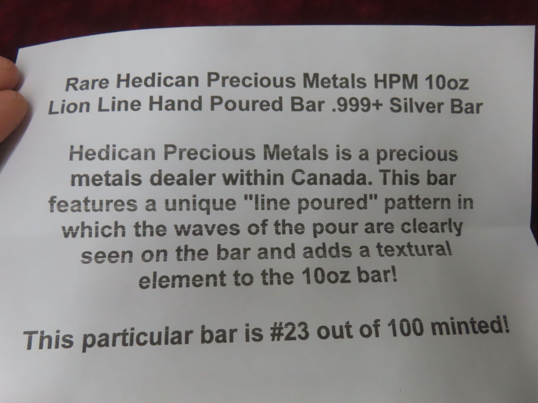 10 oz .999+ Silver Bar by Hedican Precious Metals, Lion Line, Hand Poured, #23