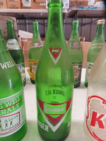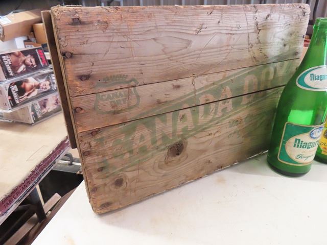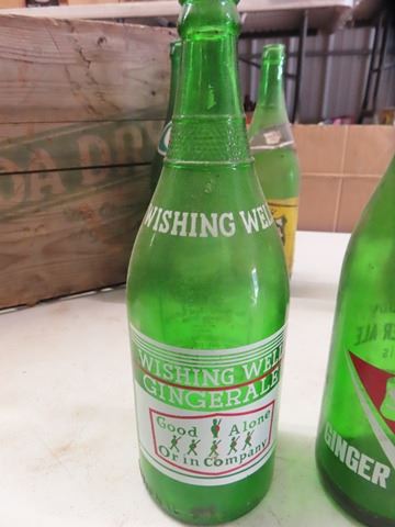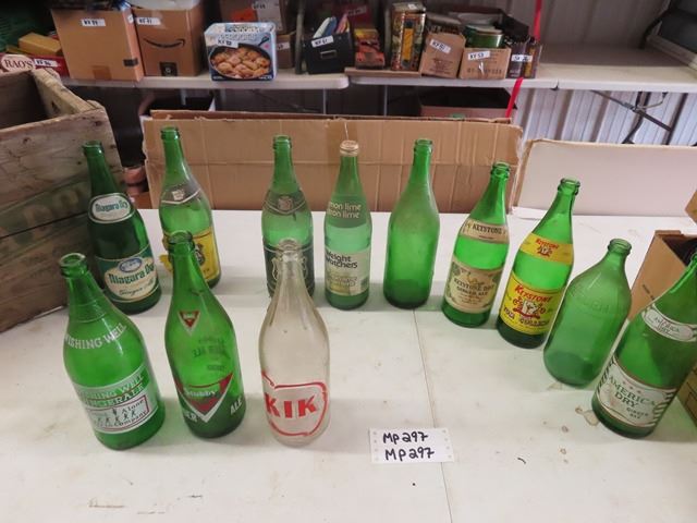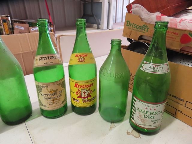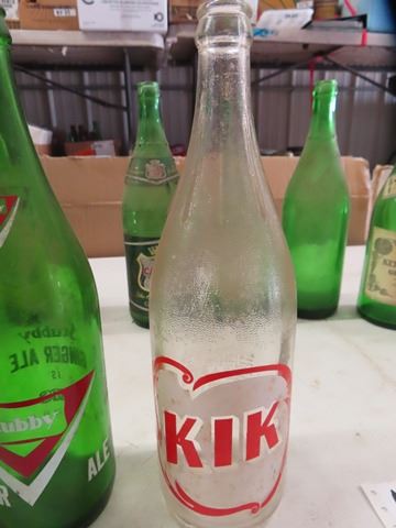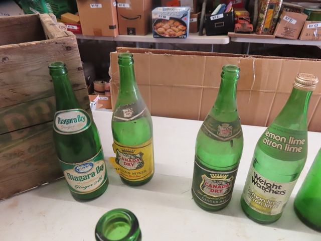12 Assorted 28oz Pop Bottles; Keystone, Kik, Stubby, Wishing Well - some Paper Labels with Wooden Crate