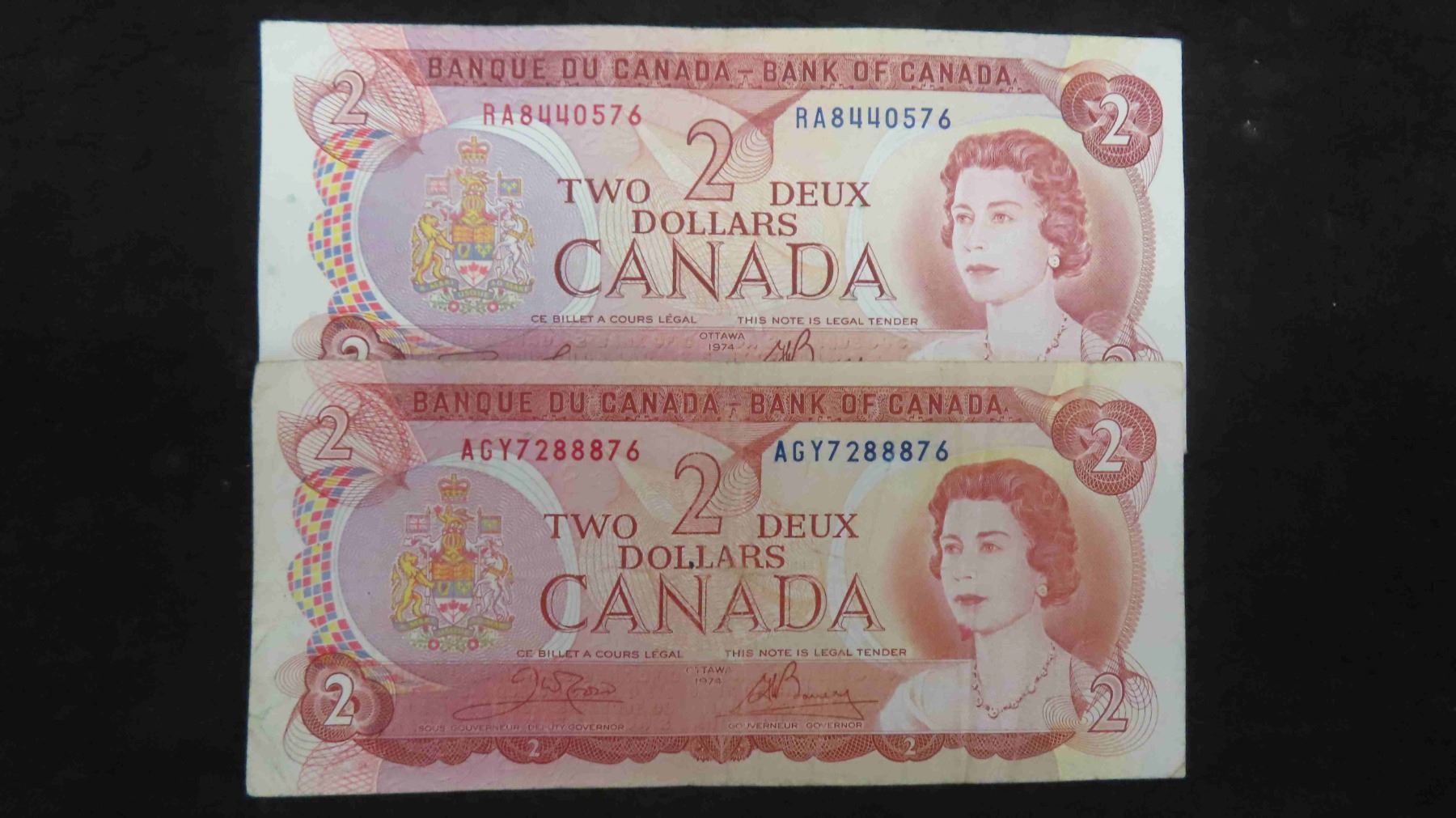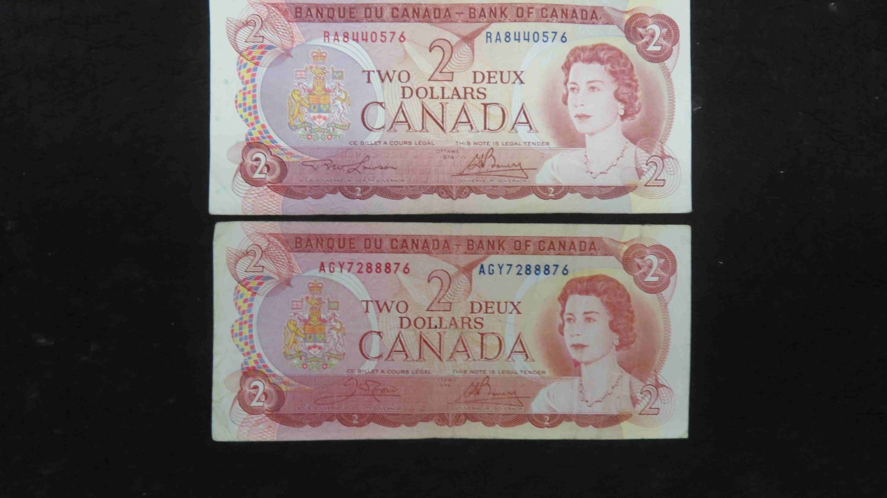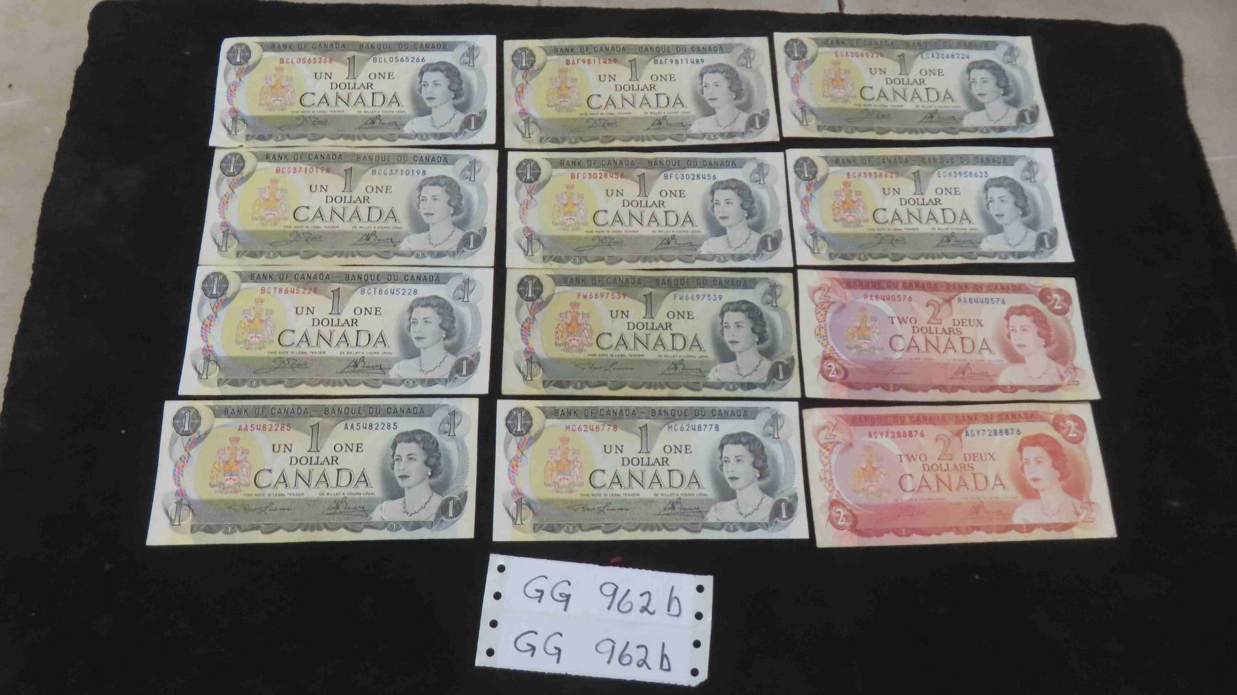 (12) Canadian Bills 1973/74 : (2) $2 Bills , (10) $1 Bills
