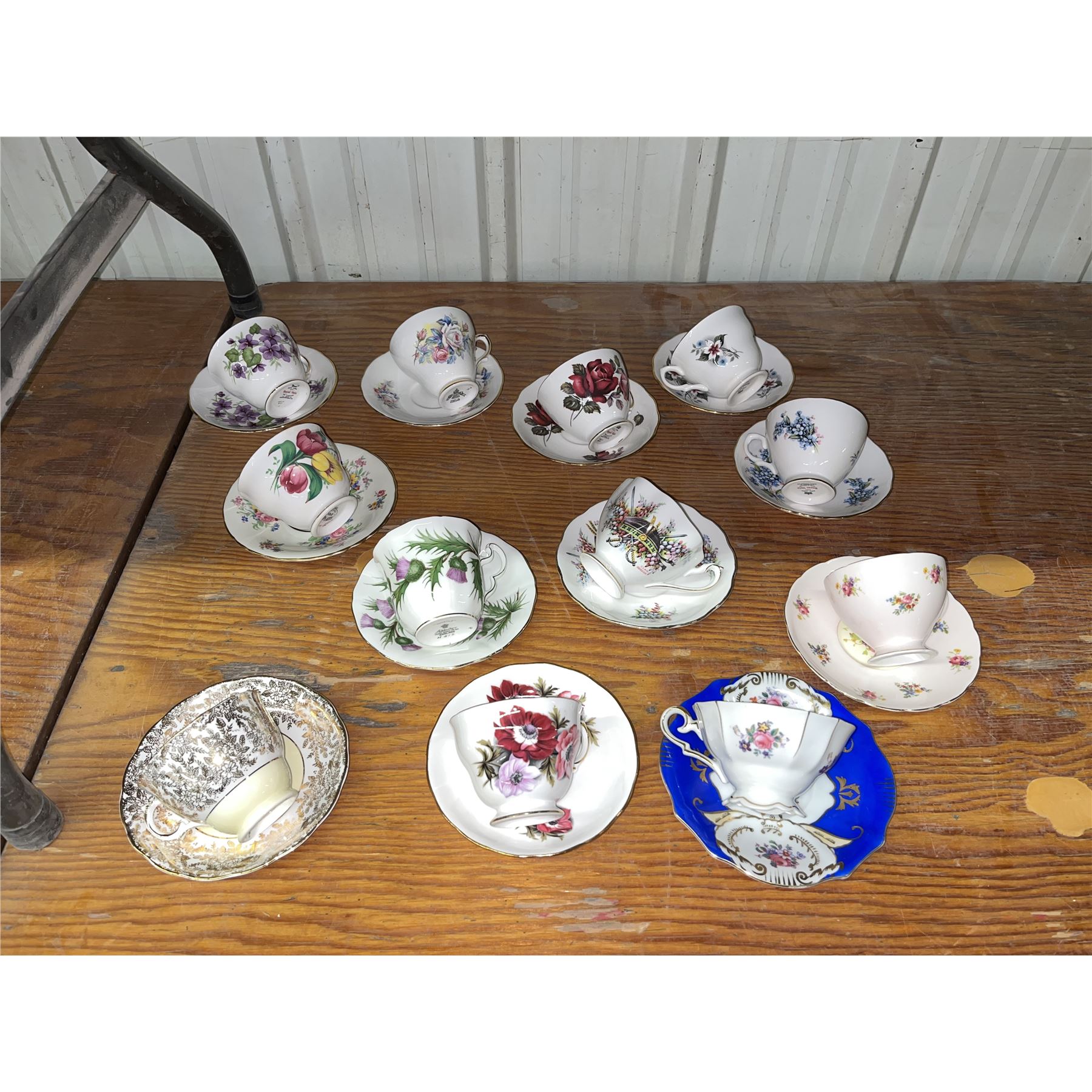 12 China Cups + Saucers ; Royal Vale, Queen Anne, Colclough, Adderley, Delphine