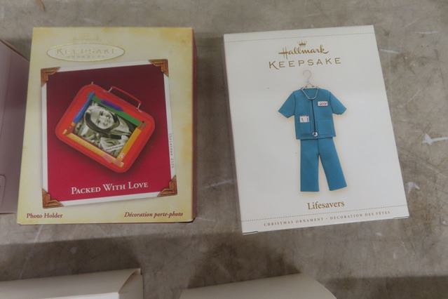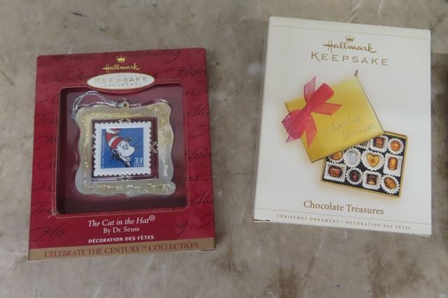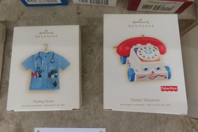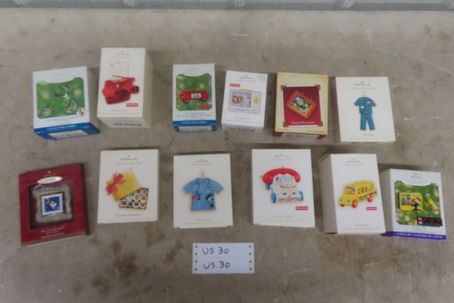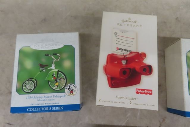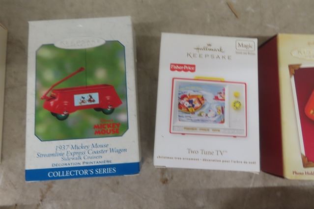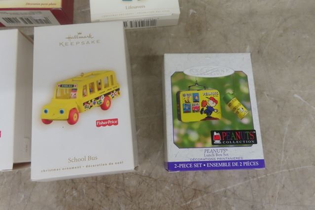 12 Hallmark Keepsake Ornaments ; Mickey Mouse, Fisher Price, Peanuts plus others