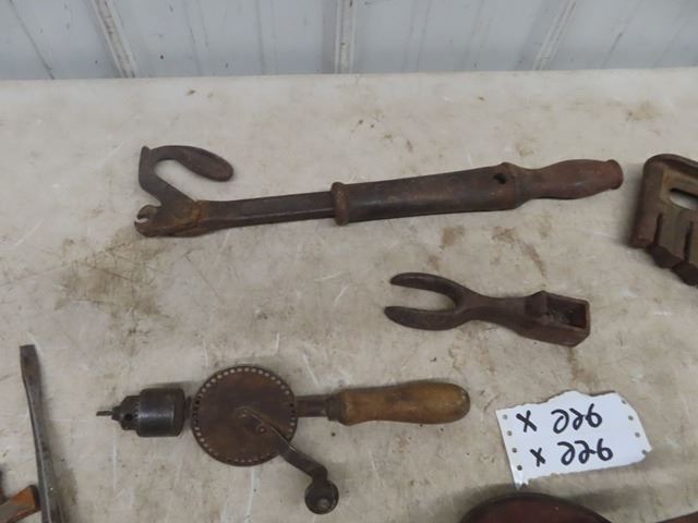 12 Old Tools; Nail Puller, Drills and other Various tools