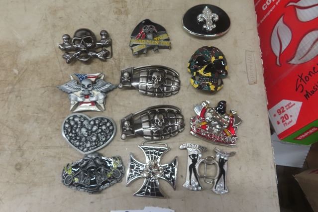 12 Various Belt Buckles - Skulls, Grenade, Hustler