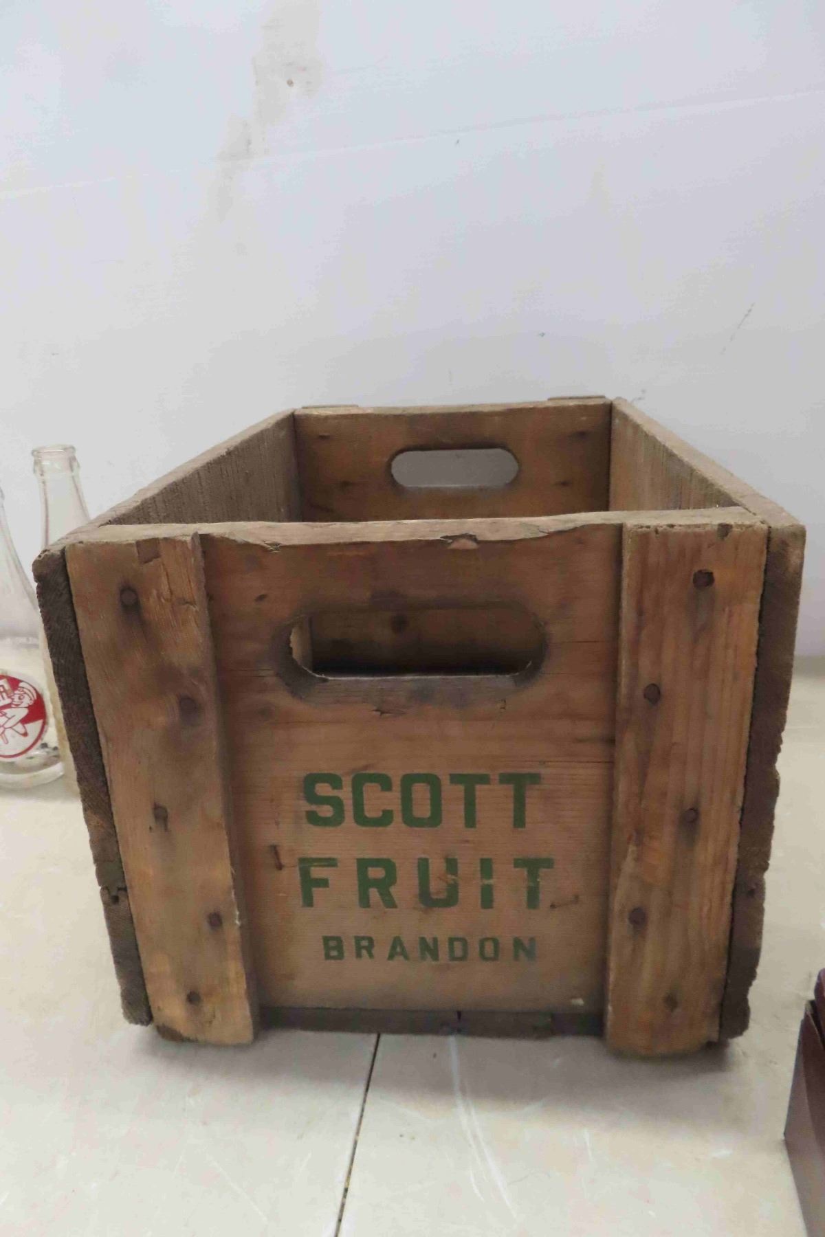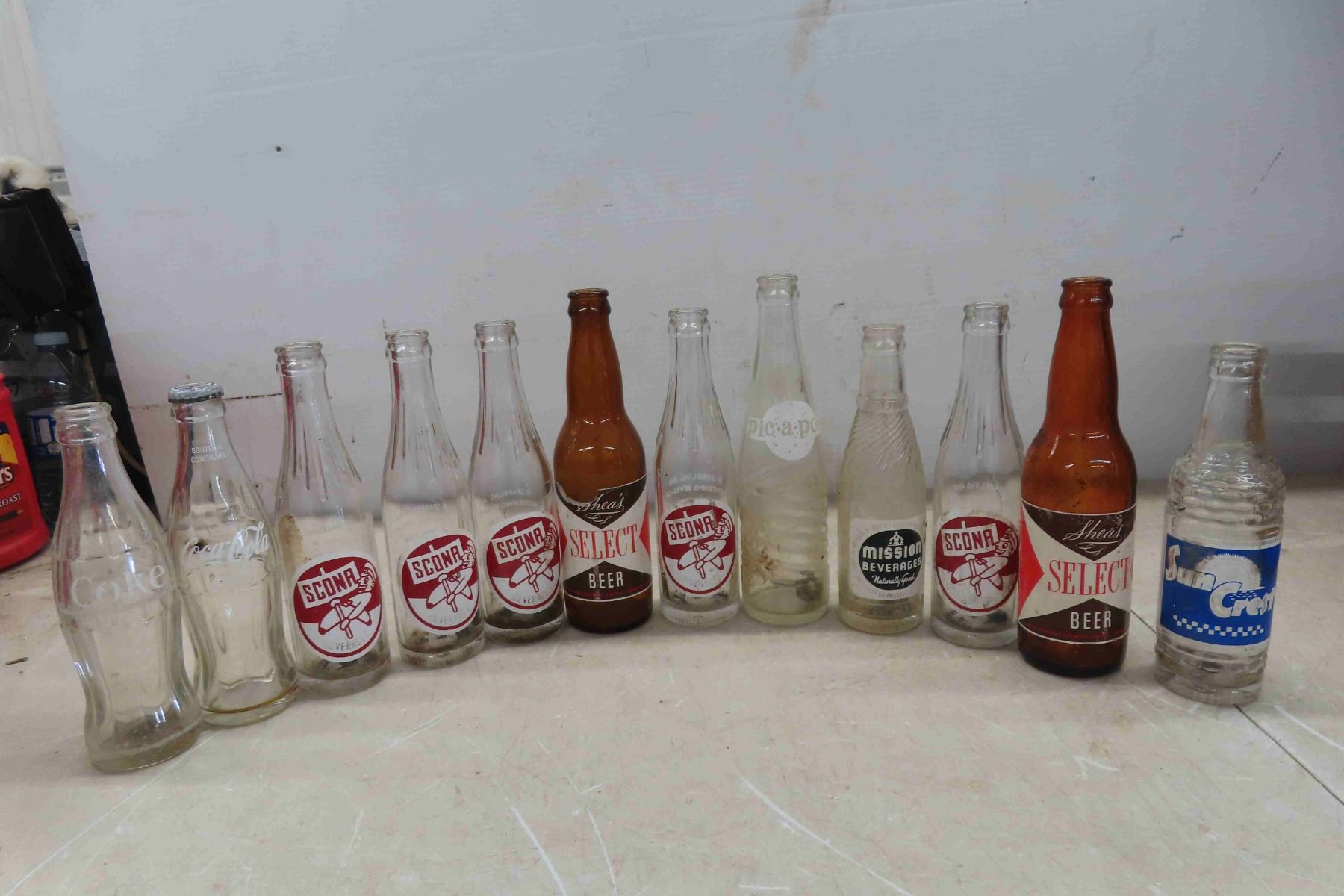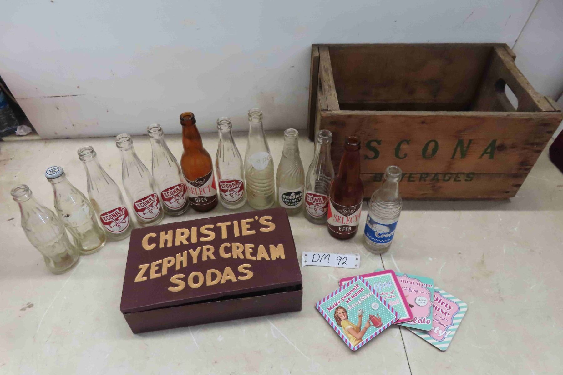 (12) Vintage Glass Bottles, Scona Wood Crate, Cream Soda Tin and Coasters