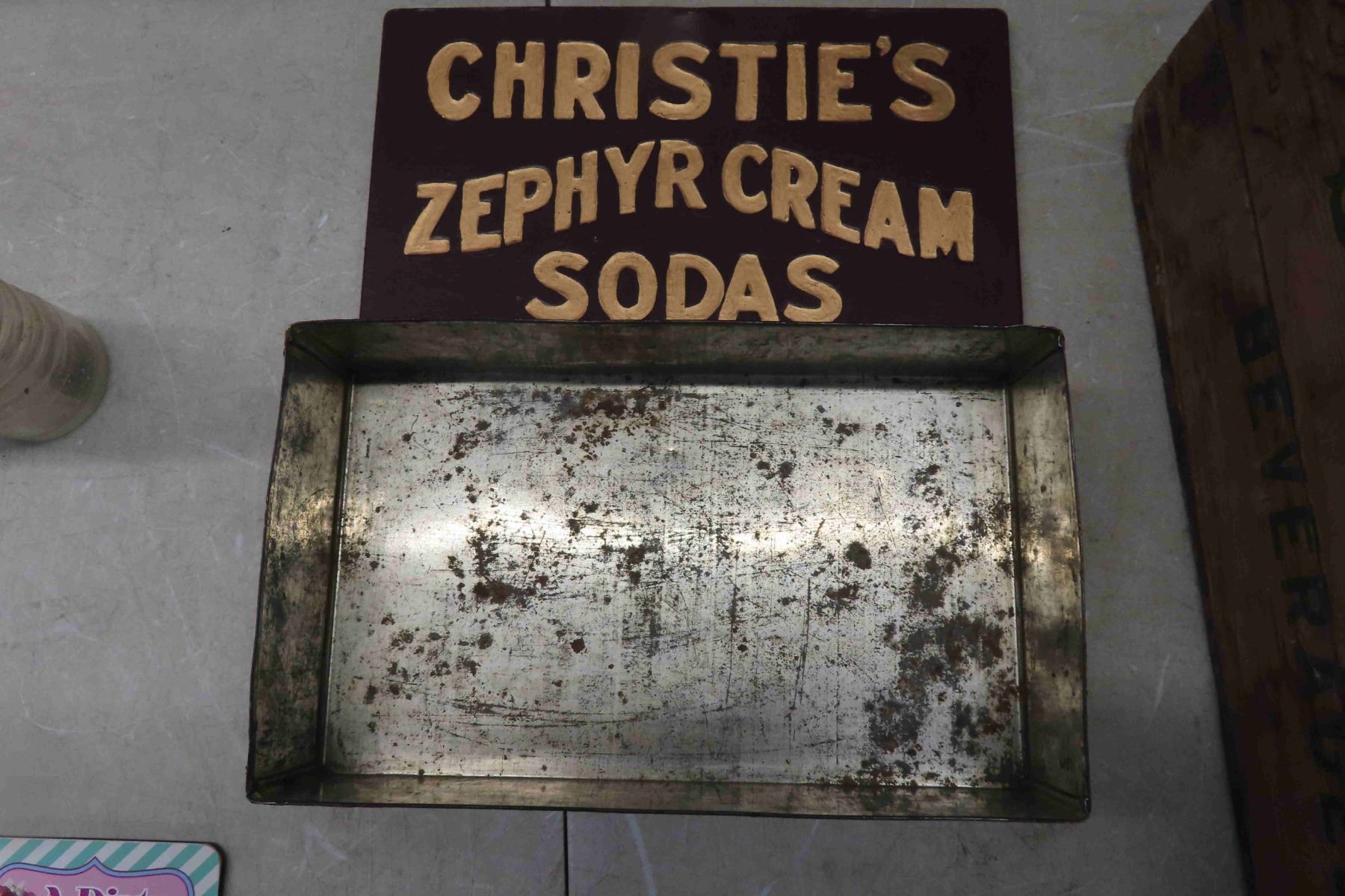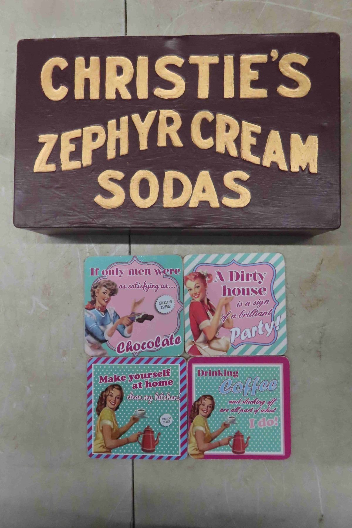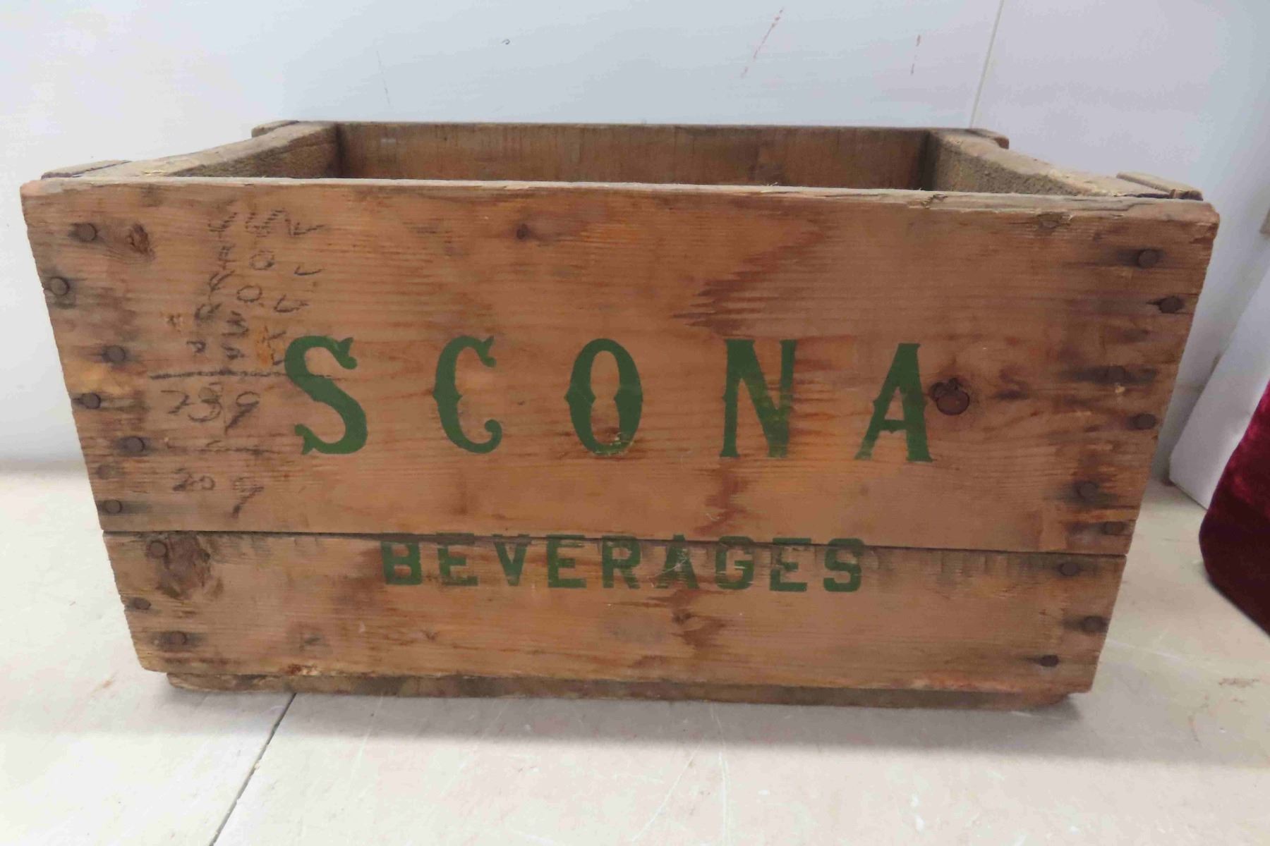 (12) Vintage Glass Bottles, Scona Wood Crate, Cream Soda Tin and Coasters