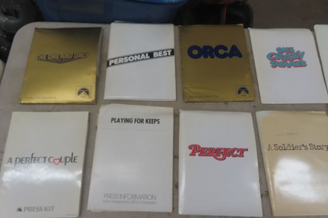 14 Assorted Movie Press Kits ; B+W Promo Pictures, Cast List, Plot, Overview, Biographies, Production Notes and more ; Orca, Plenty, One Crazy Summer, Perfect, Perfect Couple plus more
