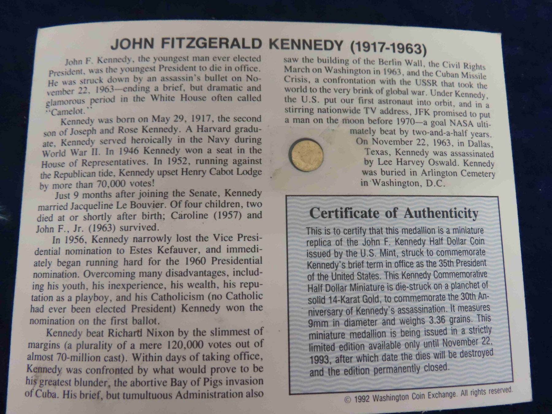 14 KT Gold JFK Memorial 50 Cent Half Dollar