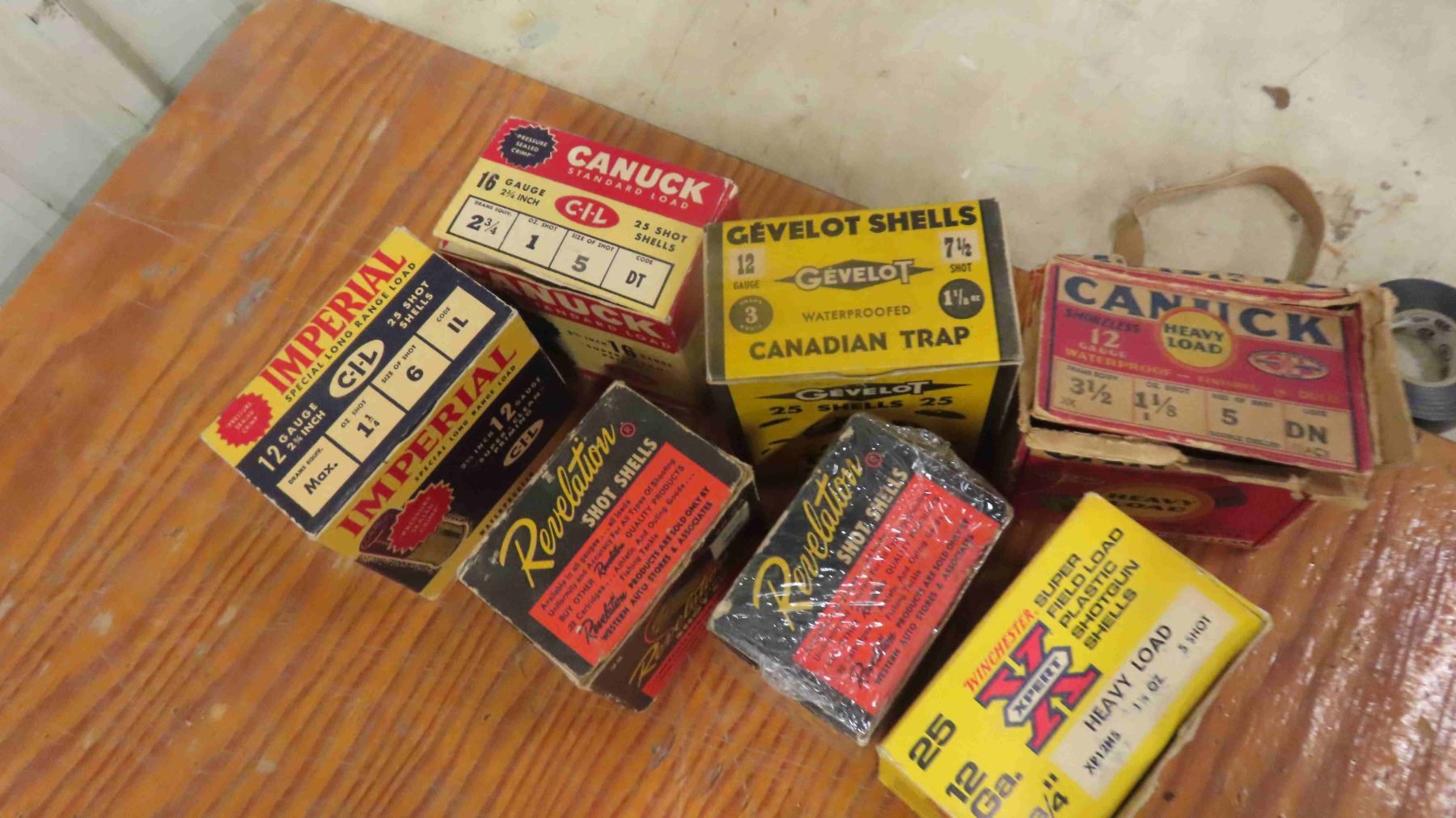 16 Vintage Shot Gun Ammo Boxes - empty ; 16 Gauge, 12 Gauge, 20 Gauge, 410 Gauge : Olympic, Canuck, Imperial, Winchester, Revolution, Gevelot