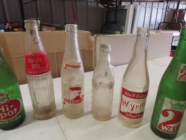 18 Assorted Pop Bottles; Maple Leaf, Wynola, Hi Spot, Dewerys, Pepsi, plus more