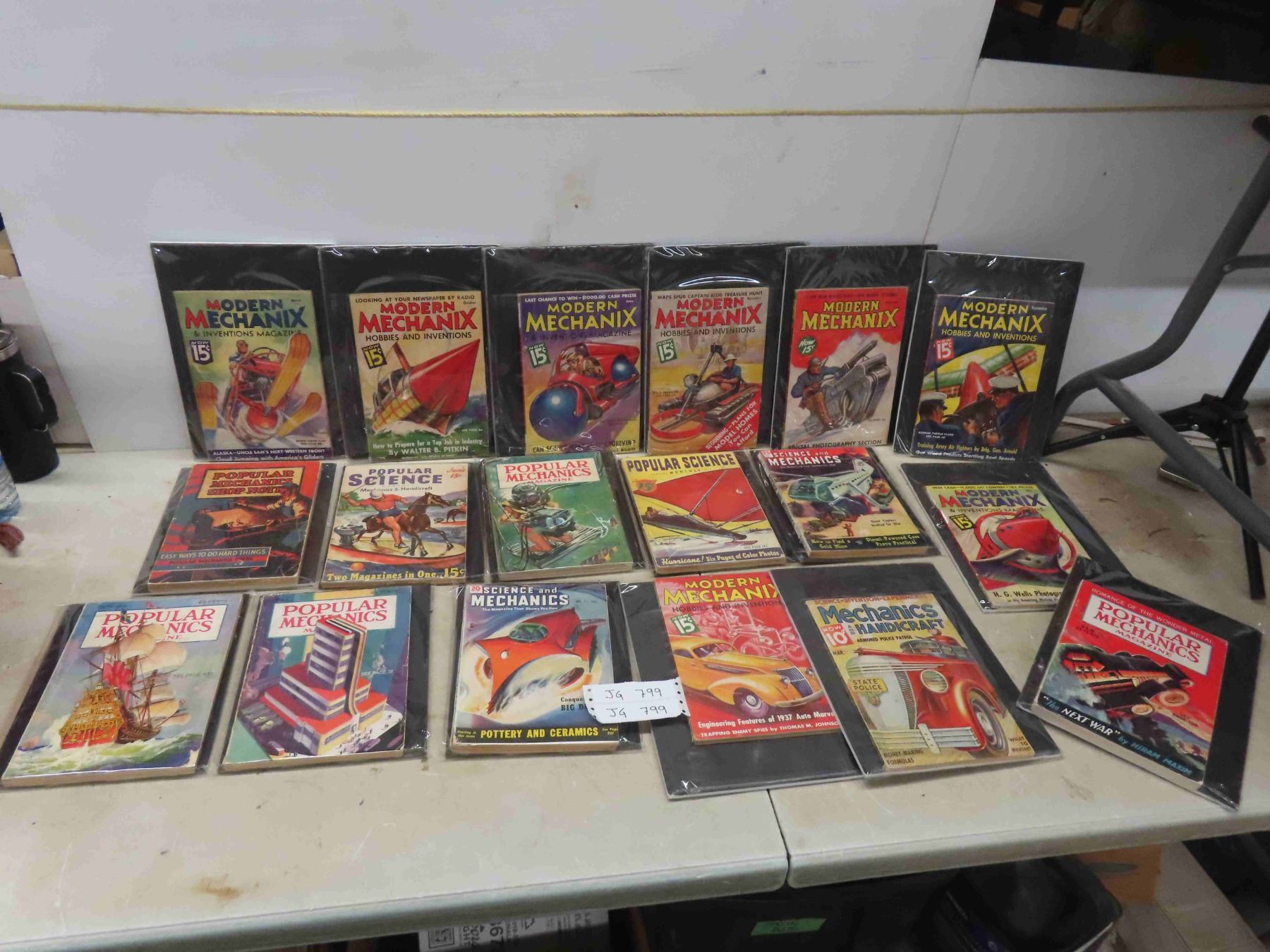 18 Popular Mechanics , Modern Mechanix, Mechanics and Handicraft, Popular Science. Mostly from the 1930s and 2 from the 1940s and one frrom 1950s, all in Plastic Container