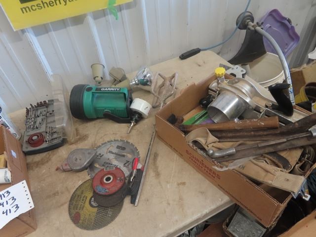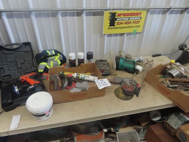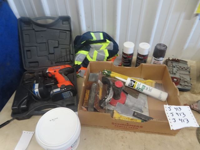 18 Volt Cordless Drill, Trowels, Spray Paint, Safety Vest, Flash Lights, Odd & Ends Tools