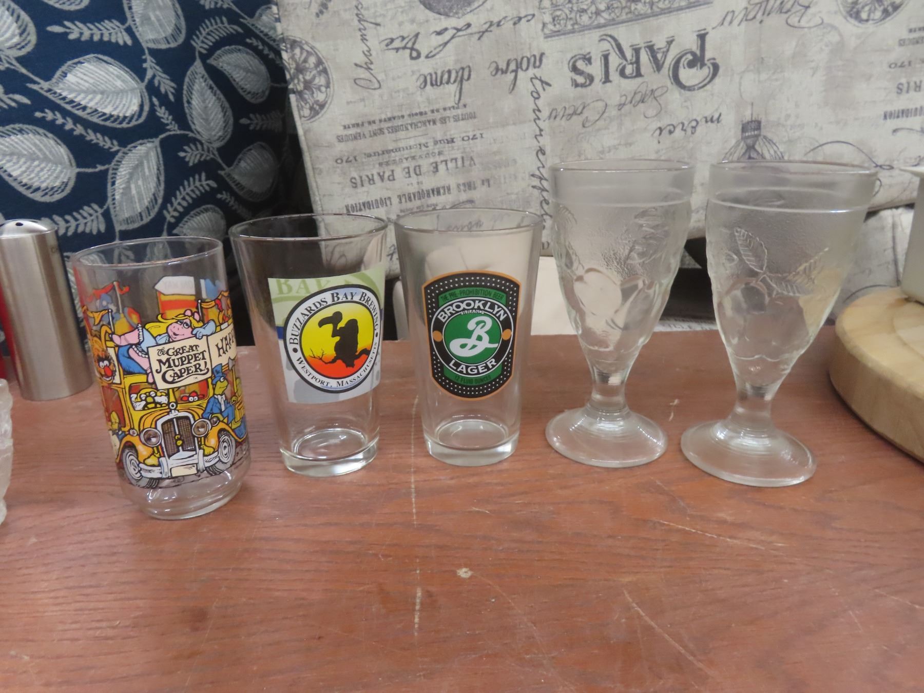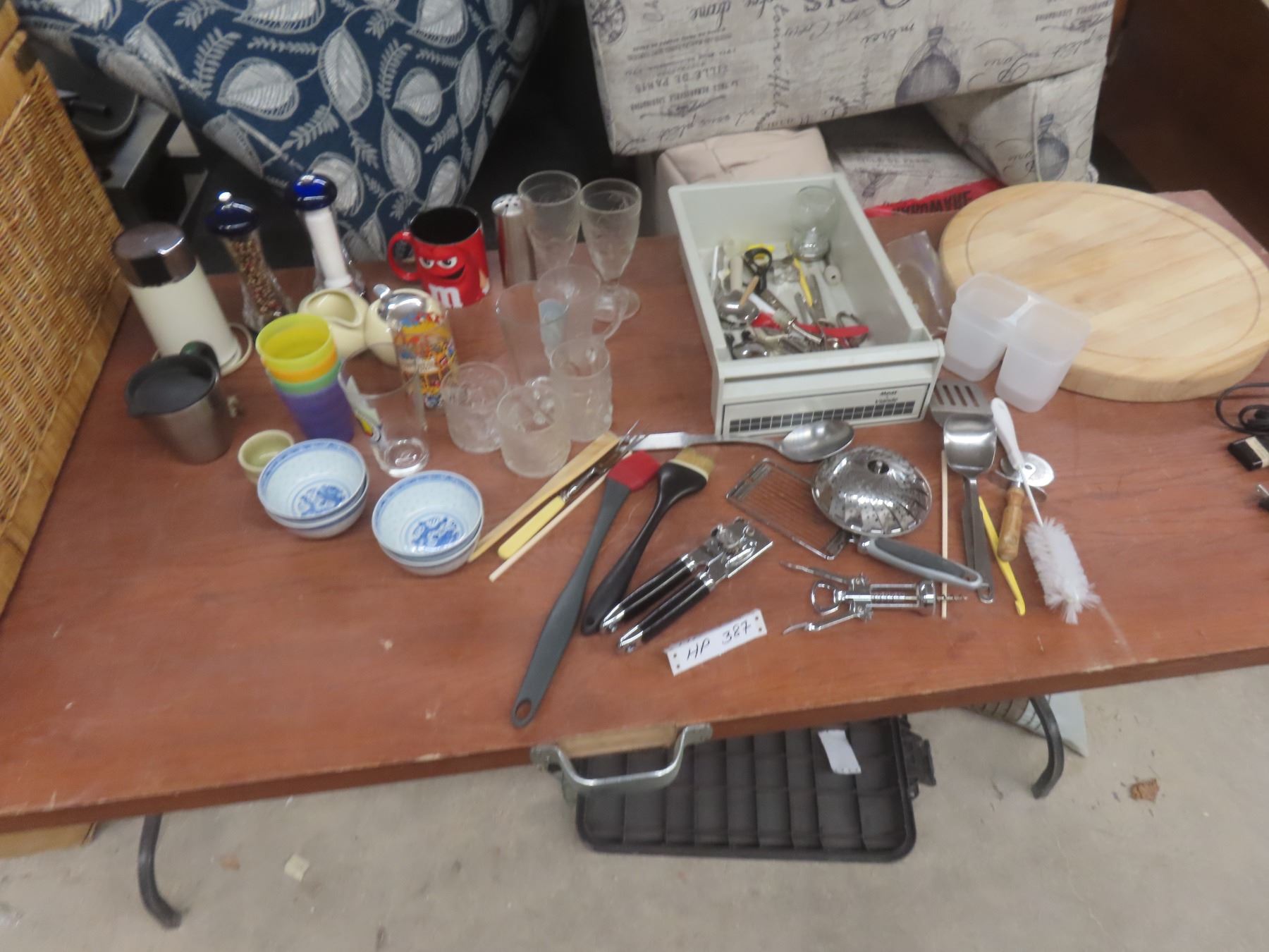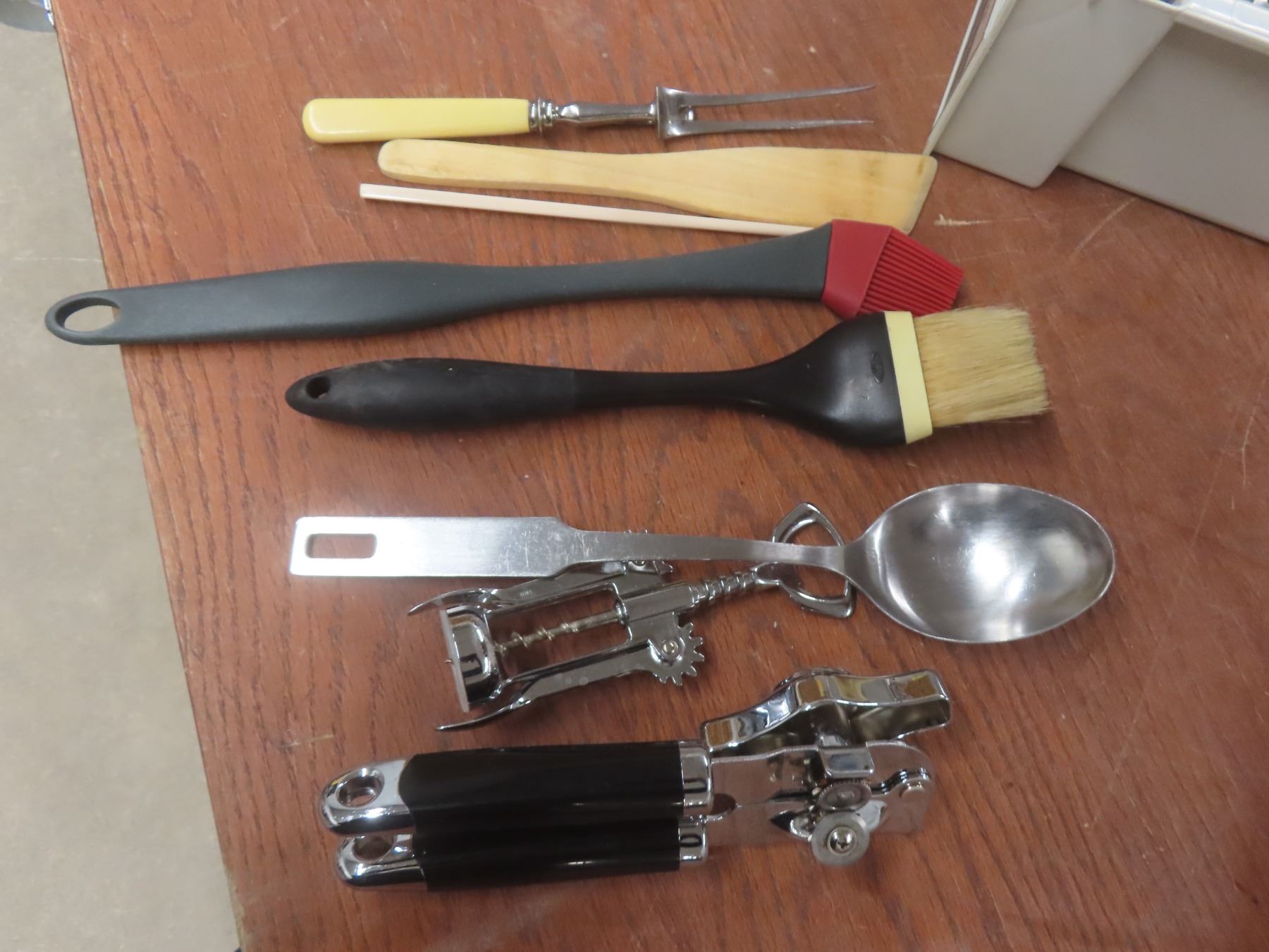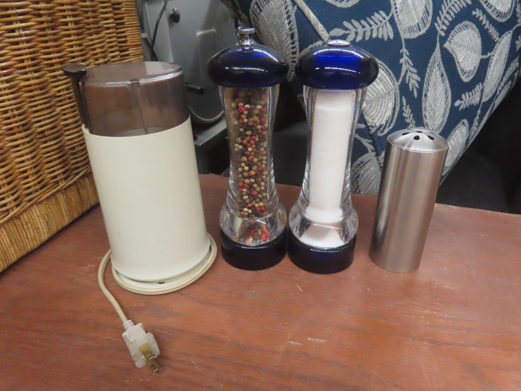 18" Wooden Cutting Board, Coffee Grinder, Salt And Pepper Shakers, Glassware, And Kitchen Utensils.