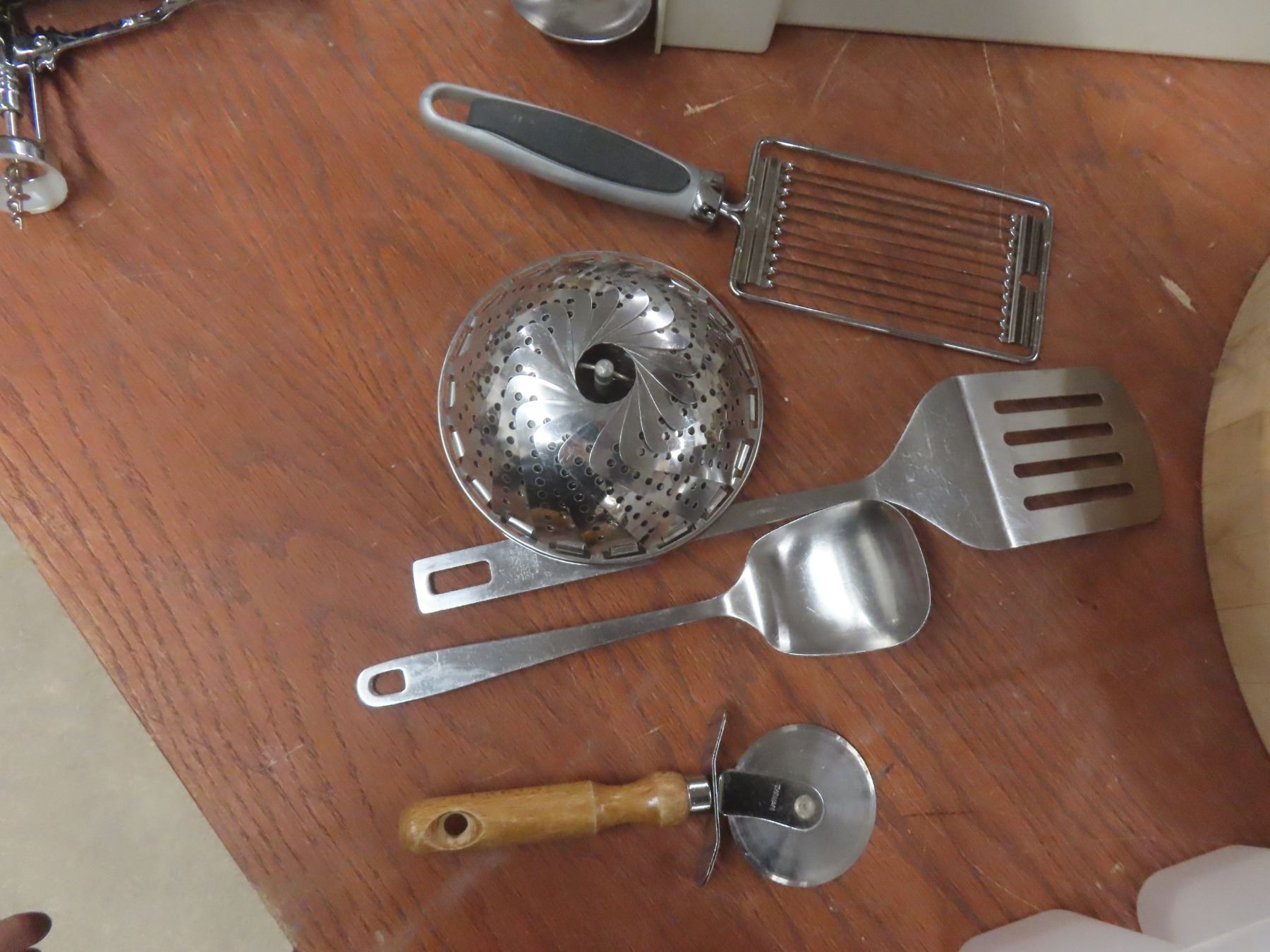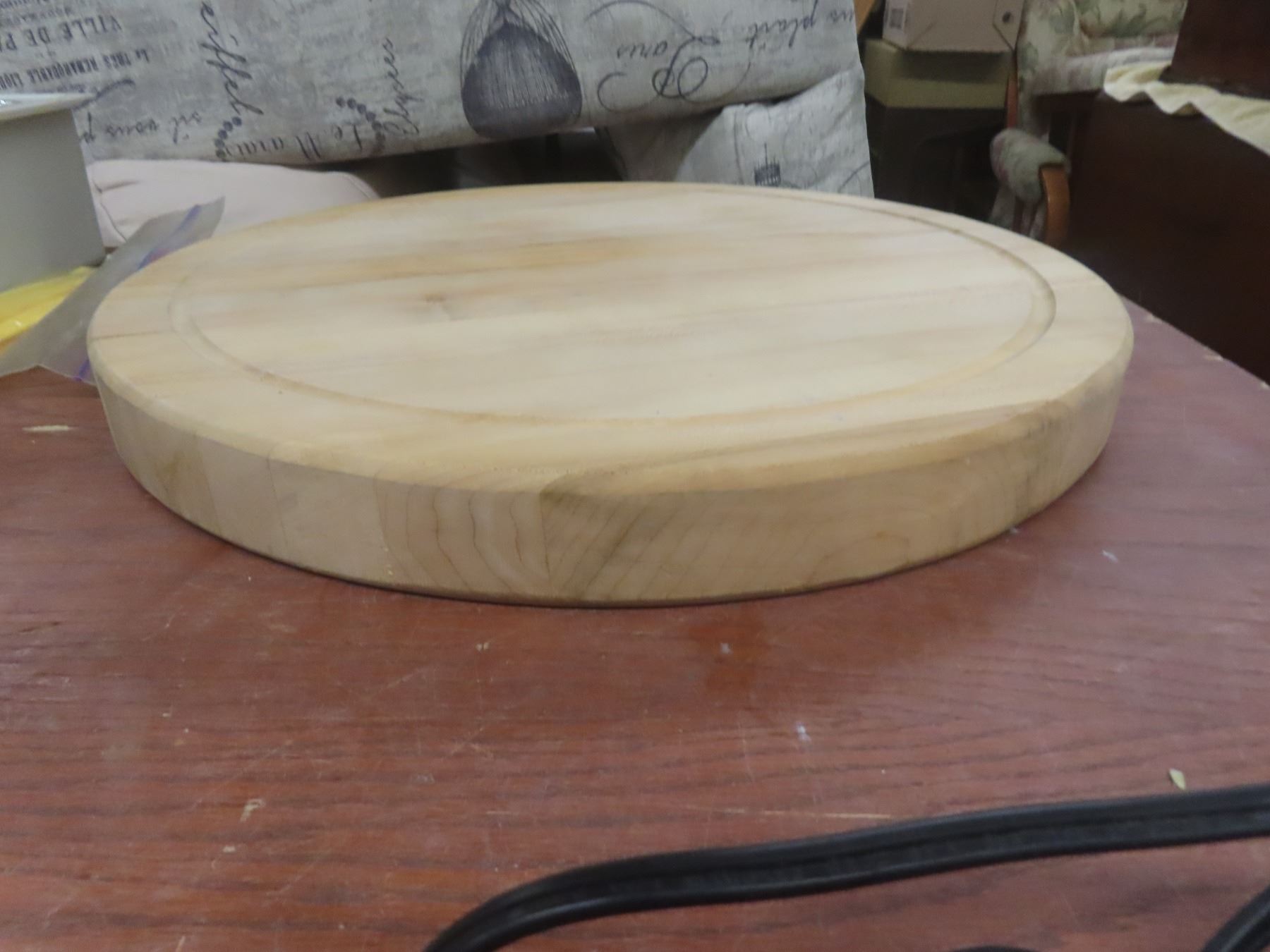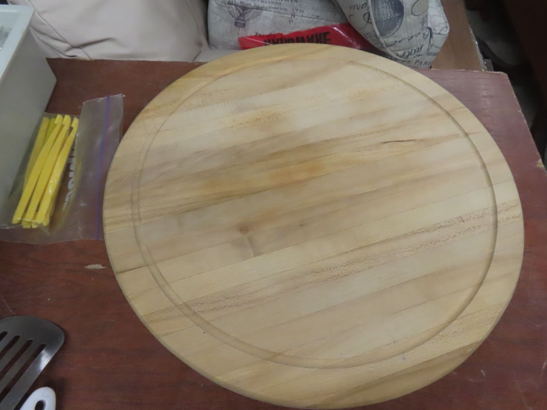 18" Diameter Wooden Cutting Board, Coffee Grinder, Salt And Pepper Shakers, Glassware, And Kitchen Utensils.