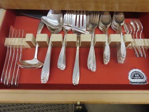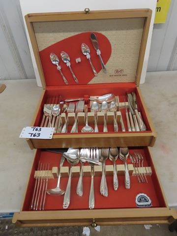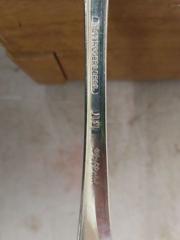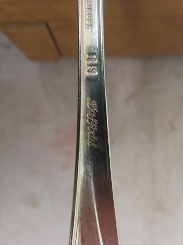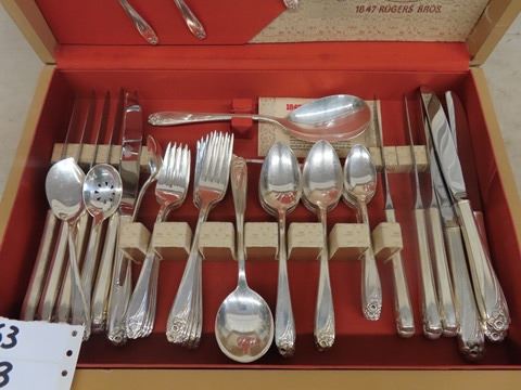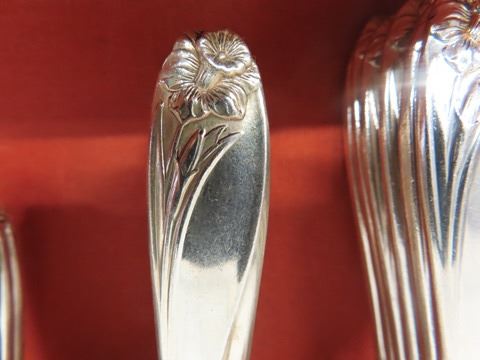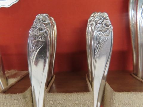 1847 Rogers Flatware Silverplate 1950's Floral DAFFODIL - 106 Pcs. Some of the forks have a slight mark on the far-left tine. Otherwise, beautiful condition: 12 knives, 8 oval soup spoons, 11 table spoons , 13 salad forks, 13 dinner forks, 28 teaspoons, 3 serving spoons, 4 sugar spoons, 5 small butter knives, pie server, 1 pickle fork,1 jelly spoon, meat fork, gravy ladle, pierced serving spoon, large butter knife, large serving spoon, 2 smaller pierced spoons