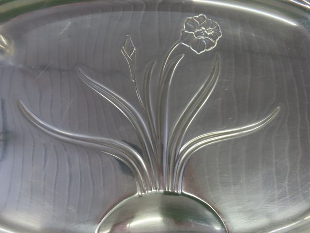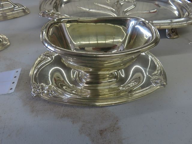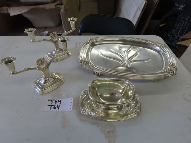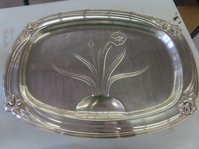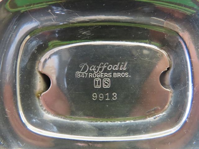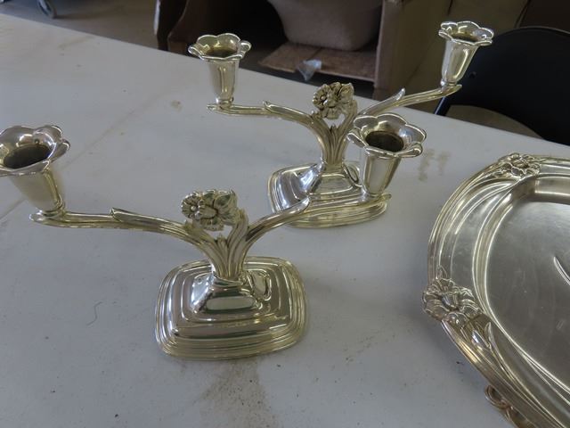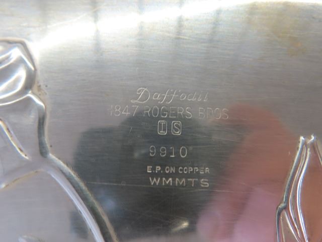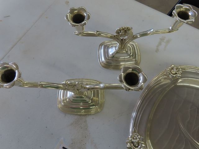 1847 Rogers Flatware Silverplate 1950's Floral DAFFODIL – 4 large Pieces, Including: Two candelabras, Gravy boat with attached plate, Meat carving tray has some scratches from use. These are beautiful pieces
