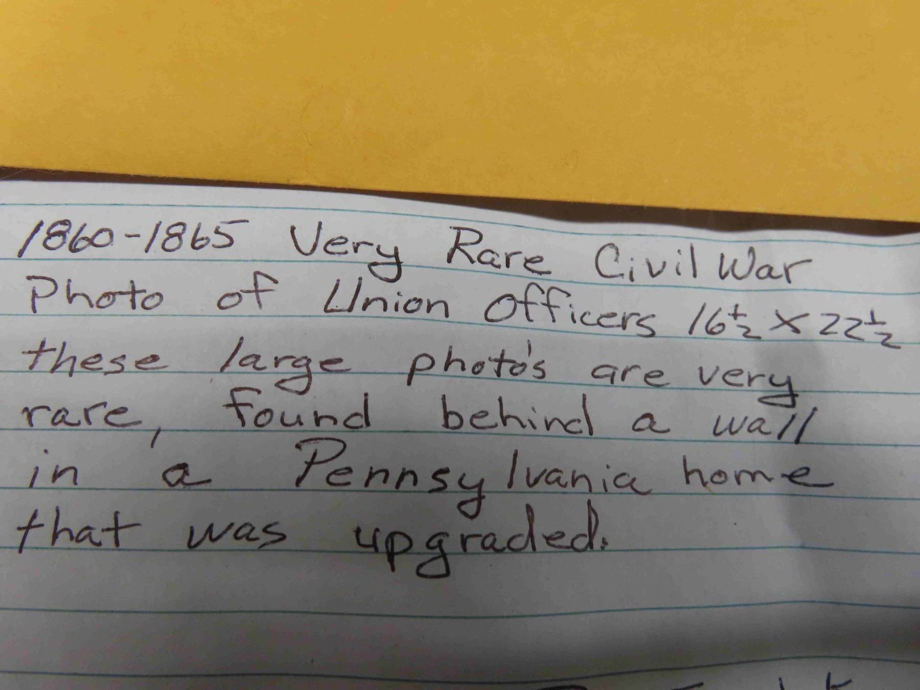 1860-65 Very Rare Civil War Photo of Union Officers 16 1/2'' x 22 1/2'' , These Large Photos are Very rare, Found Behind a Wall in Pensylvania Home That Was Upgraded, Uniform Brass Button and Photo