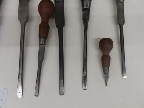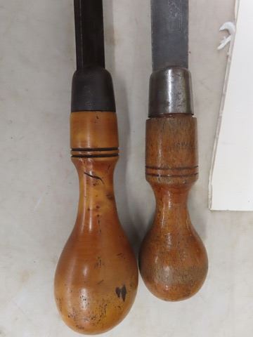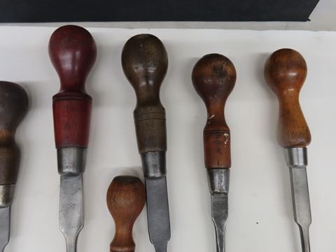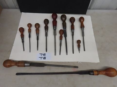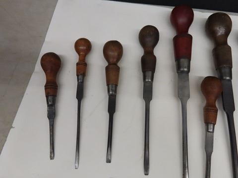 19 Antique Cabinet Screwdrivers, graduated in size. All wooden handled - most from the early 20th century. Very Good Condition with a couple of handles cracked but still very usable. Makers marks include T CLIFFE & Co.; CROSS GROUND; F. Woodcock, Sheffield; Shelby; Robbi Sorby, Sheffield; Tormo; are the ones that legible.