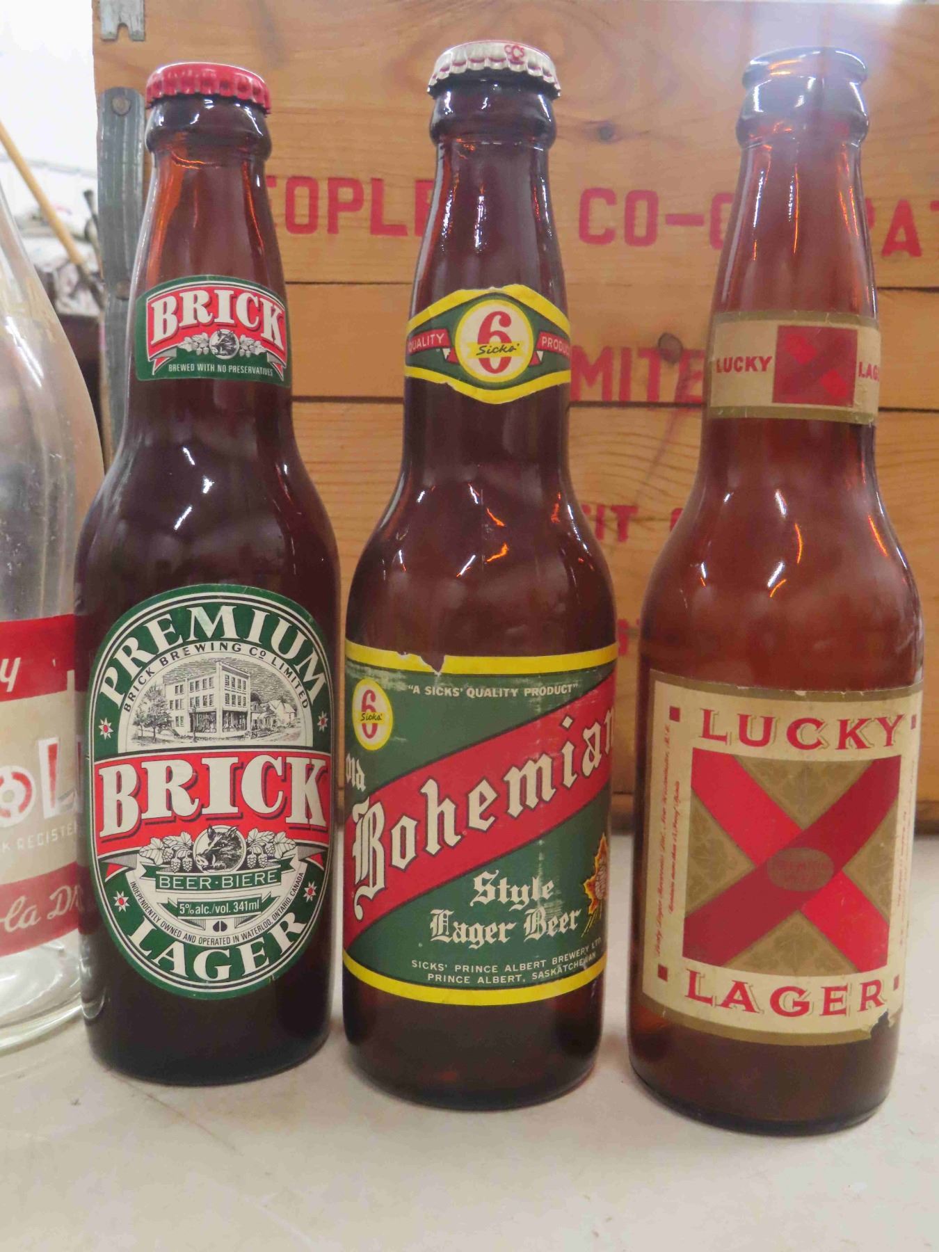 19 Beer and Soda Bottles : Beach Brew, Kings Beer, Lucky , Bohemian, Plus & Peoples Coop Crate 14'' x 14'' x 11''