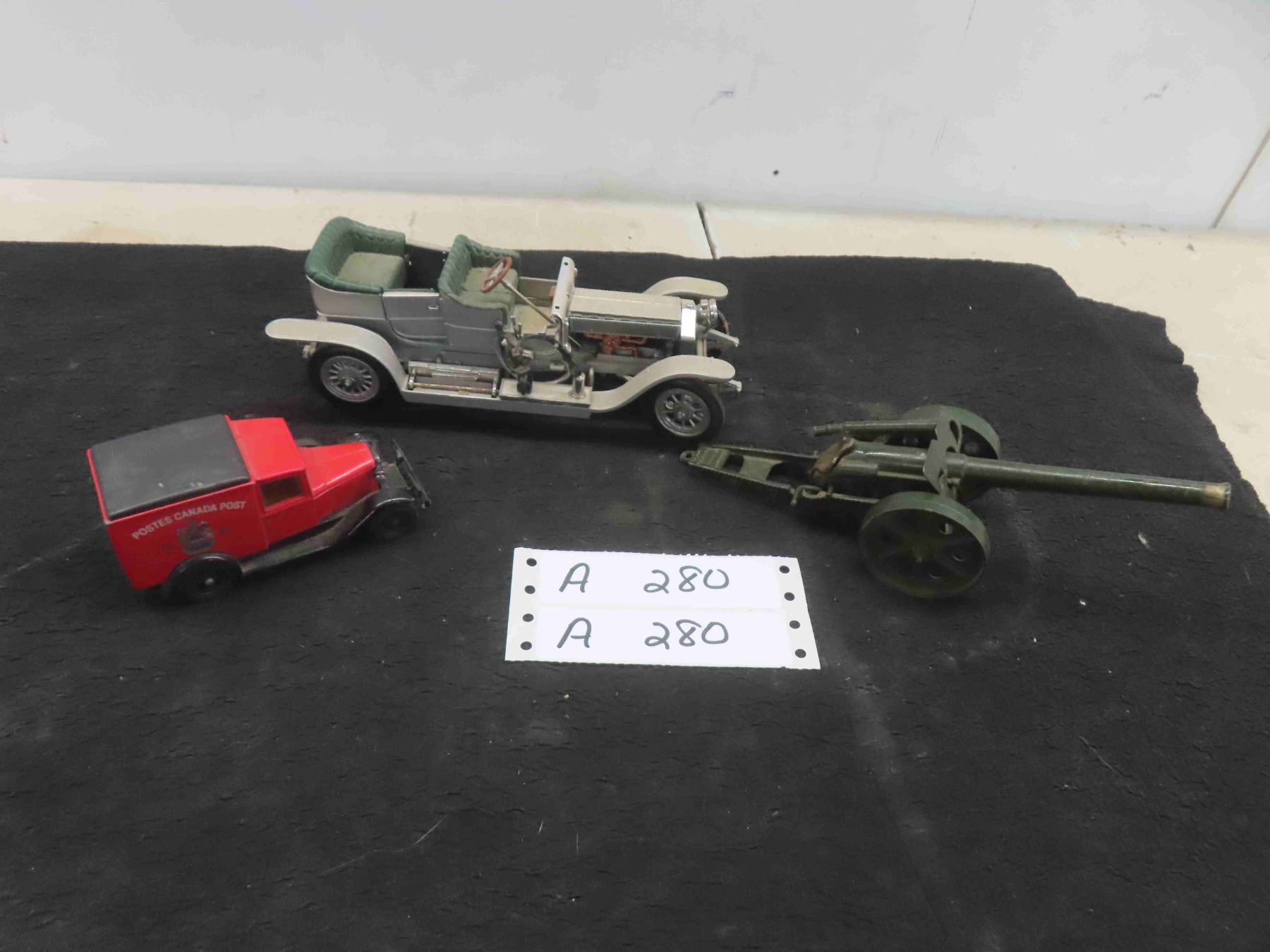 1907 Rolls Royce from Franklin Mint Precision Models 8'' x 3'' x 3'' , Matchbox Canada Post Truck, Britains Cannon Patent 34218/30 Made in England Cap Toy 8'' L