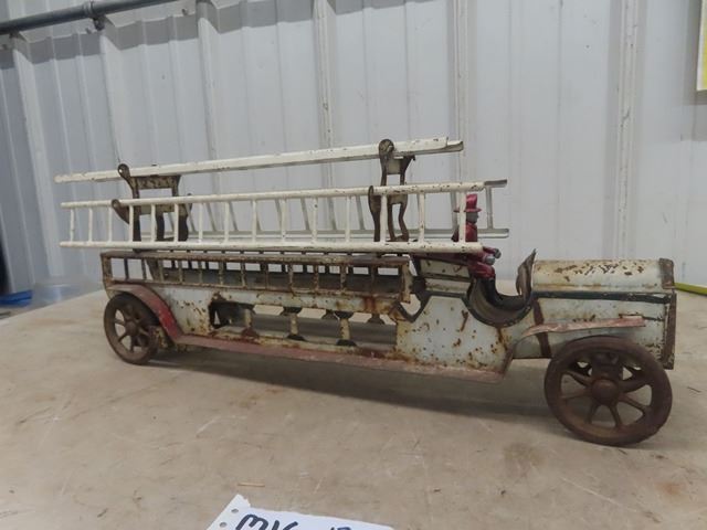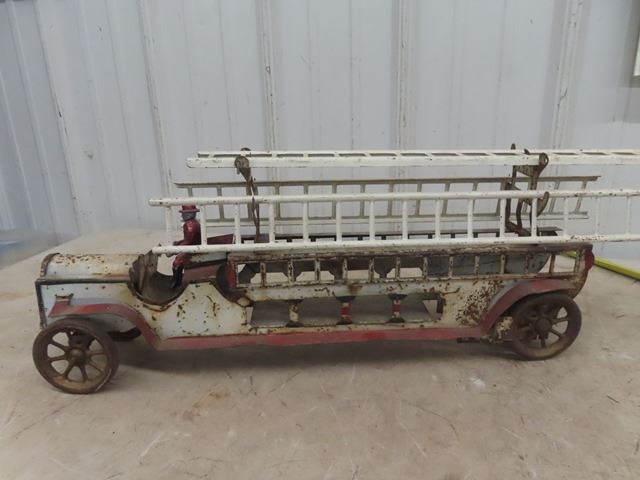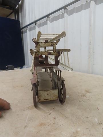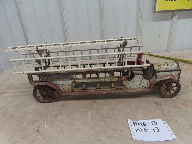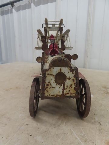 1914 era Schieble Pressed Metal Firetruck with ladder and driver