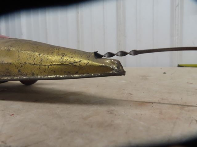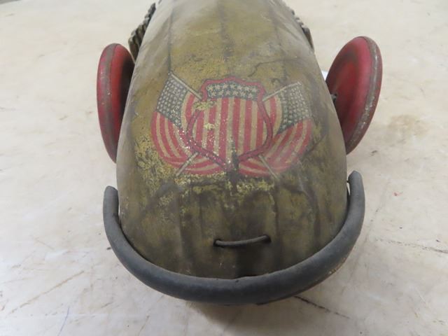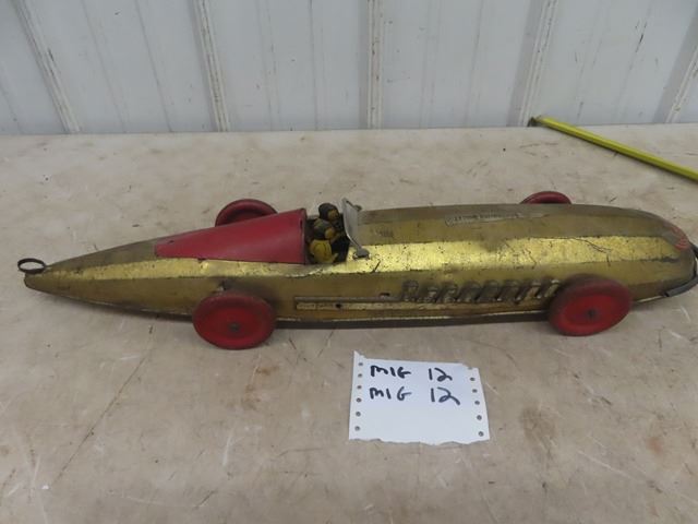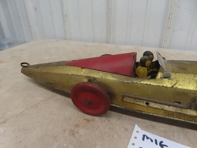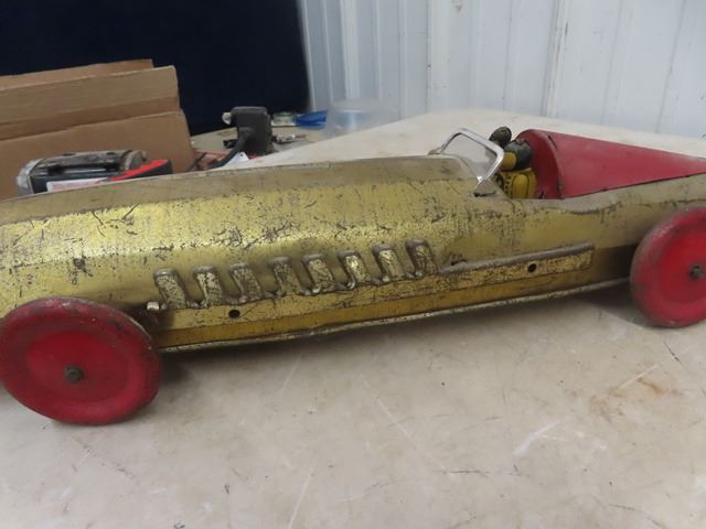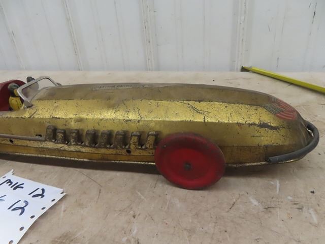 1920 Buffalo Silver Bullet Pressed Metal Racecar with pull out wind up working gold in color 26" long