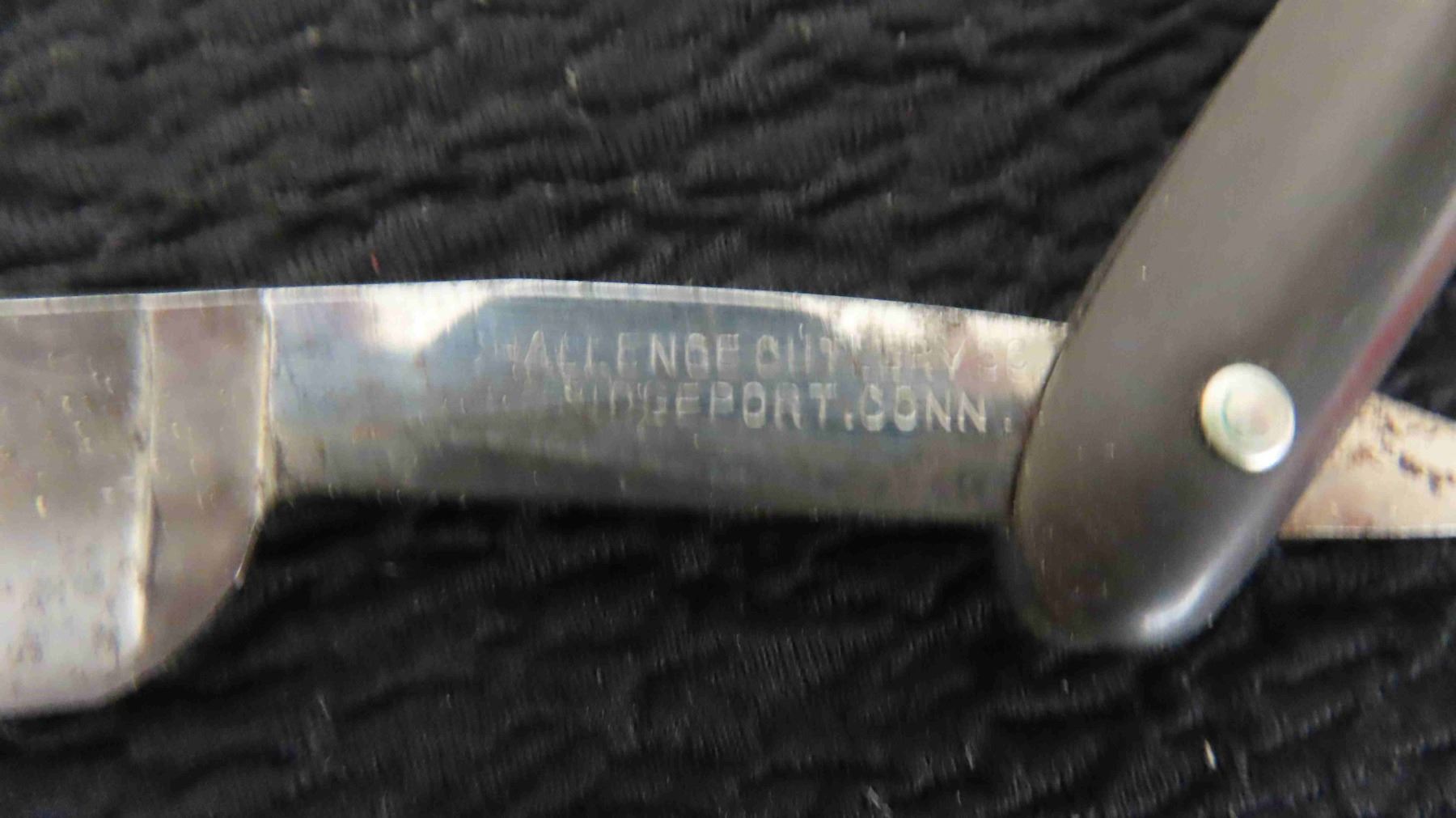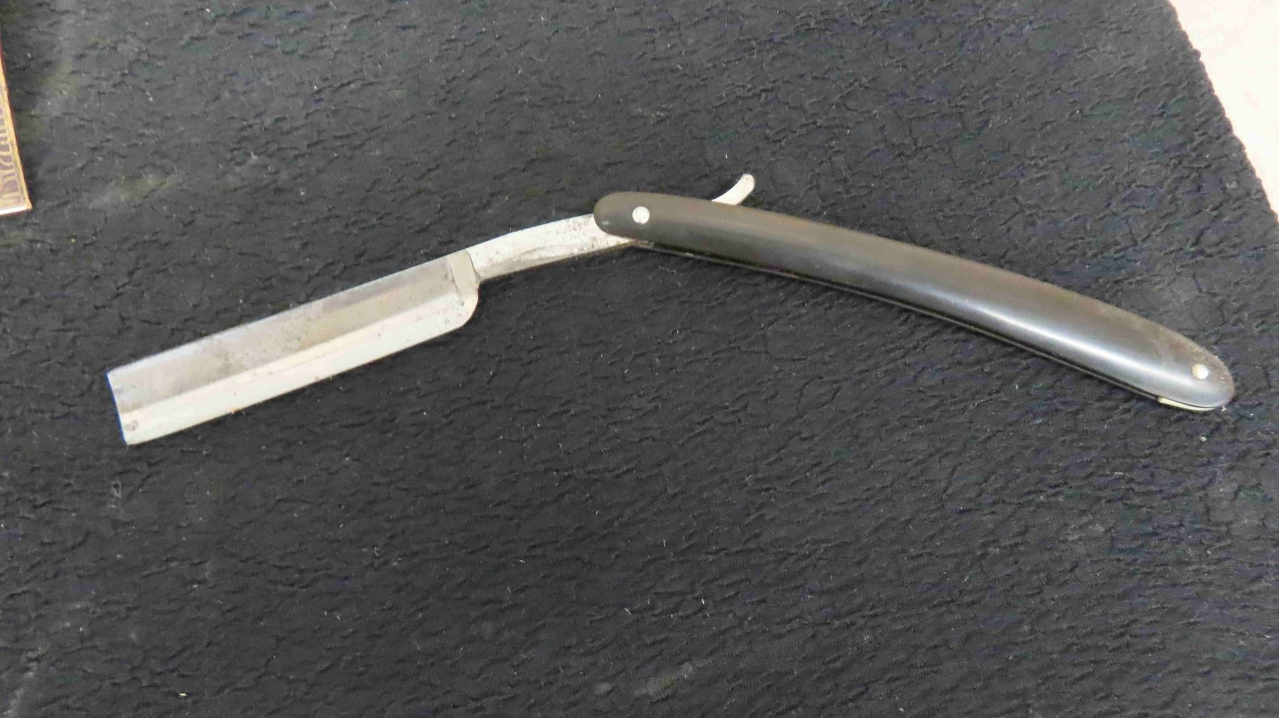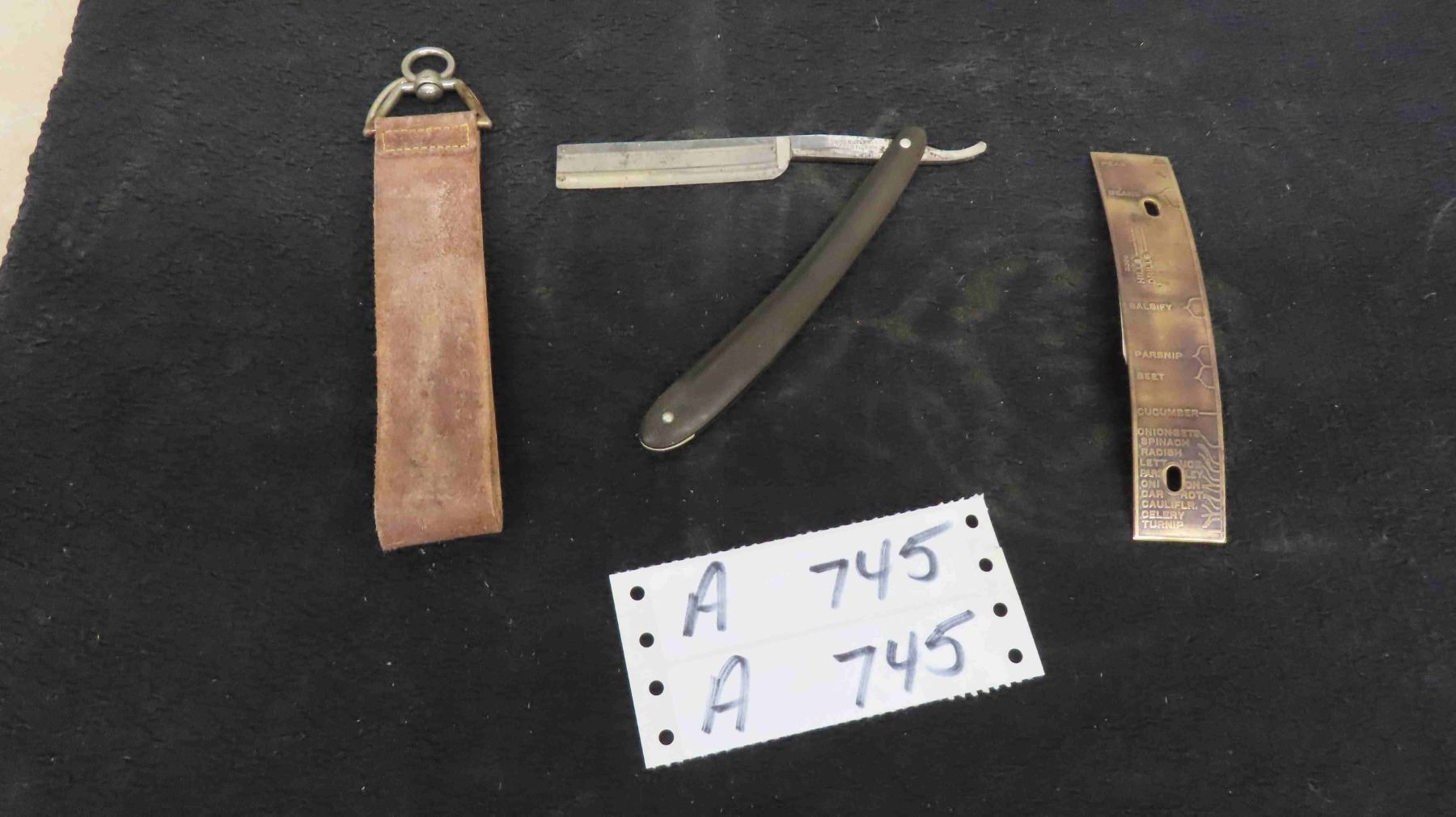 1930s Bakelite Straight Blade and Strop, Brass Plate from a Veggie Seeder