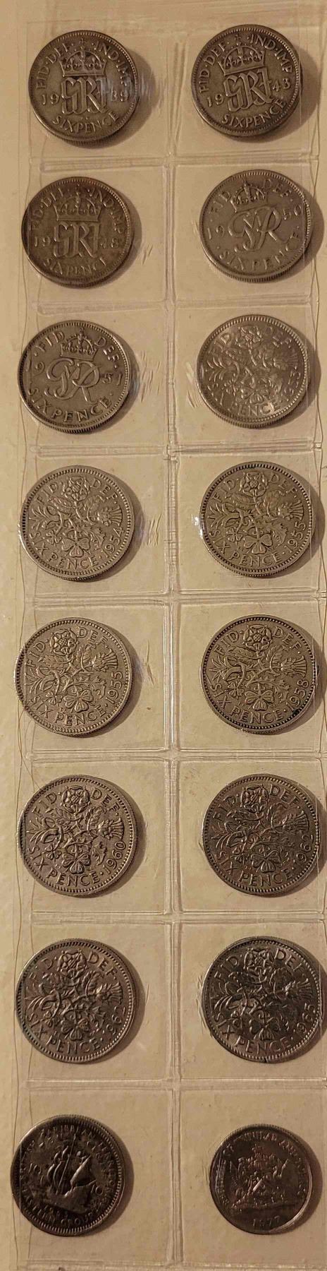 1939 (50% silver), 1943 (50% SILVER), 1948, 1950, 1951,1953, 1954, 1955, 1955, 1958, 1960, 1962, 1962 & 1965 U.K. six Pence plus 1 1955 10 cent British Caribbean Territories Eastern Group & 1 Republic of Trinidad and Tobago 10 cent.Nice quality group