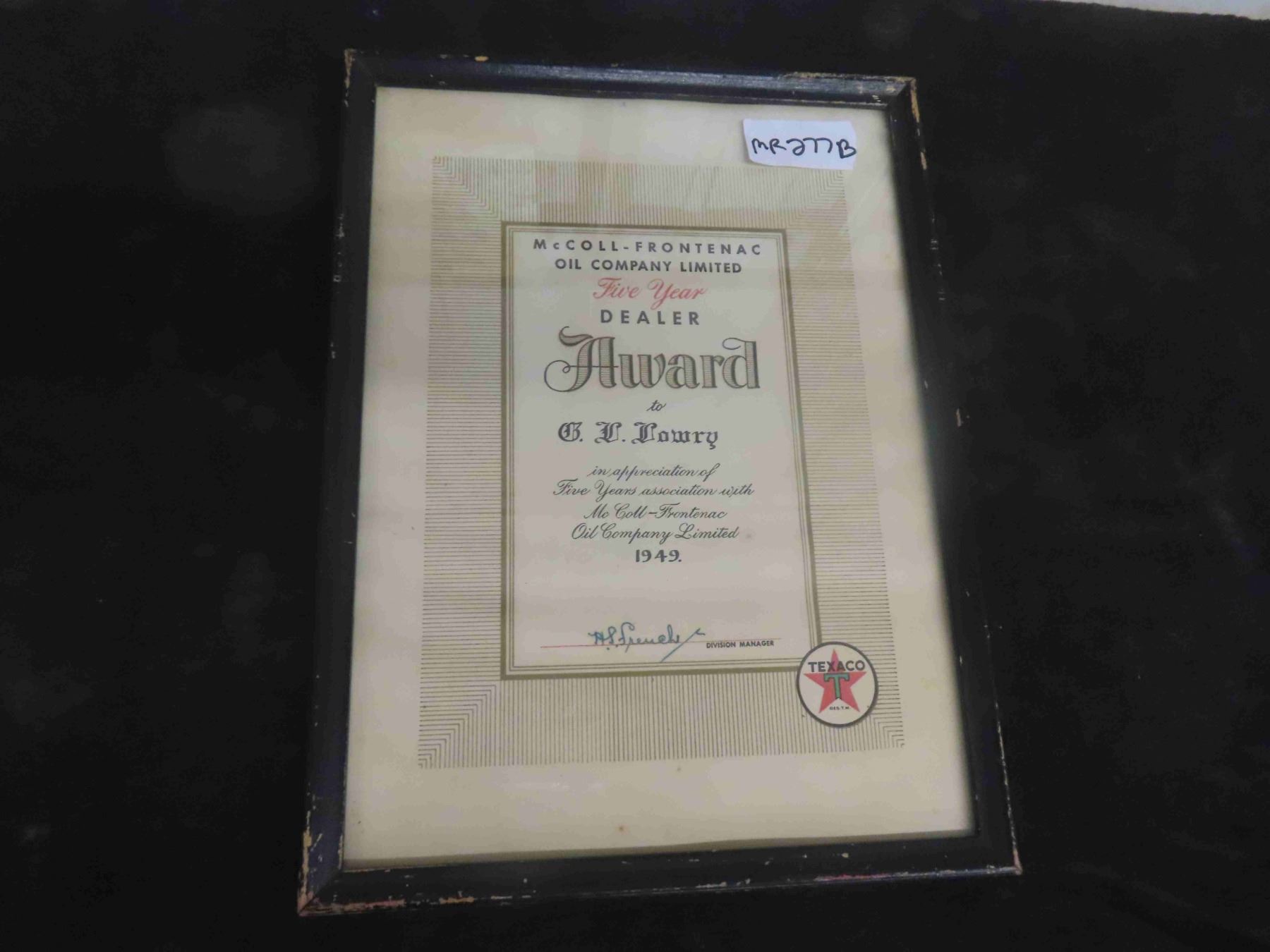 1949 McColl Frontera 5 Year Dealer Award Framed Up 9 1/2'' x 12 1/2''