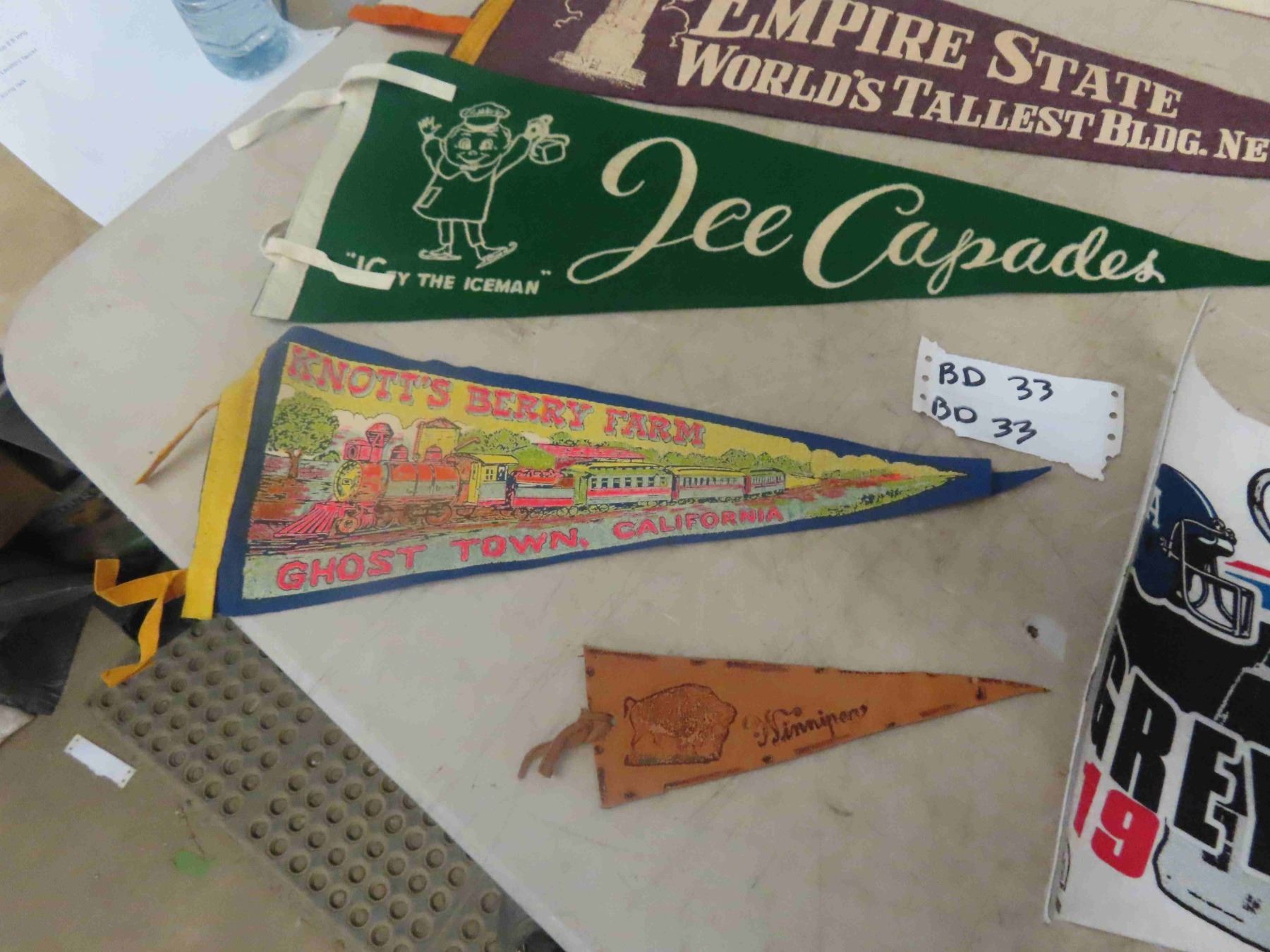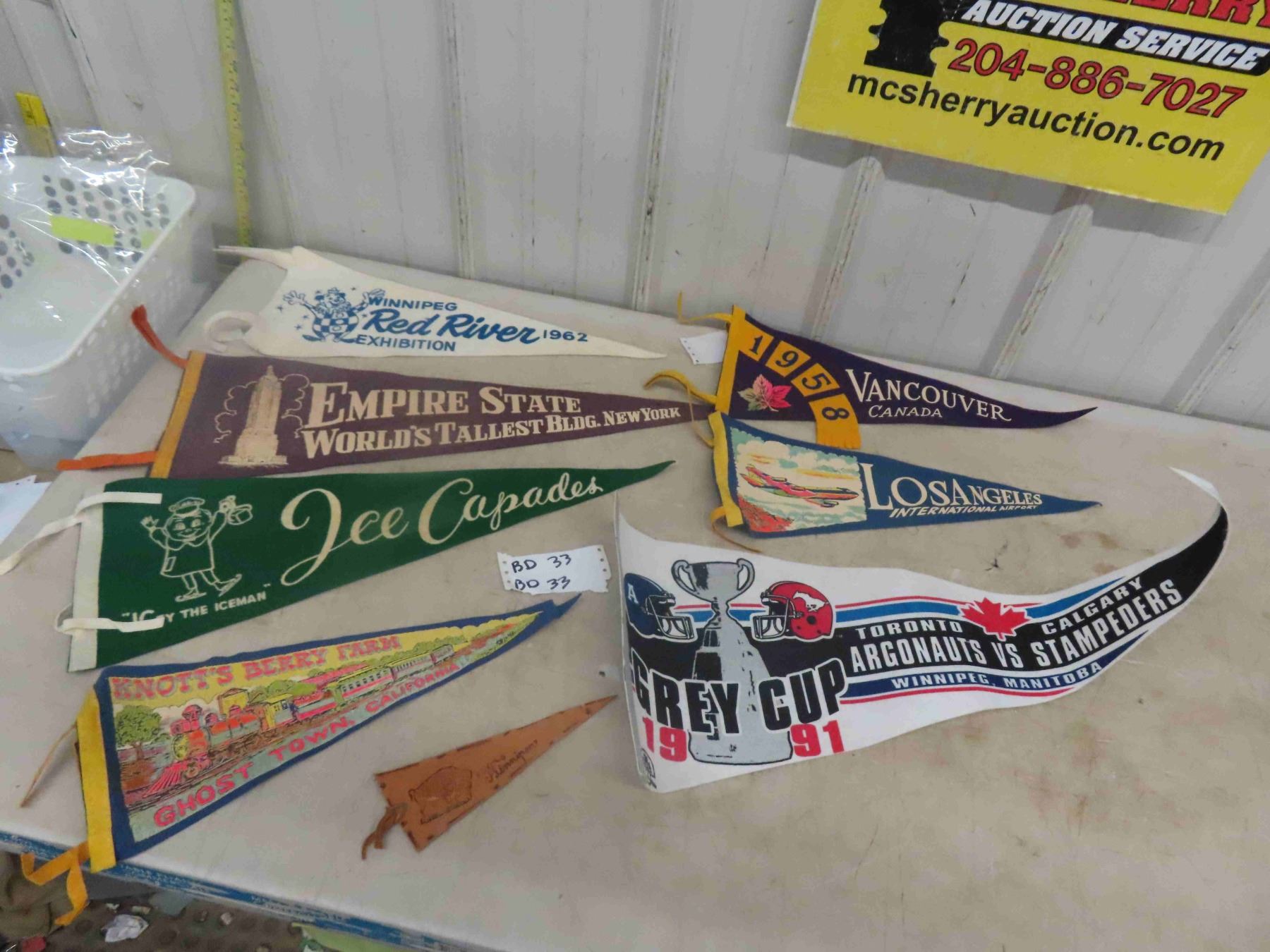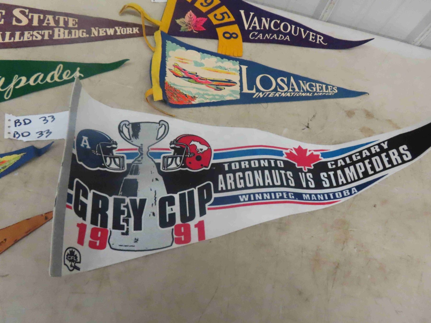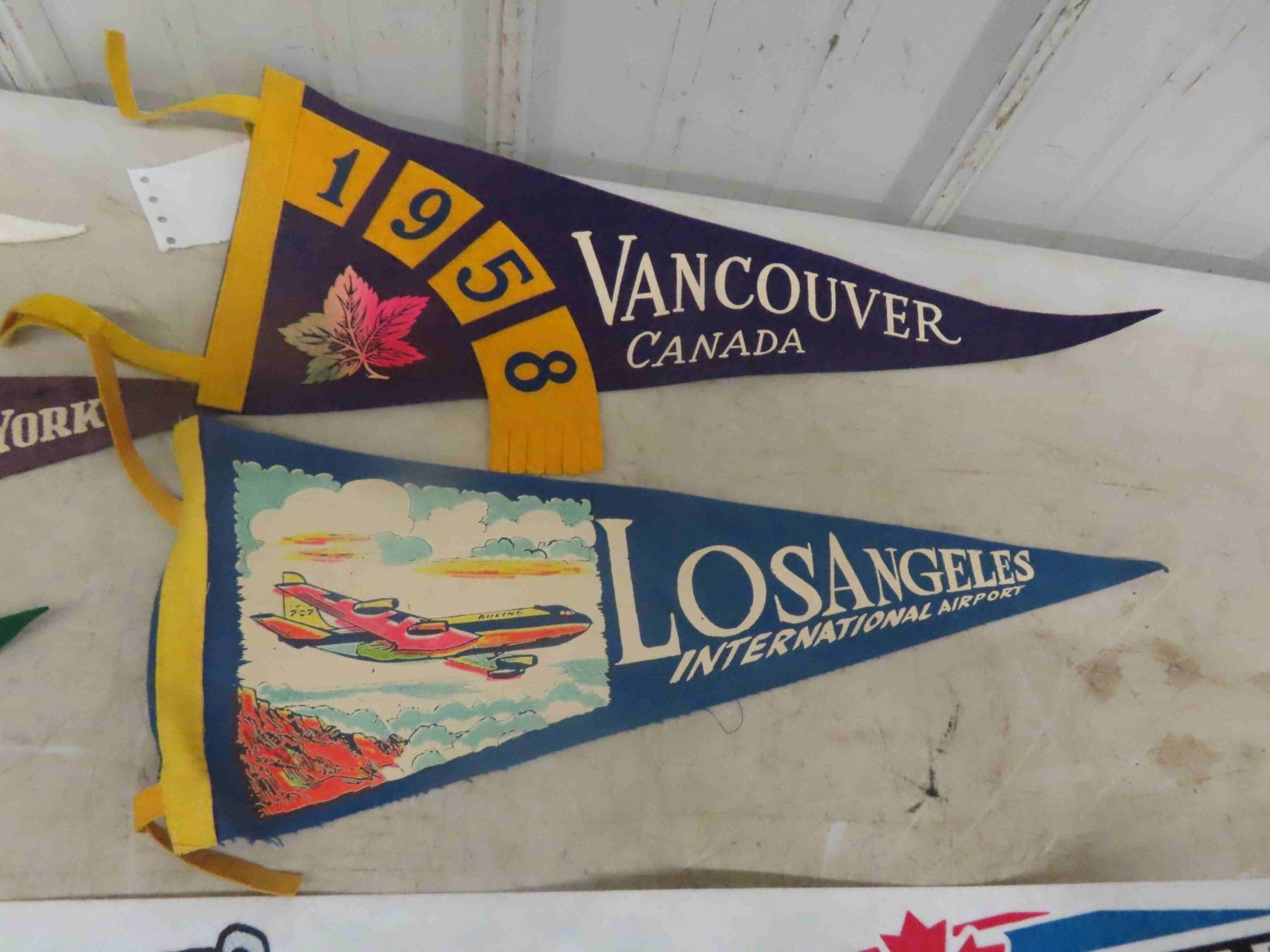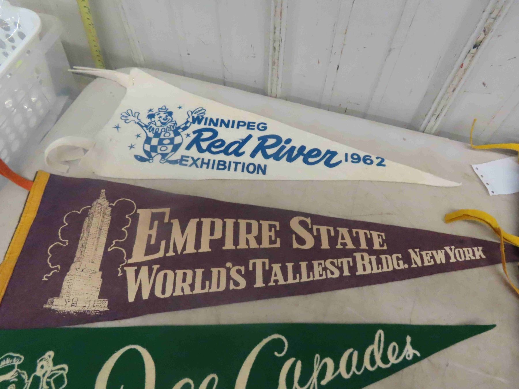 1950's + 60's Felt Pennant Lot ; Empire State Bldg., Red River Ex, Ice Capades, Knotts Berry Farm, 1958 Vancouver, Los Angeles Airport & Leather Pennant + 1991 Grey Cup