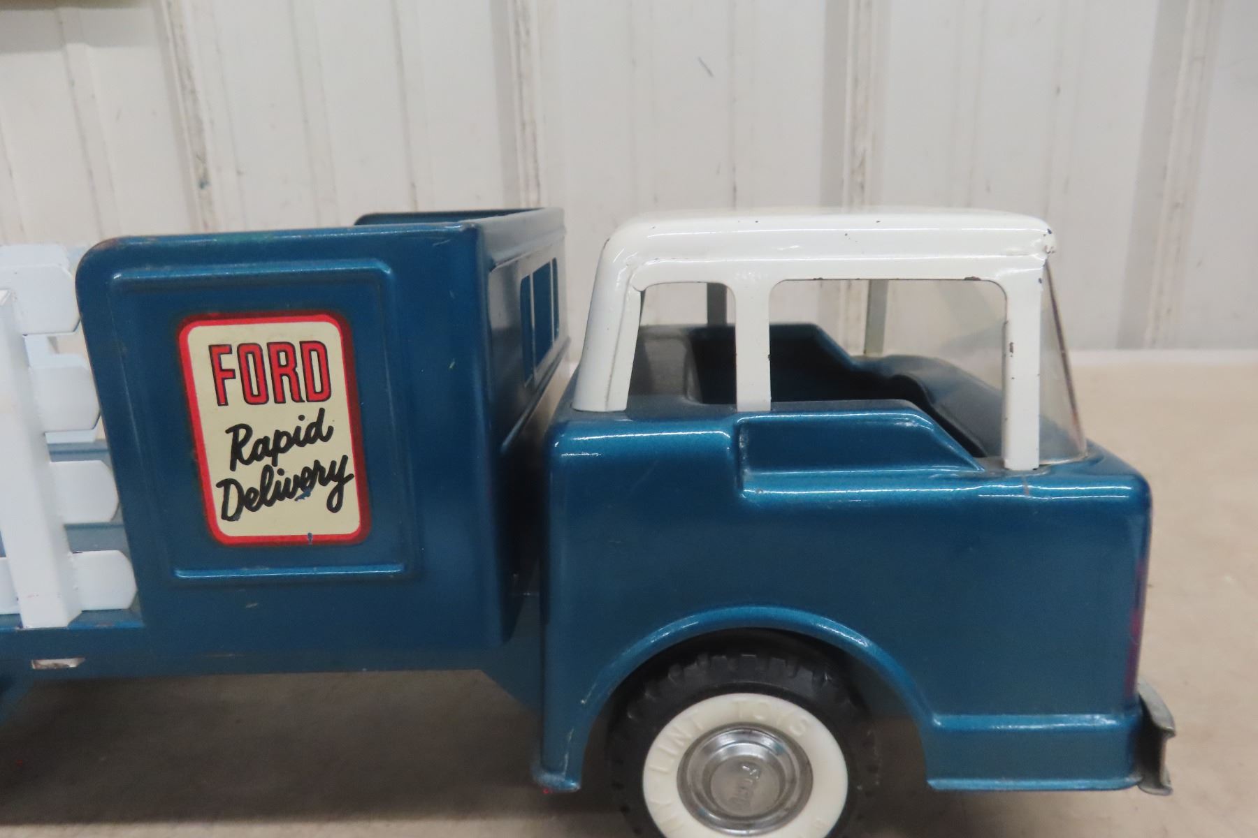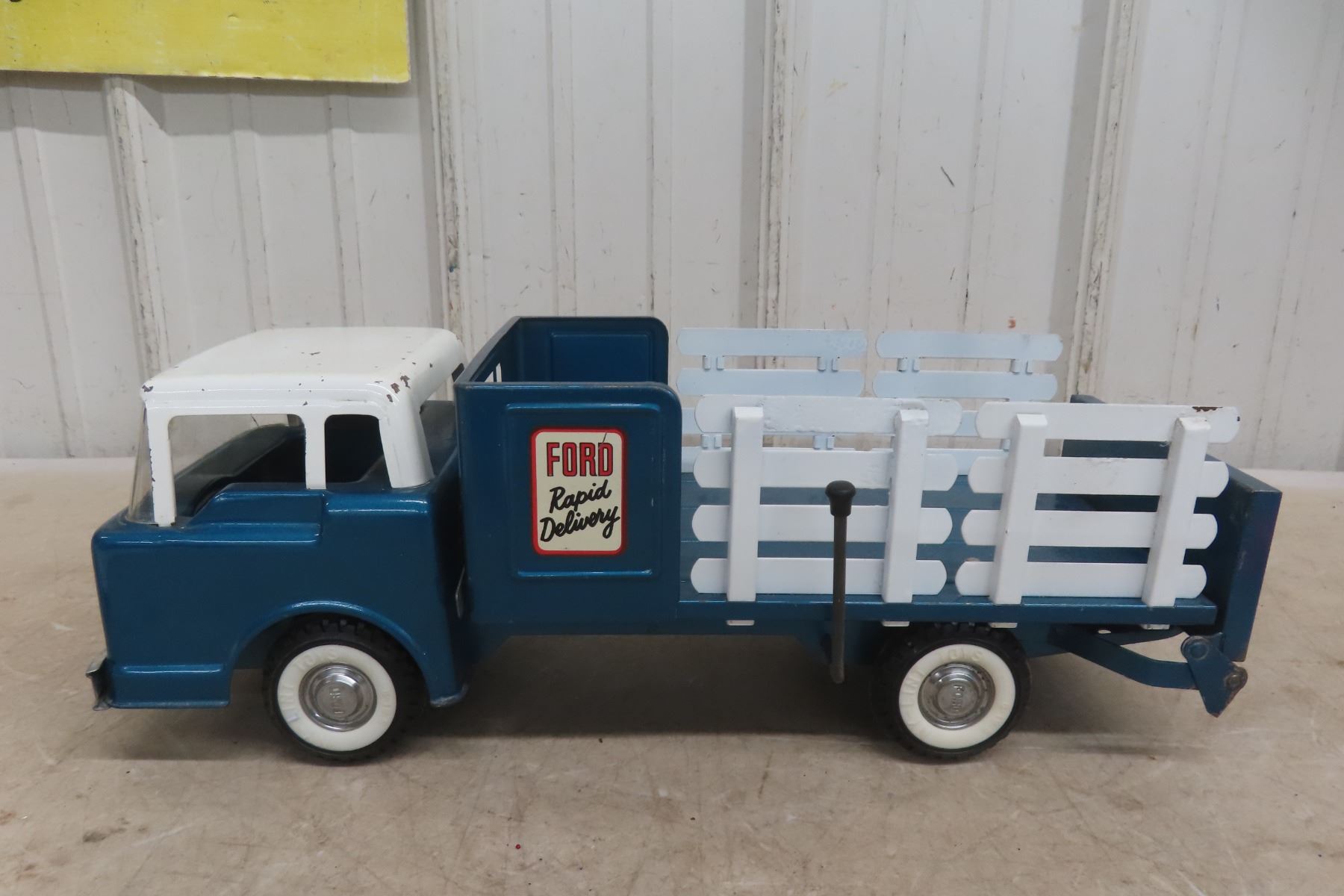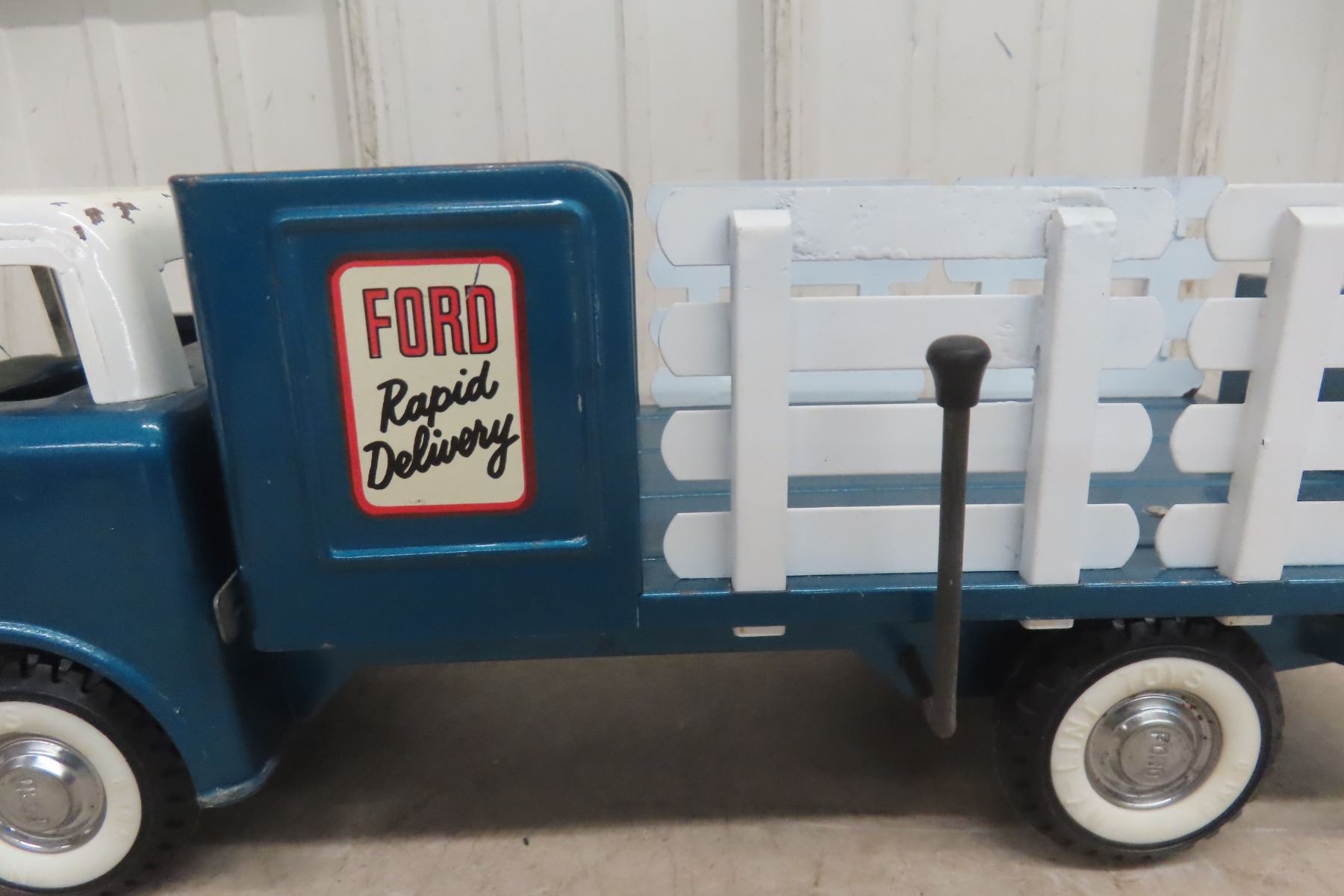 1960s Nylint Ford Rapid Delivery Pressed Metal Truck Stake Body with Power Tailgate 16'' Long