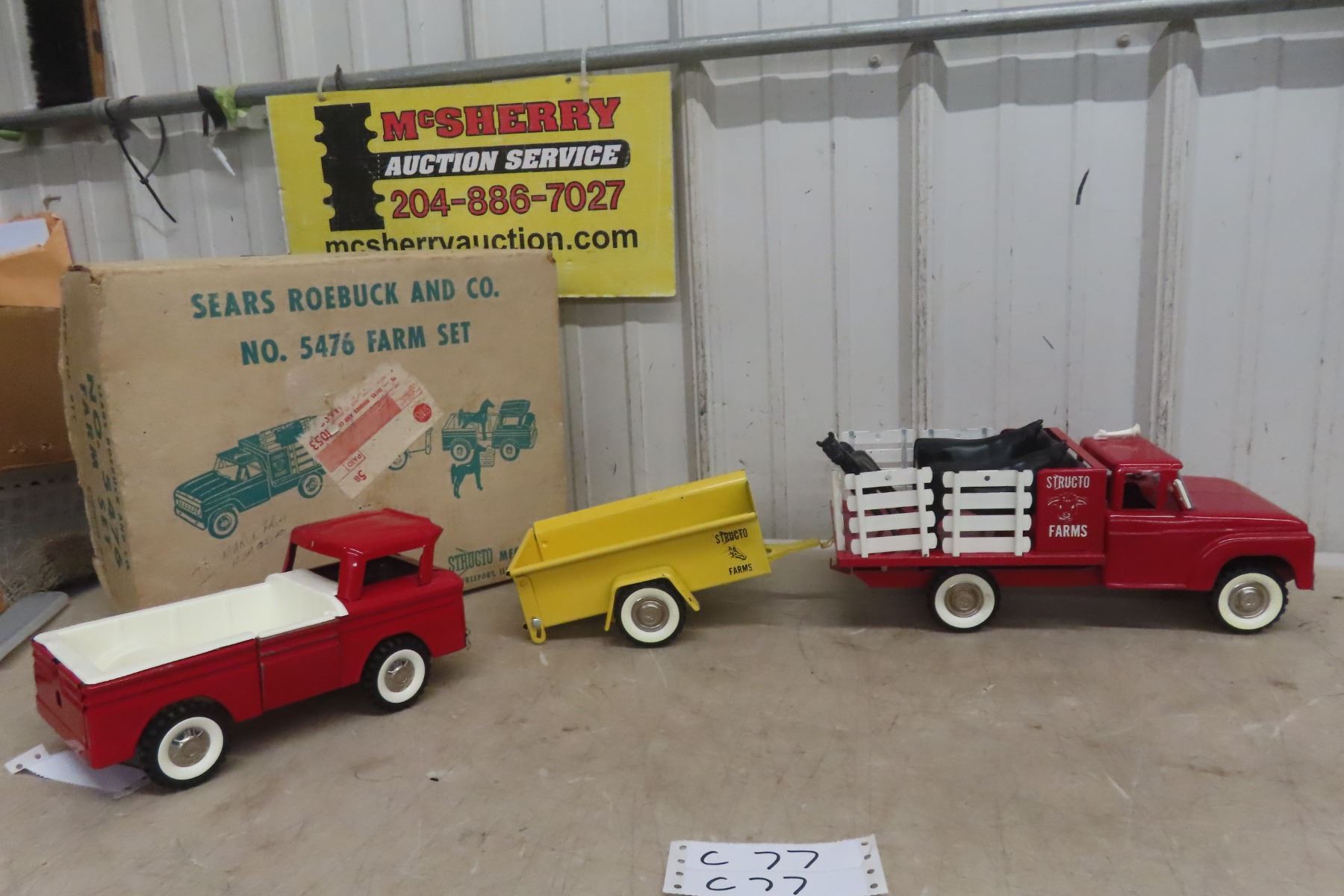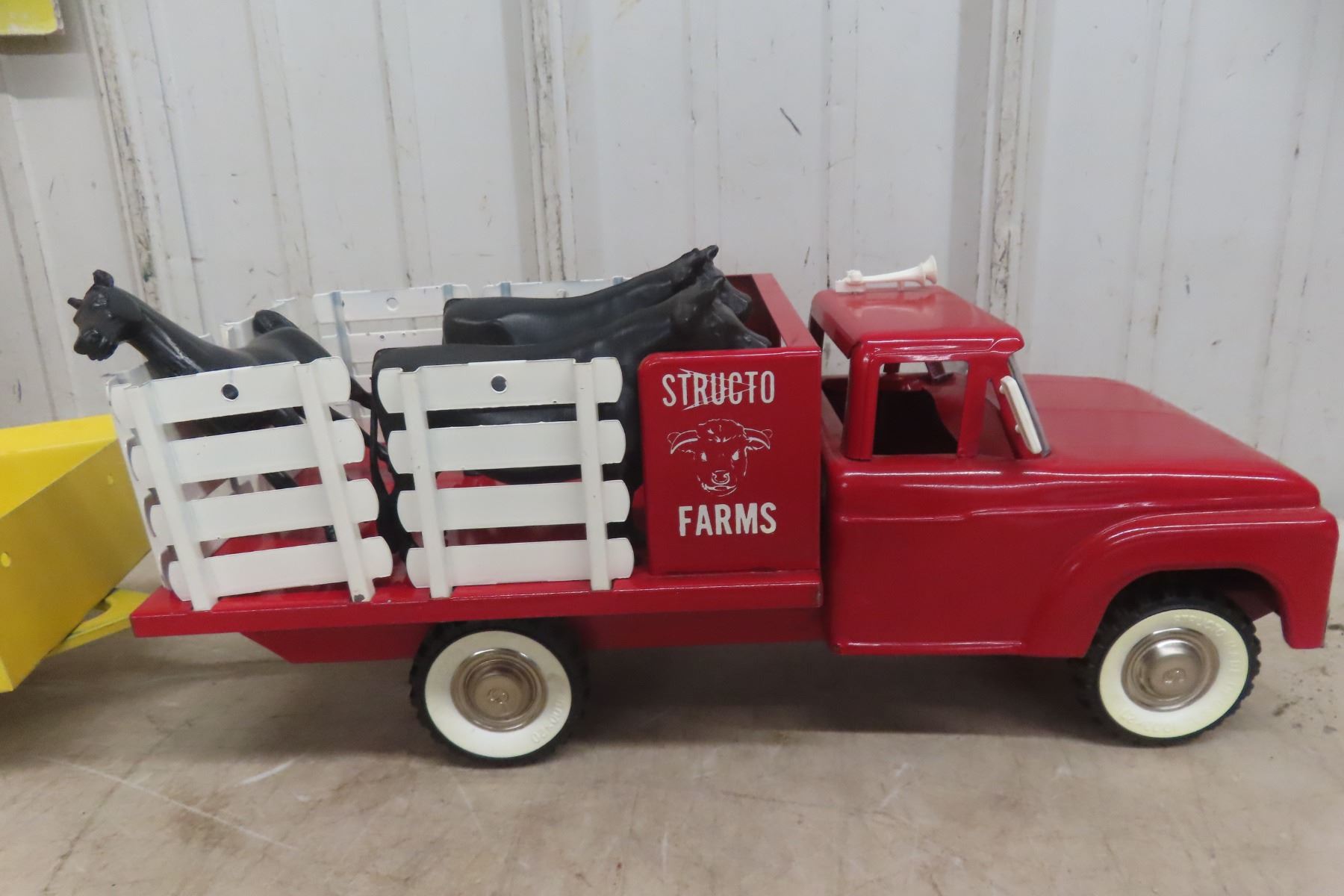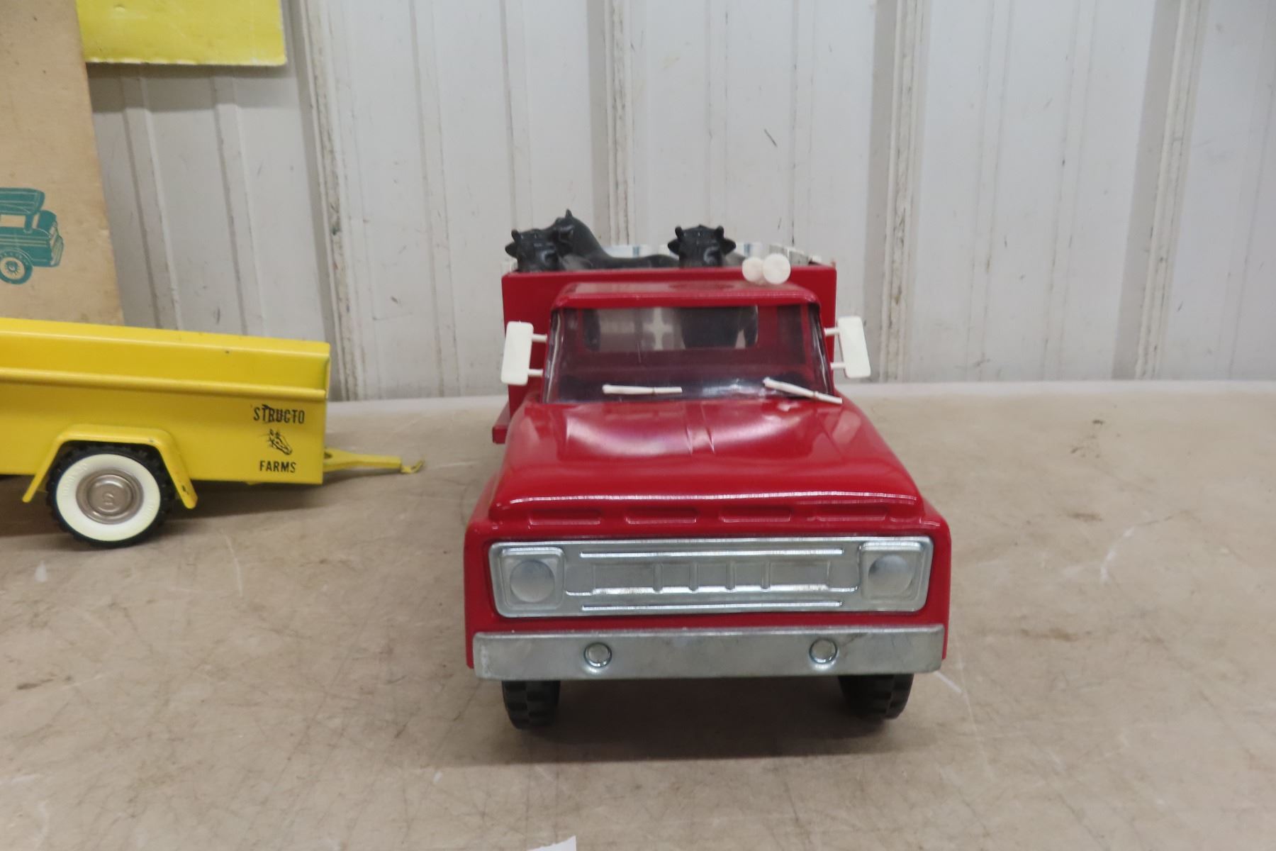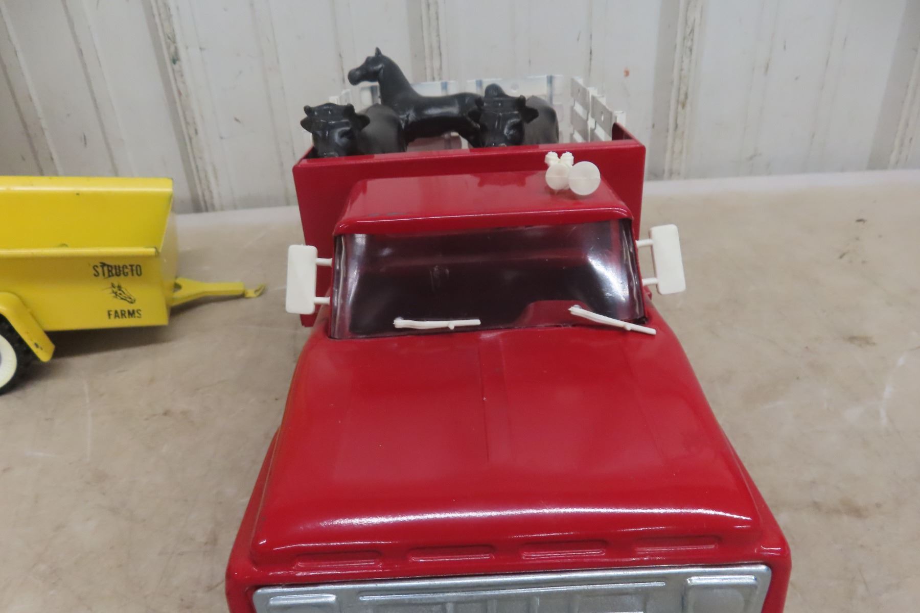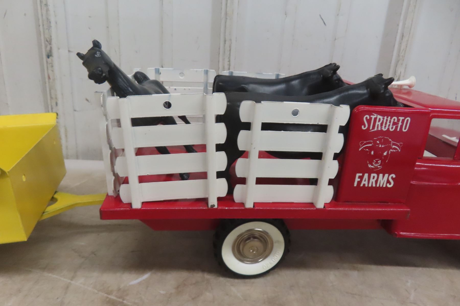 1960s Structo Mfg./Sears Rosebuck No.5476 Farm Set: Stake-Side Pressed Metal Truck 14'' Long, Ramp Side Truck 10'' Long with Trailer 10'' Long, Comes with Cows, Horses & Box.