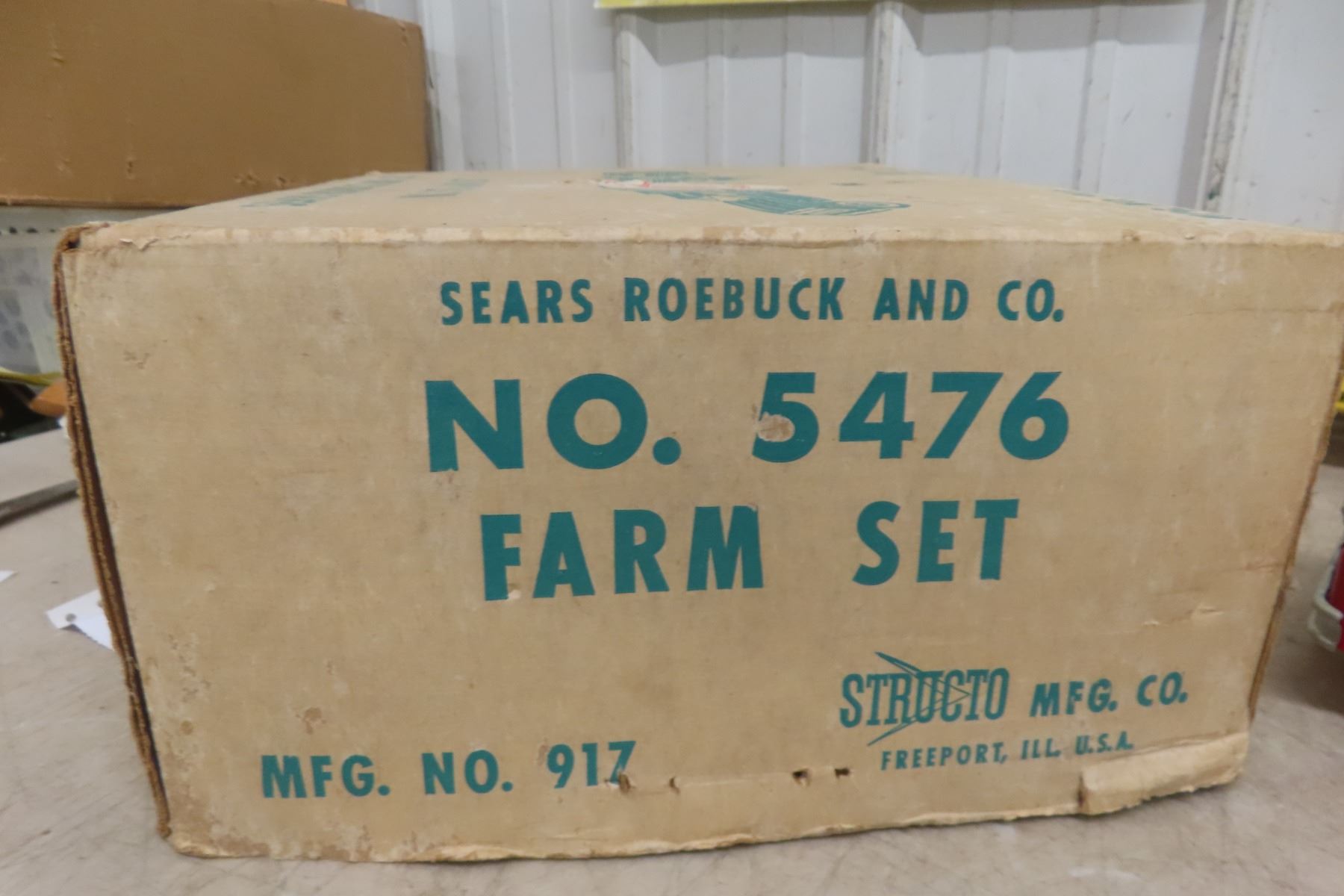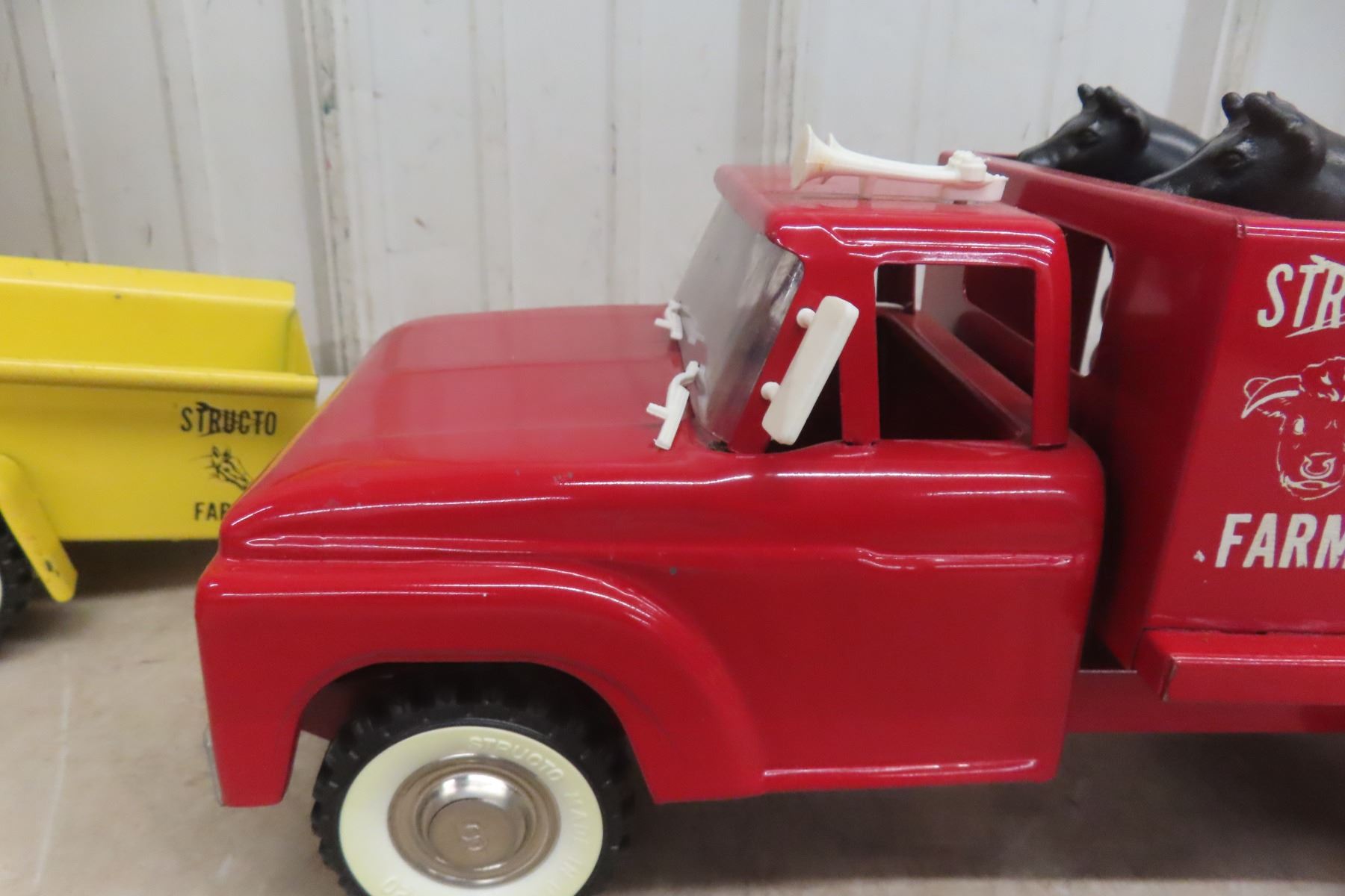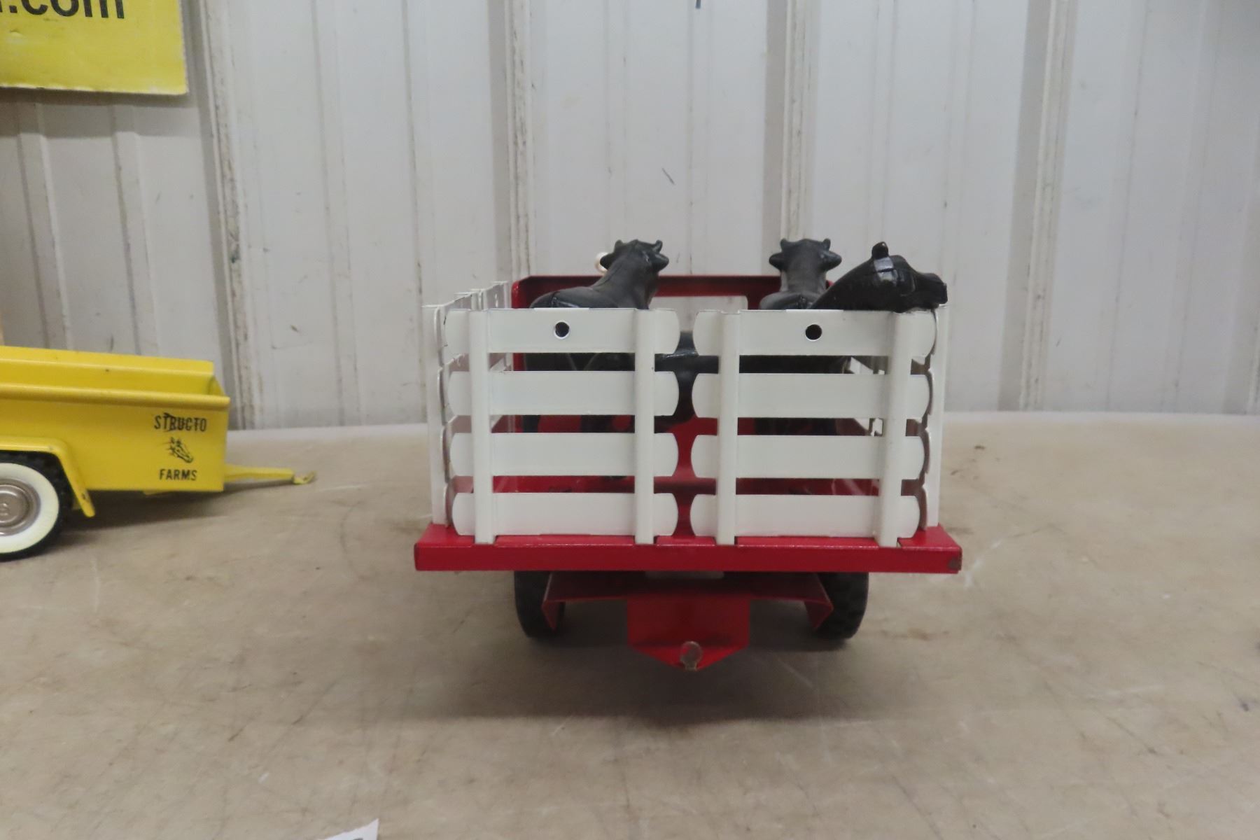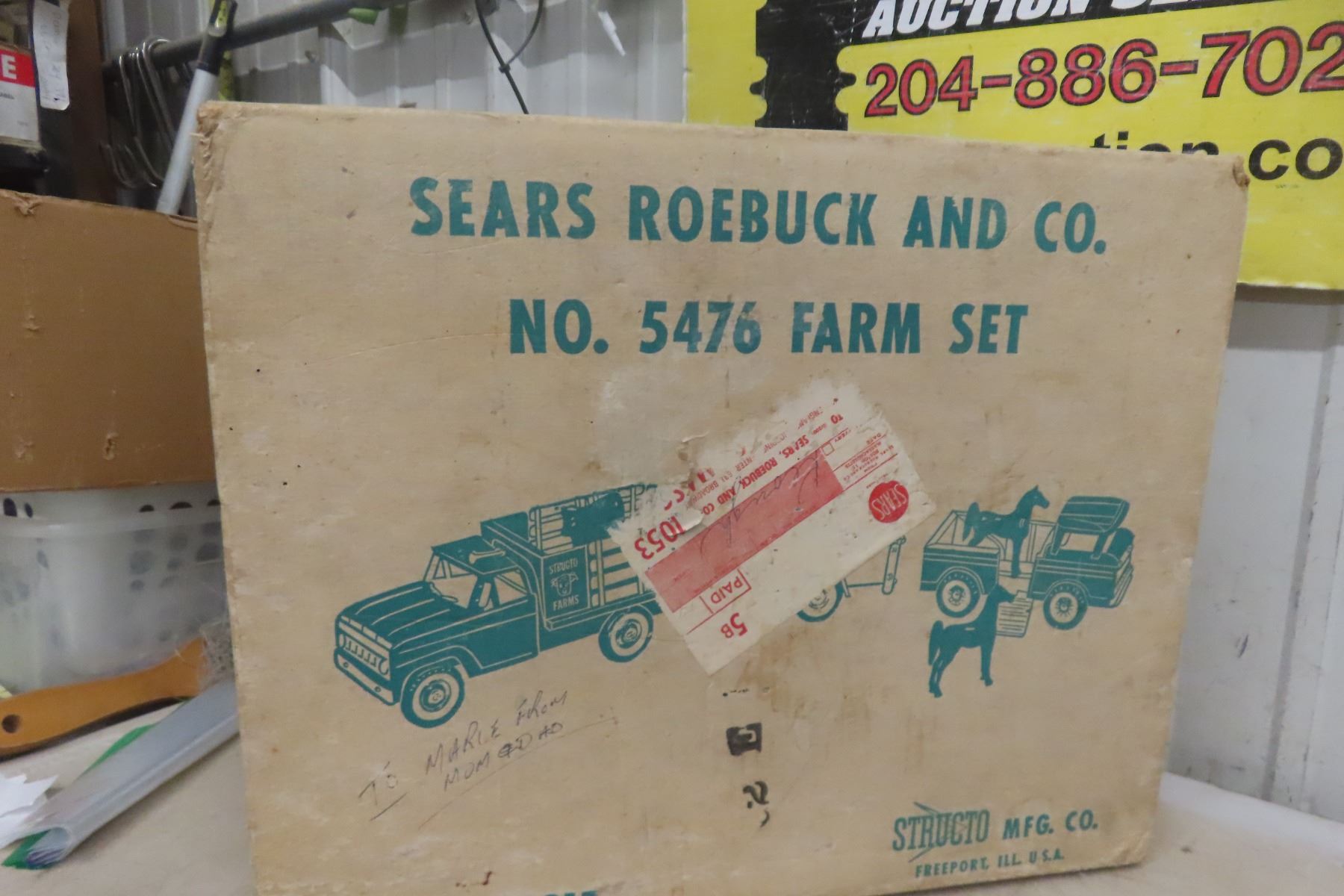 1960s Structo Mfg./Sears Rosebuck No.5476 Farm Set: Stake-Side Pressed Metal Truck 14'' Long, Ramp Side Truck 10'' Long with Trailer 10'' Long, Comes with Cows, Horses & Box.