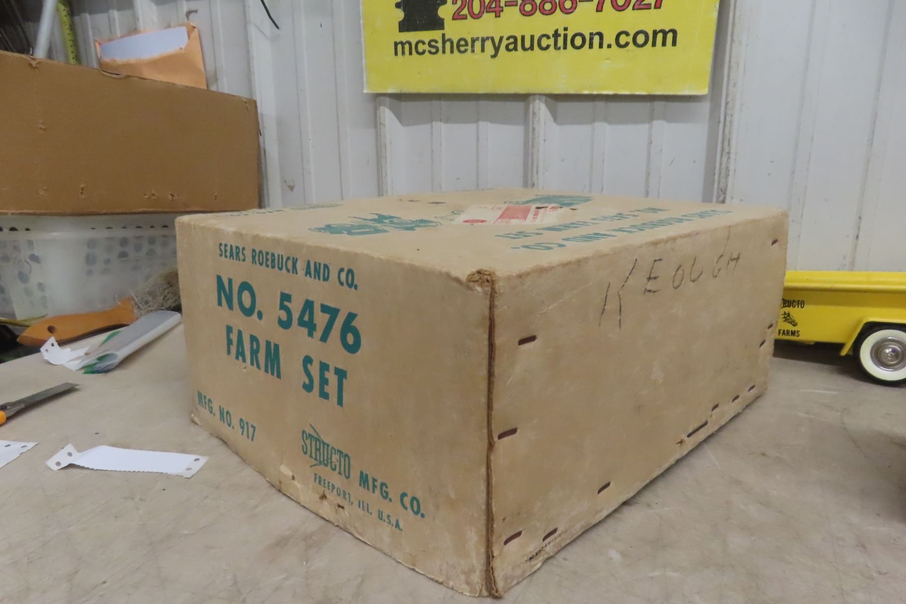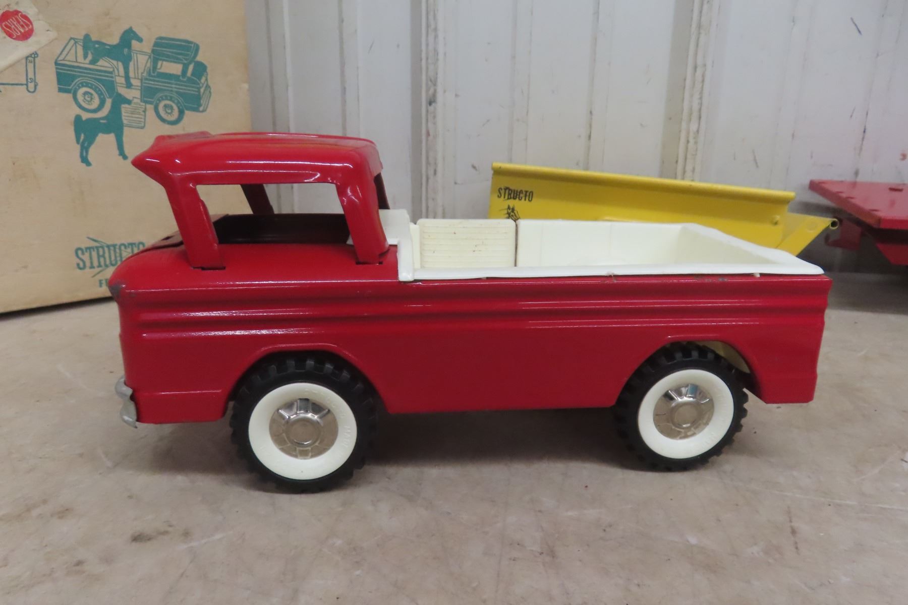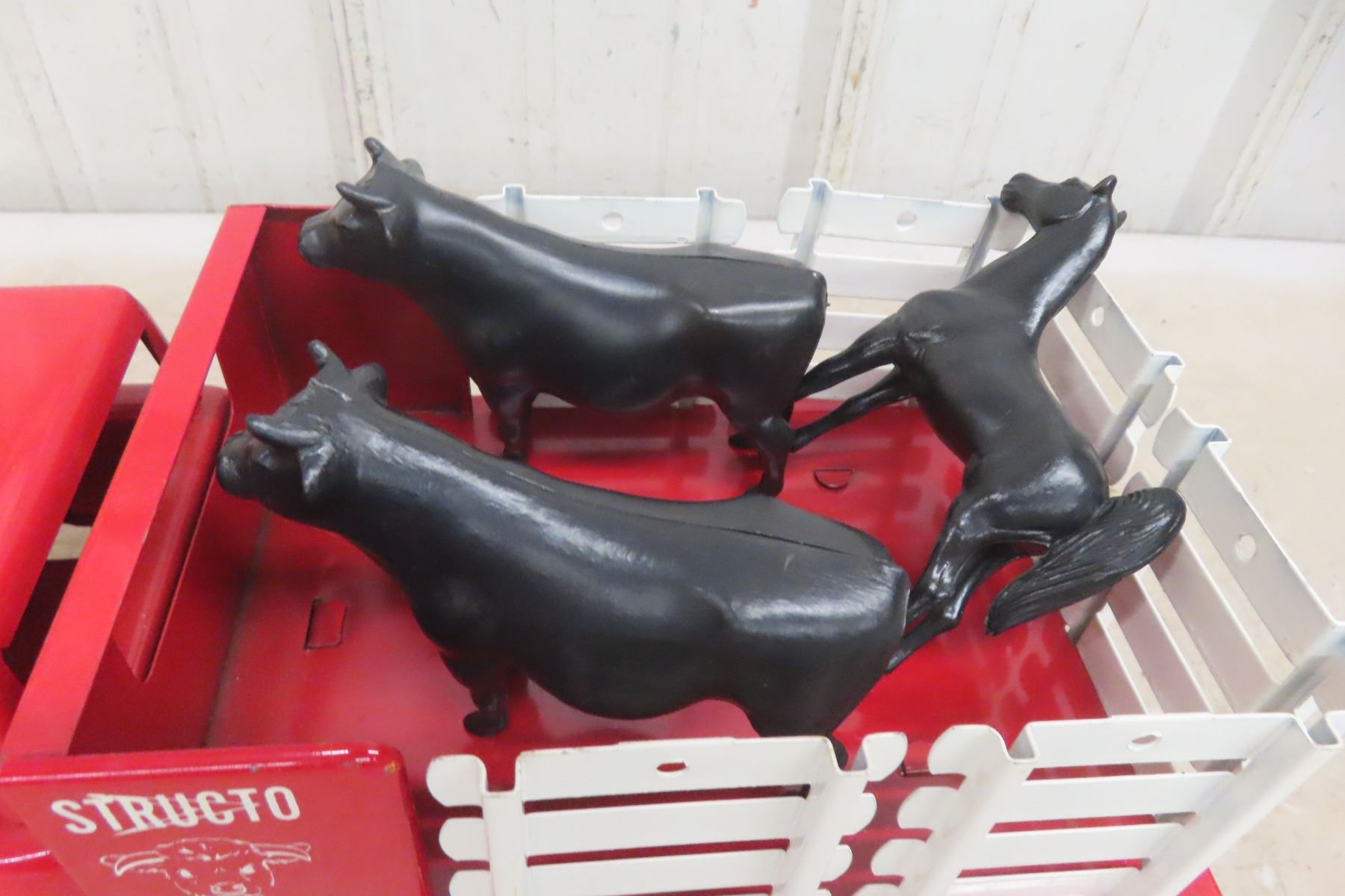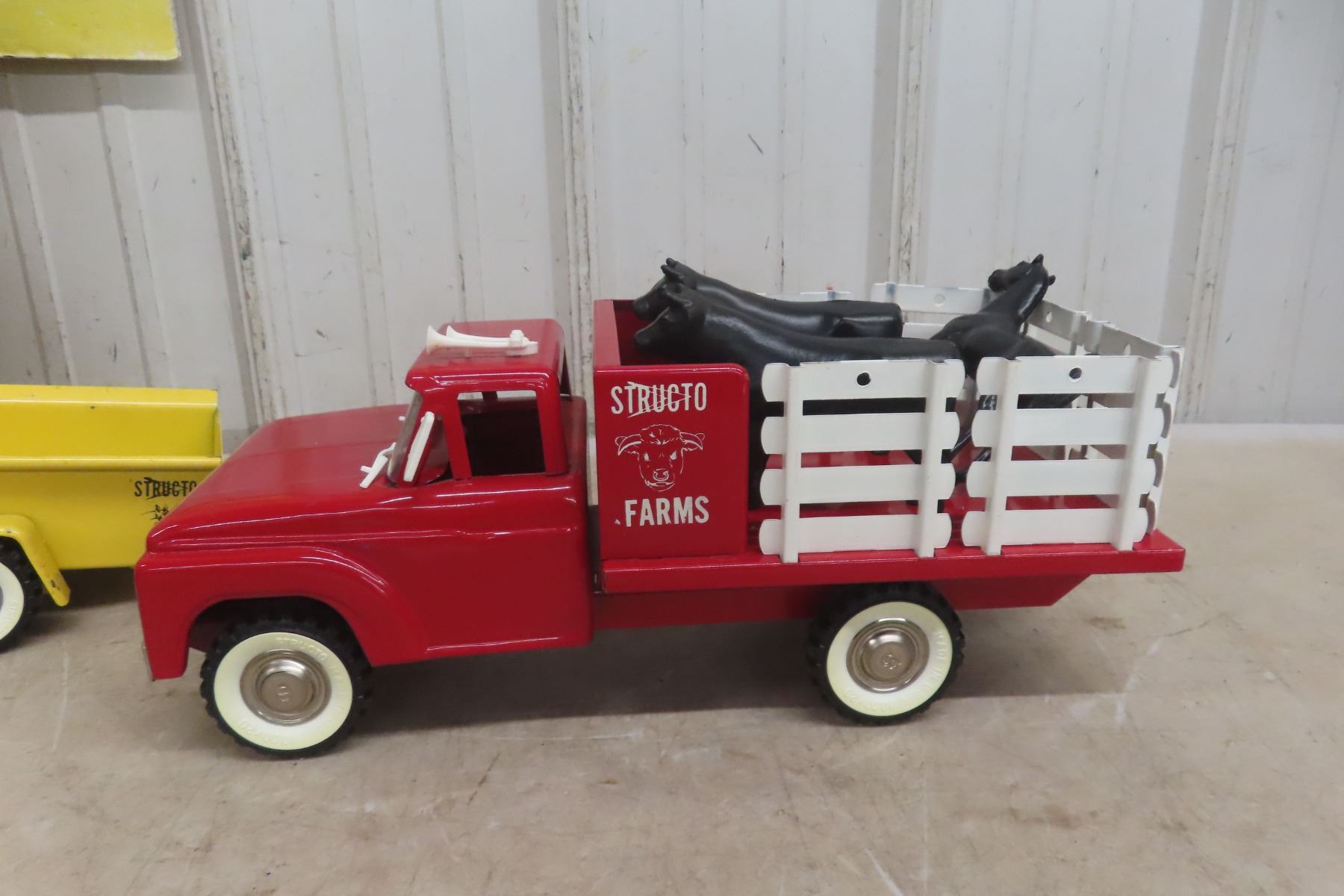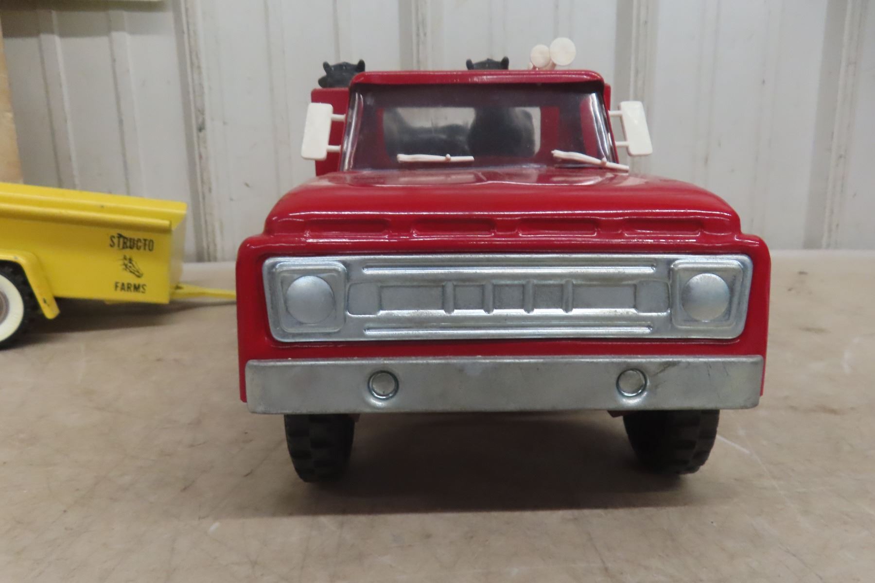 1960s Structo Mfg./Sears Rosebuck No.5476 Farm Set: Stake-Side Pressed Metal Truck 14'' Long, Ramp Side Truck 10'' Long with Trailer 10'' Long, Comes with Cows, Horses & Box.