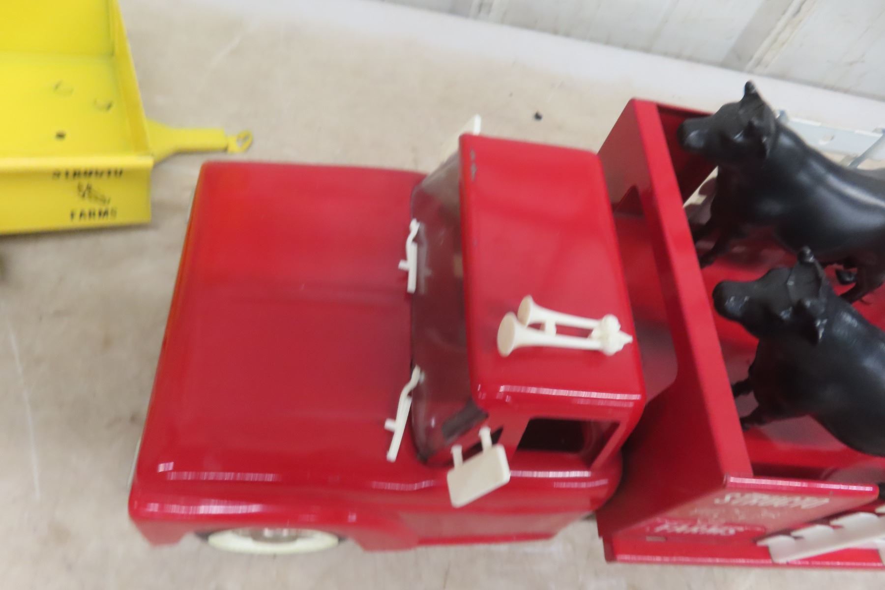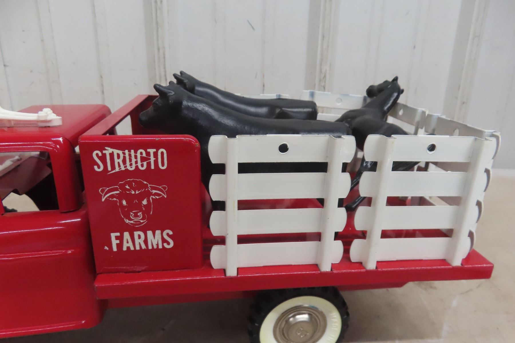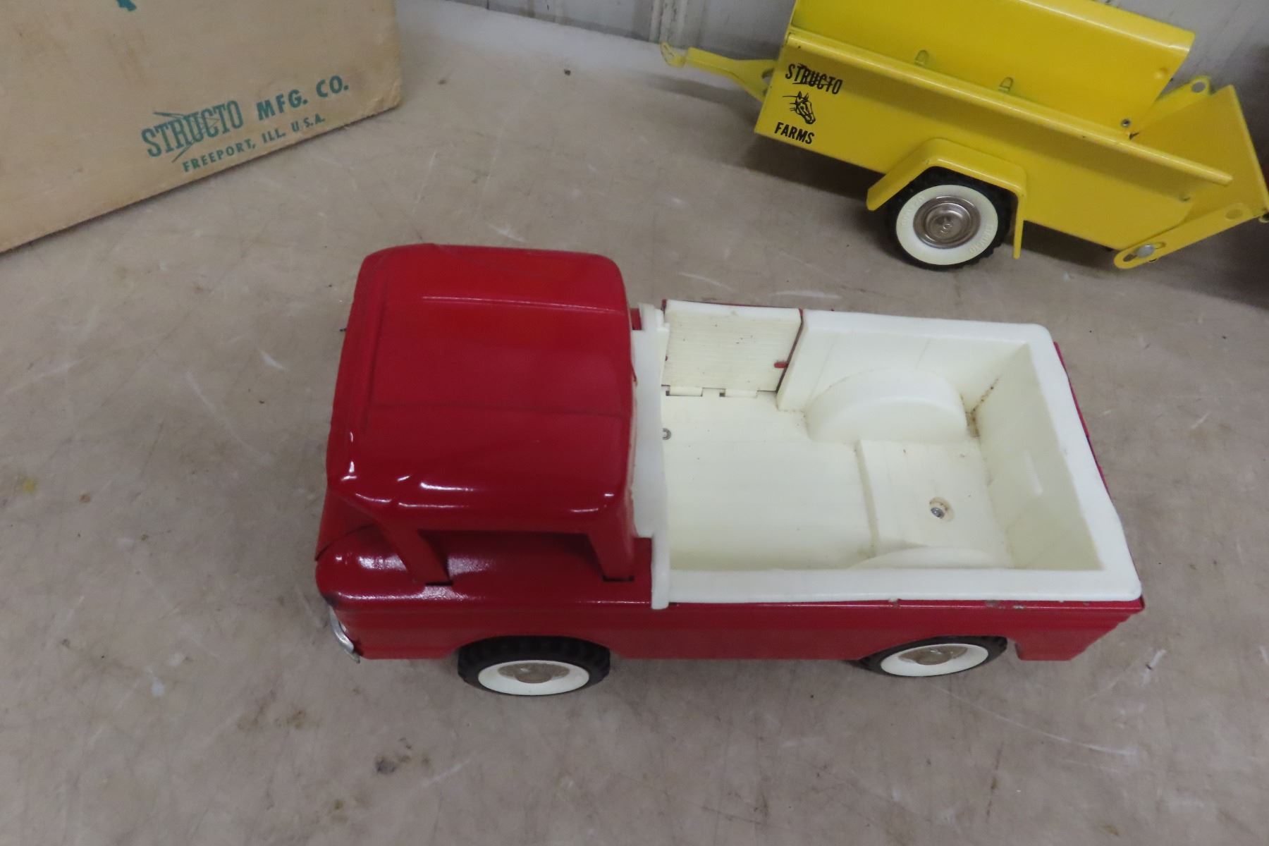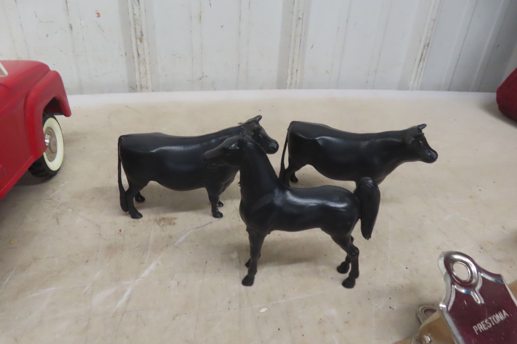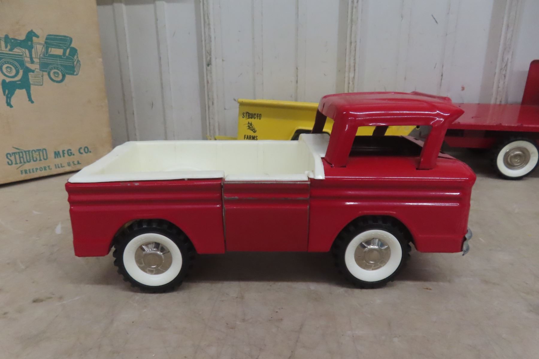 1960s Structo Mfg./Sears Rosebuck No.5476 Farm Set: Stake-Side Pressed Metal Truck 14'' Long, Ramp Side Truck 10'' Long with Trailer 10'' Long, Comes with Cows, Horses & Box.