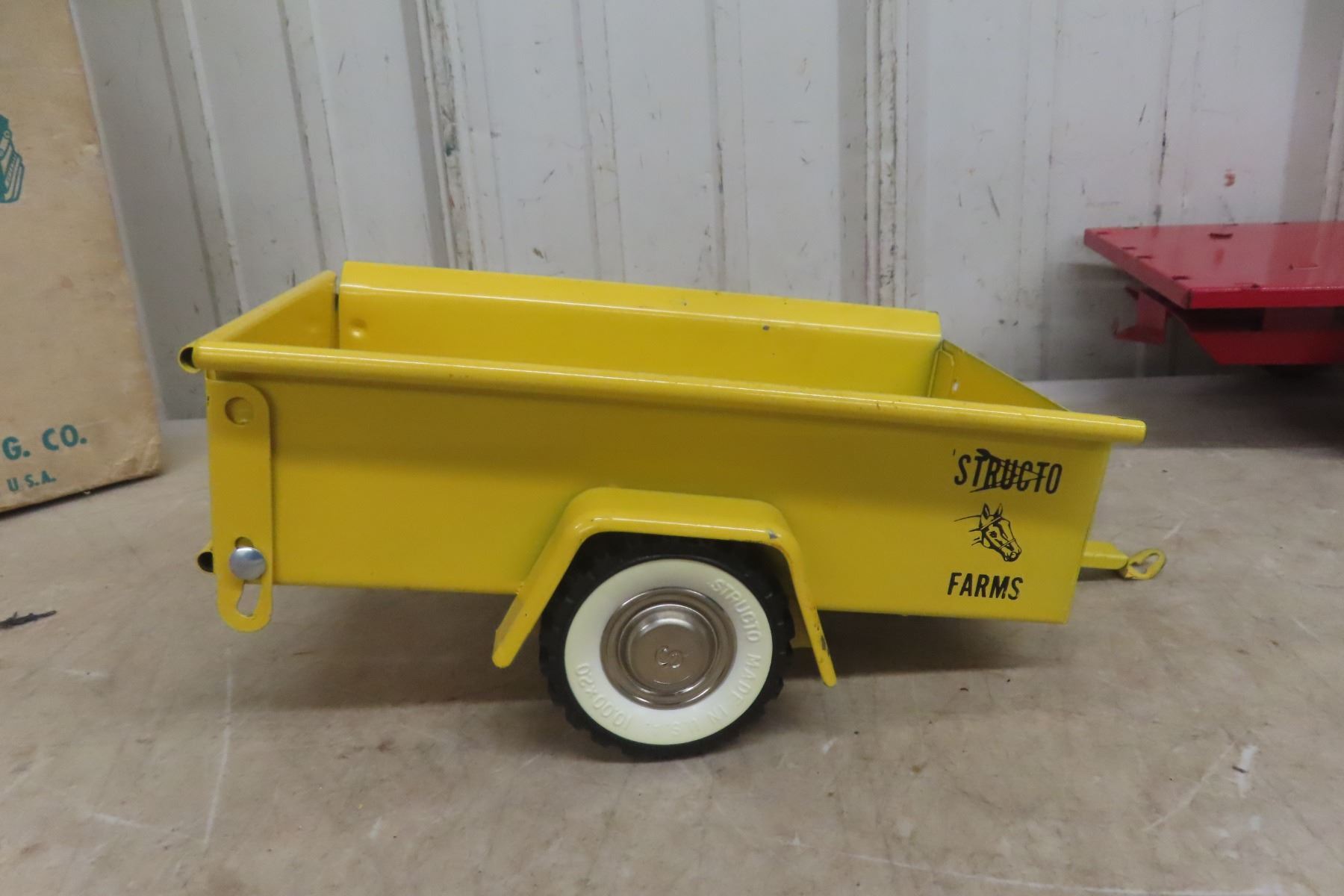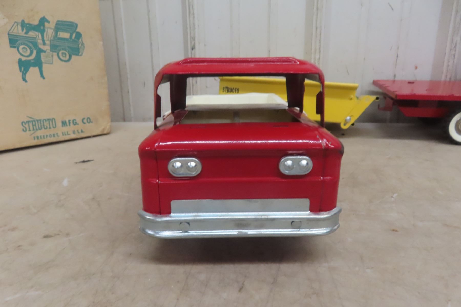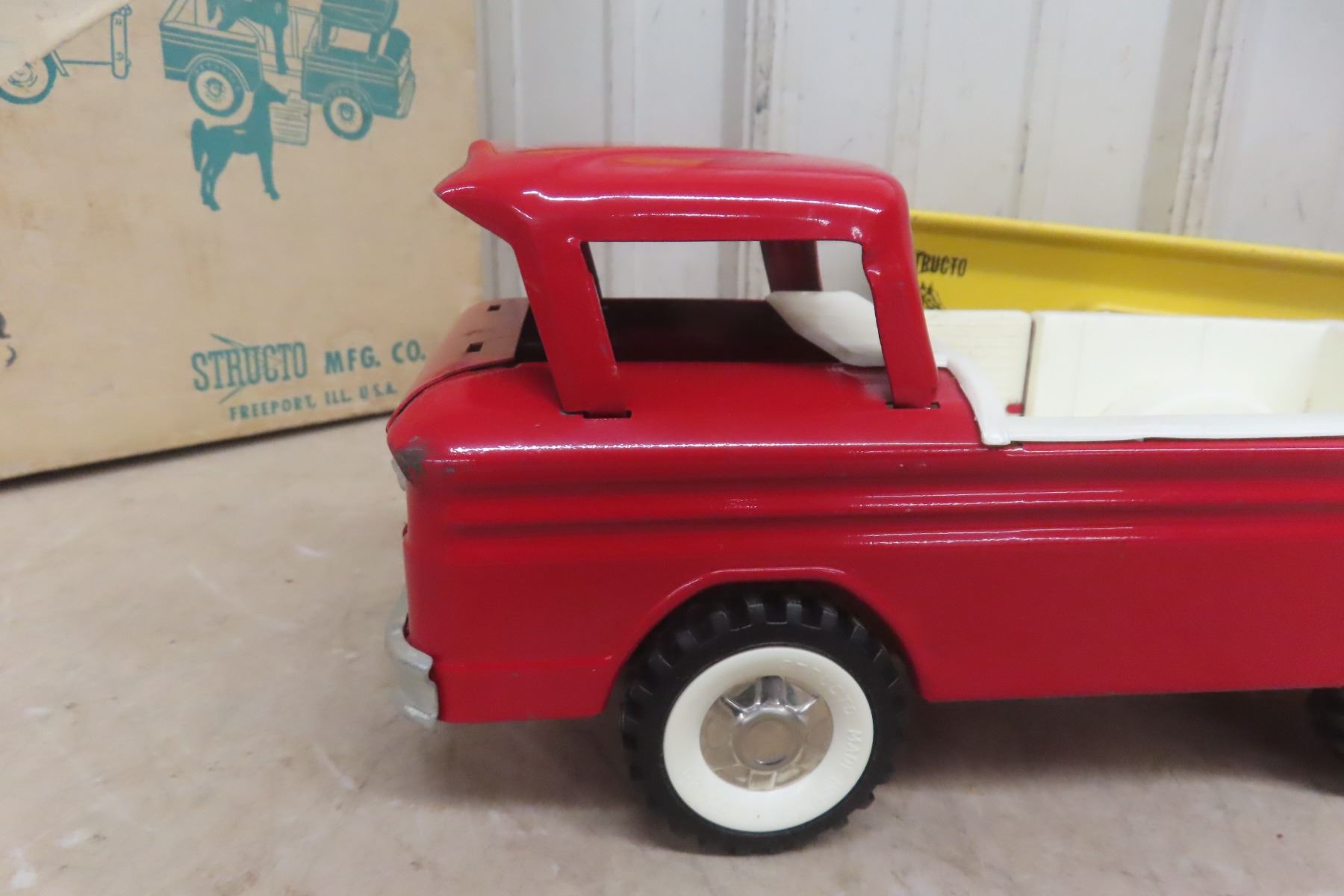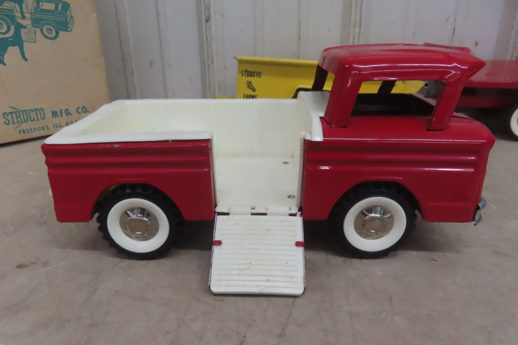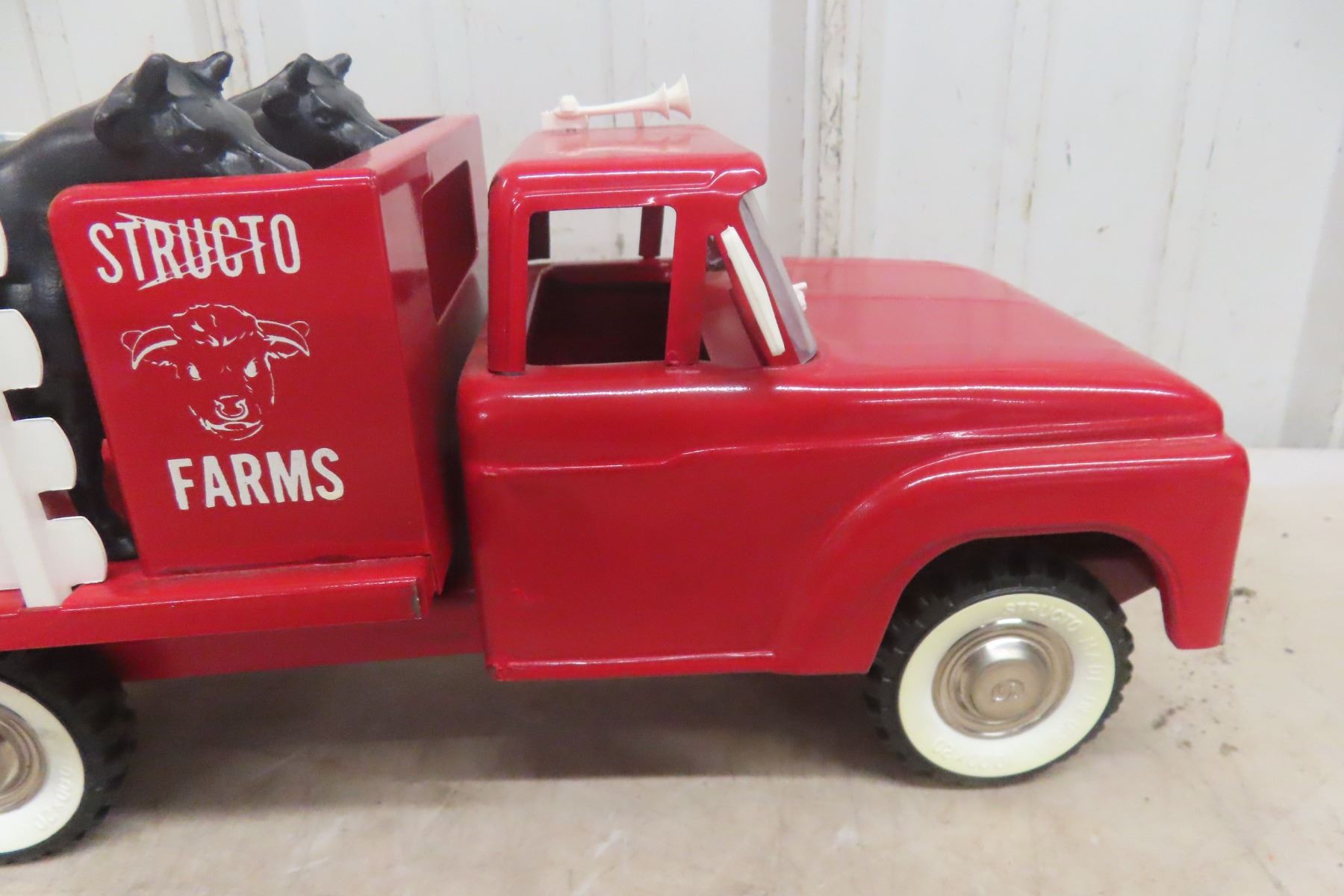 1960s Structo Mfg./Sears Rosebuck No.5476 Farm Set: Stake-Side Pressed Metal Truck 14'' Long, Ramp Side Truck 10'' Long with Trailer 10'' Long, Comes with Cows, Horses & Box.