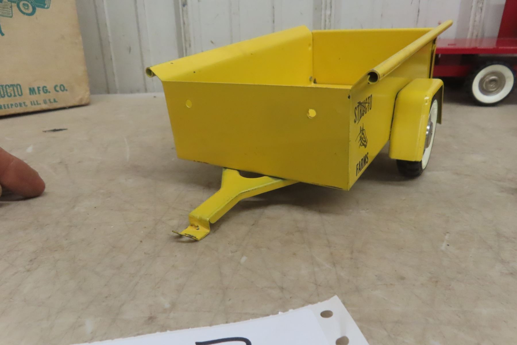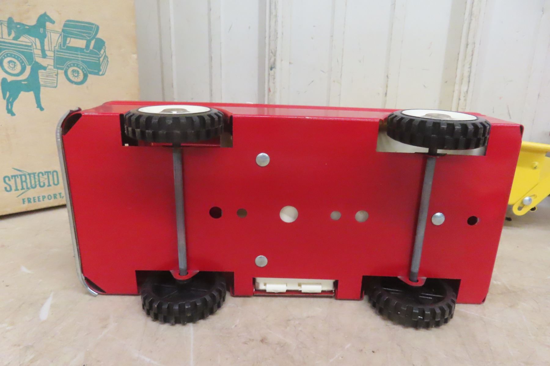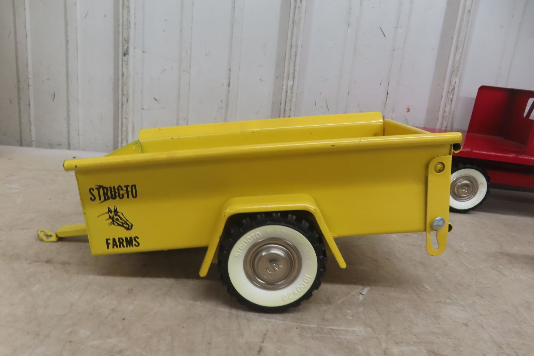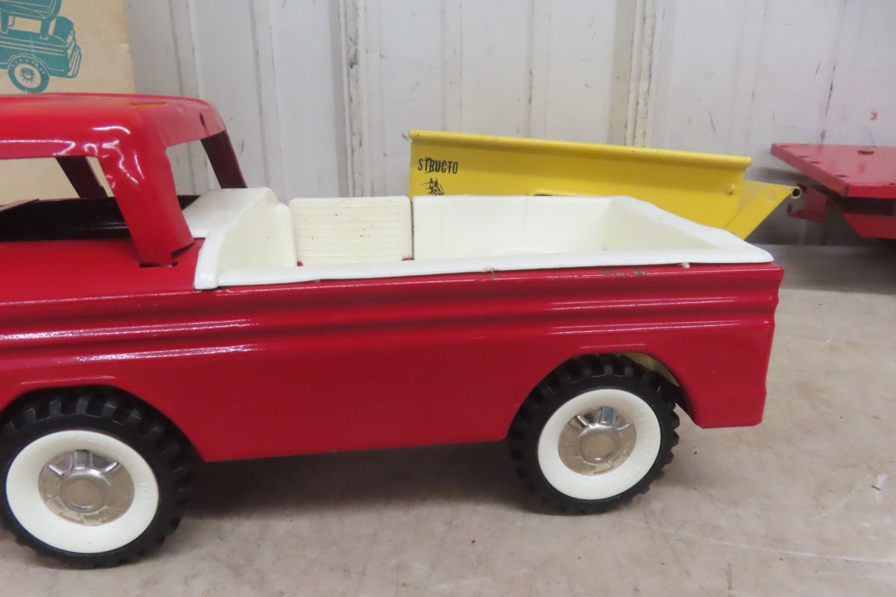 1960s Structo Mfg./Sears Rosebuck No.5476 Farm Set: Stake-Side Pressed Metal Truck 14'' Long, Ramp Side Truck 10'' Long with Trailer 10'' Long, Comes with Cows, Horses & Box.