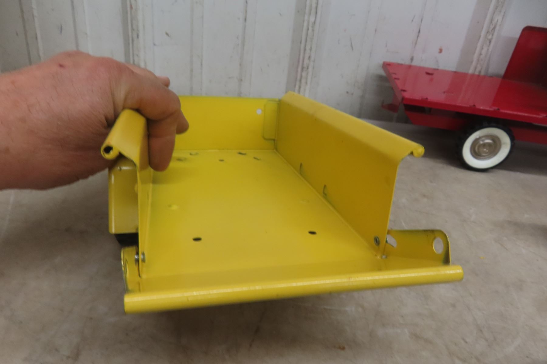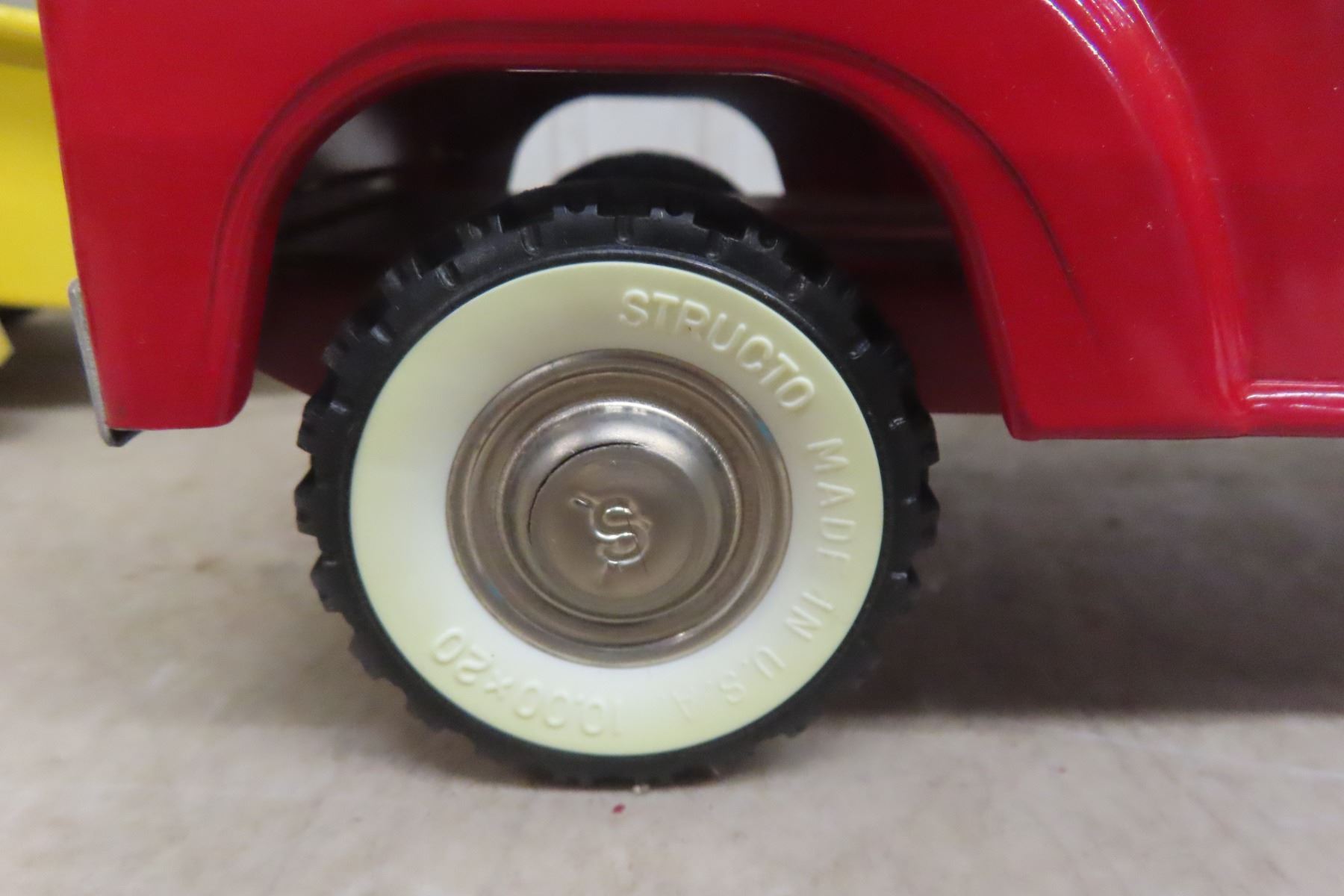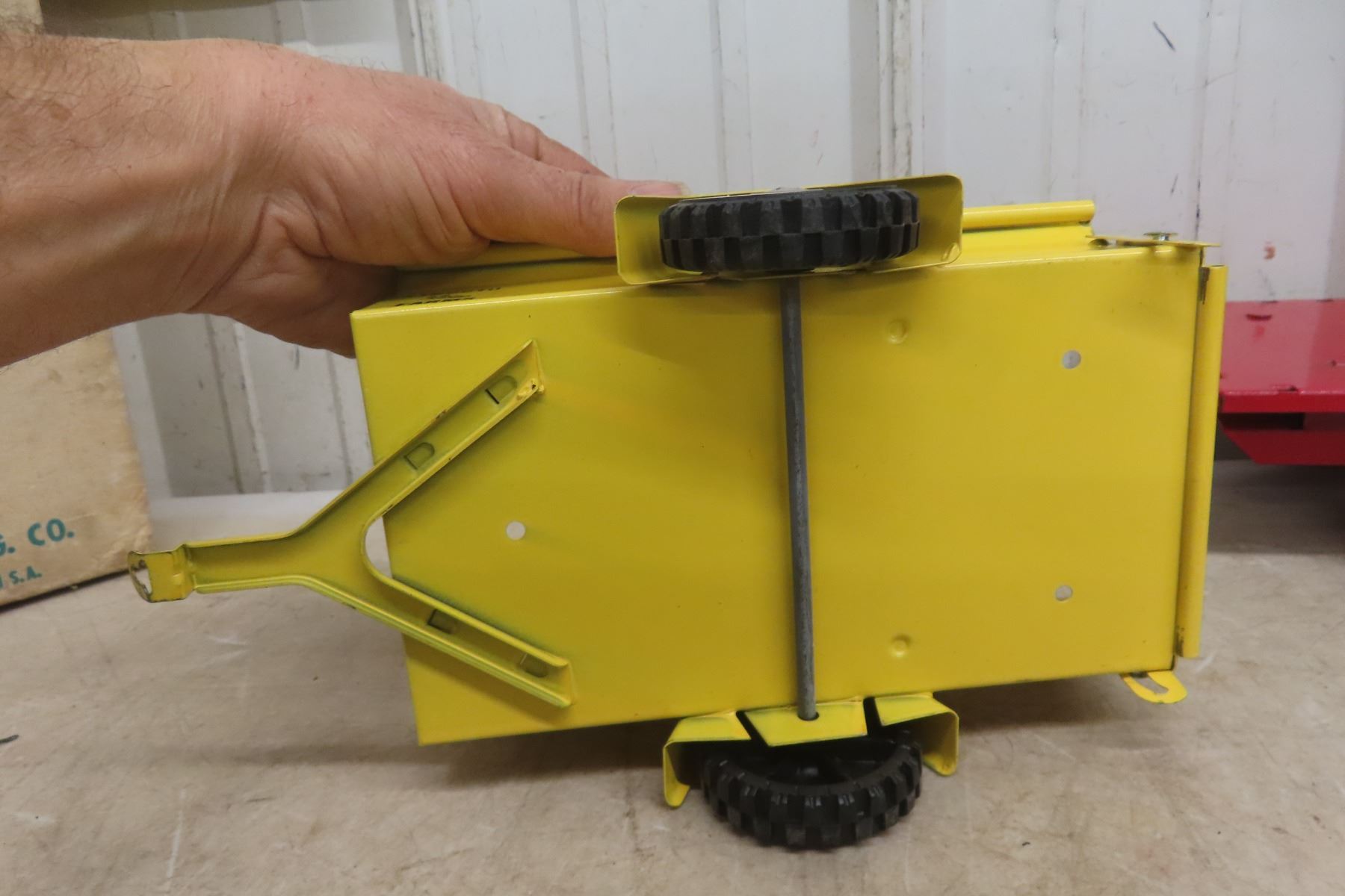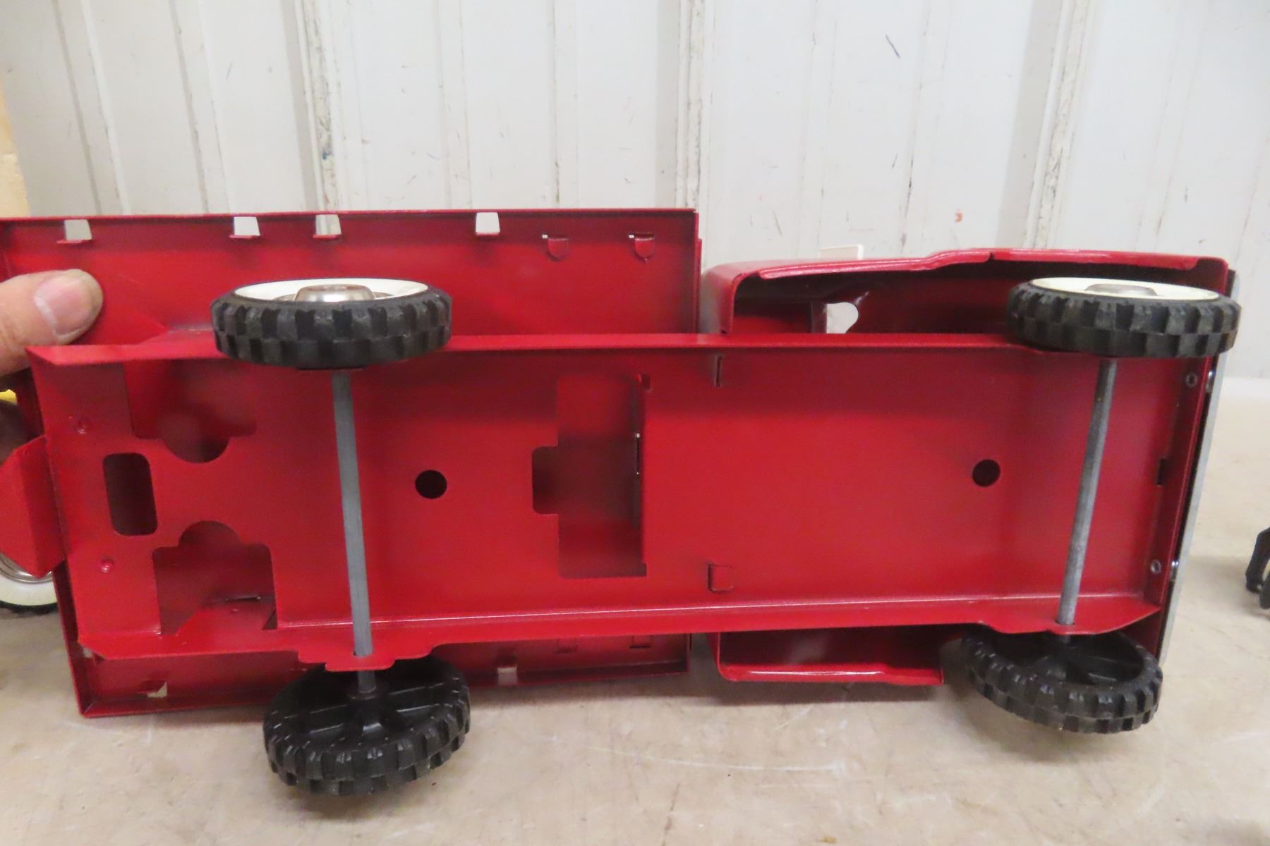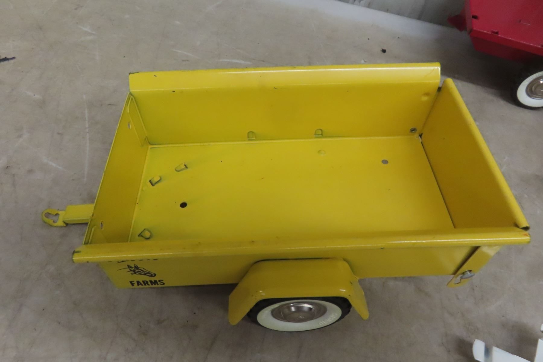 1960s Structo Mfg./Sears Rosebuck No.5476 Farm Set: Stake-Side Pressed Metal Truck 14'' Long, Ramp Side Truck 10'' Long with Trailer 10'' Long, Comes with Cows, Horses & Box.