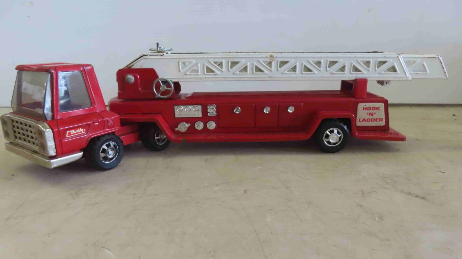 1960s Vintage Buddy L Snorkel Firetruck 11'' x 4'' x 5'' , Hook and Ladder Fire Truck 18'' x