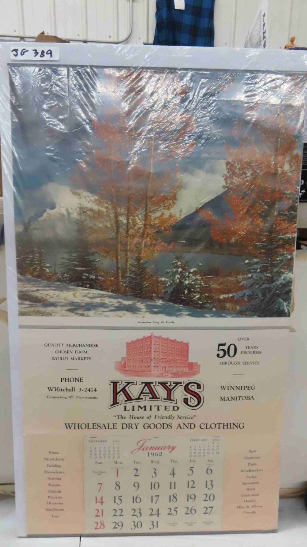 1962 Calendar 22" x 38.5" Advertising Kay's Limited, Whole Dry Goods + Clothing Wpg, 22" x 39"