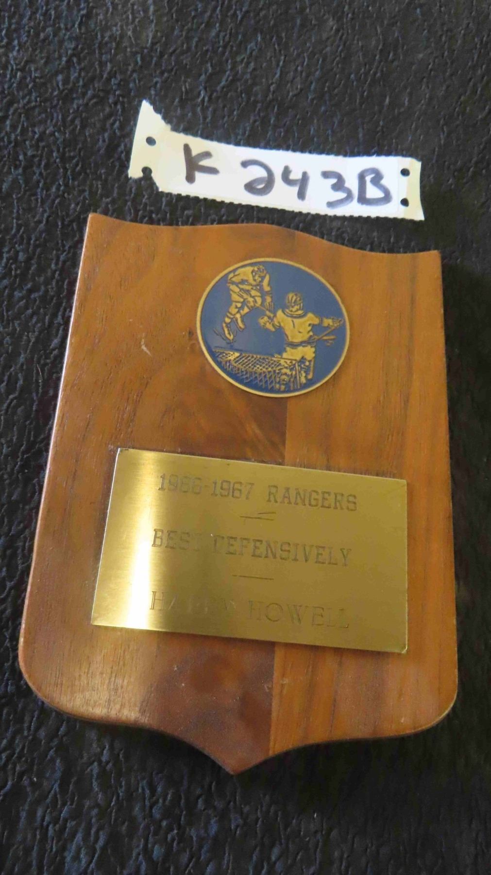 1966-67 Rangers Harry Howell Best Defensively Shield-Shaped Award Plaque 5'' x 7''