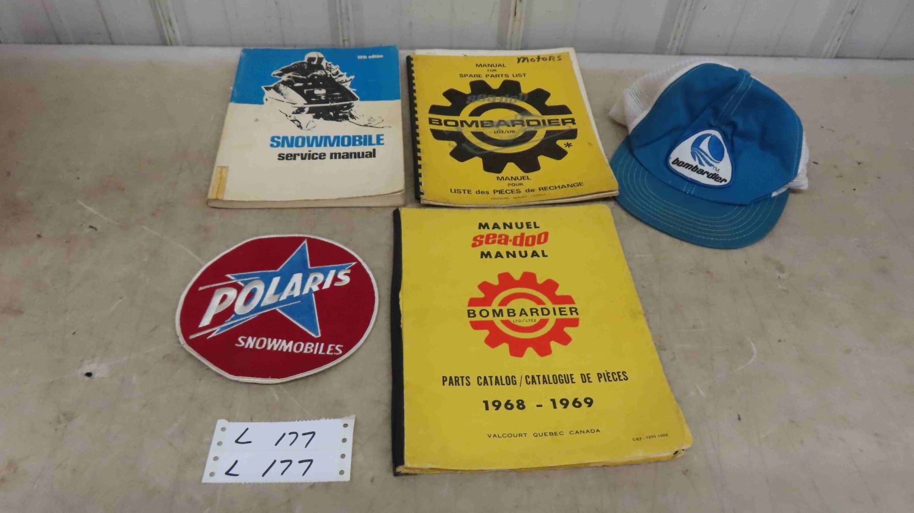1968-69 Bombadier Manual, Snowmobile Service Manual 5th Edition, Bombadier Spare Parts List Manual, Polaris Patch, Bombadier Cap