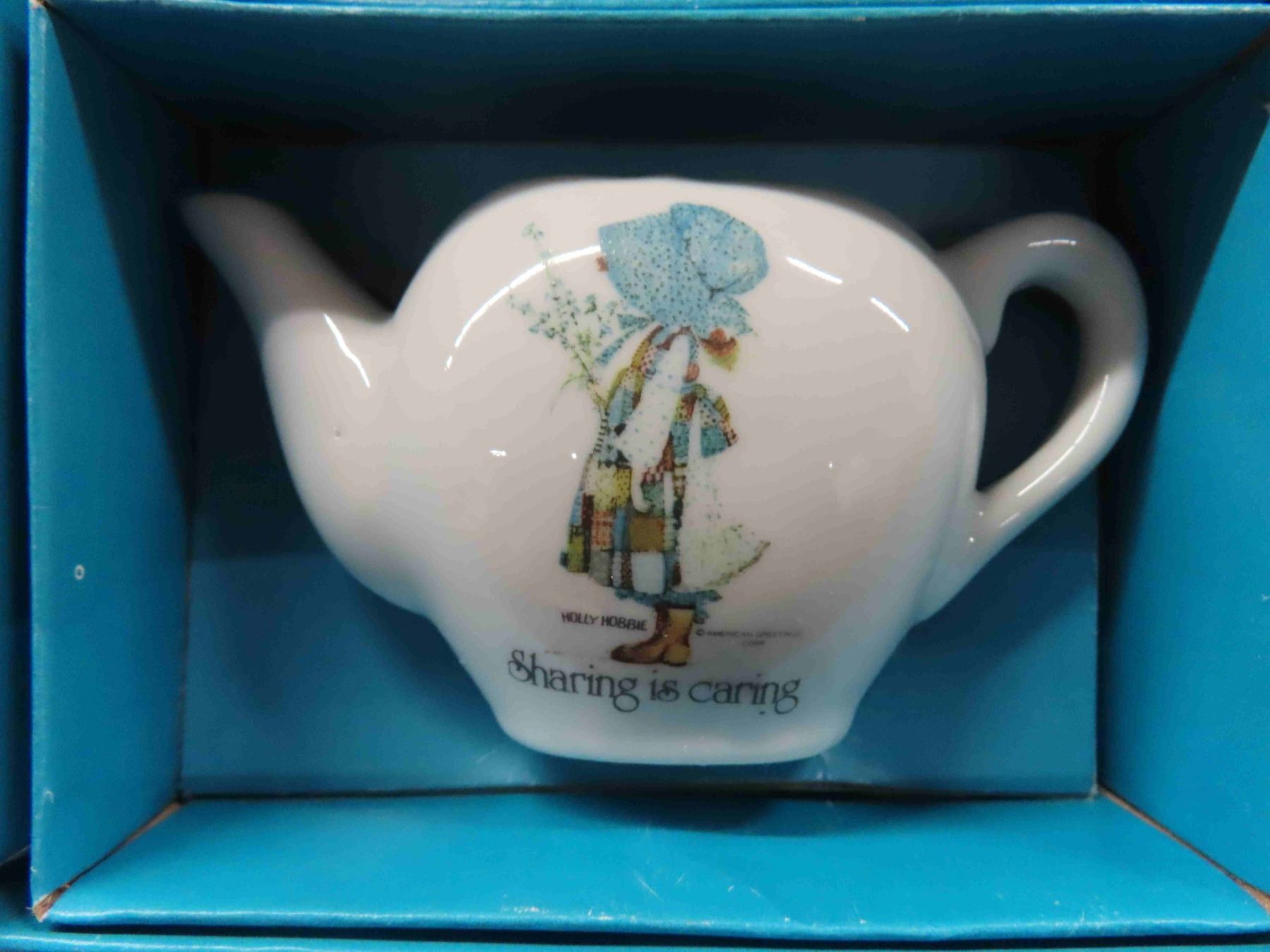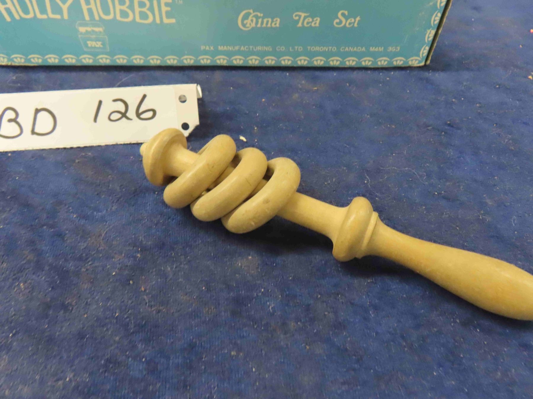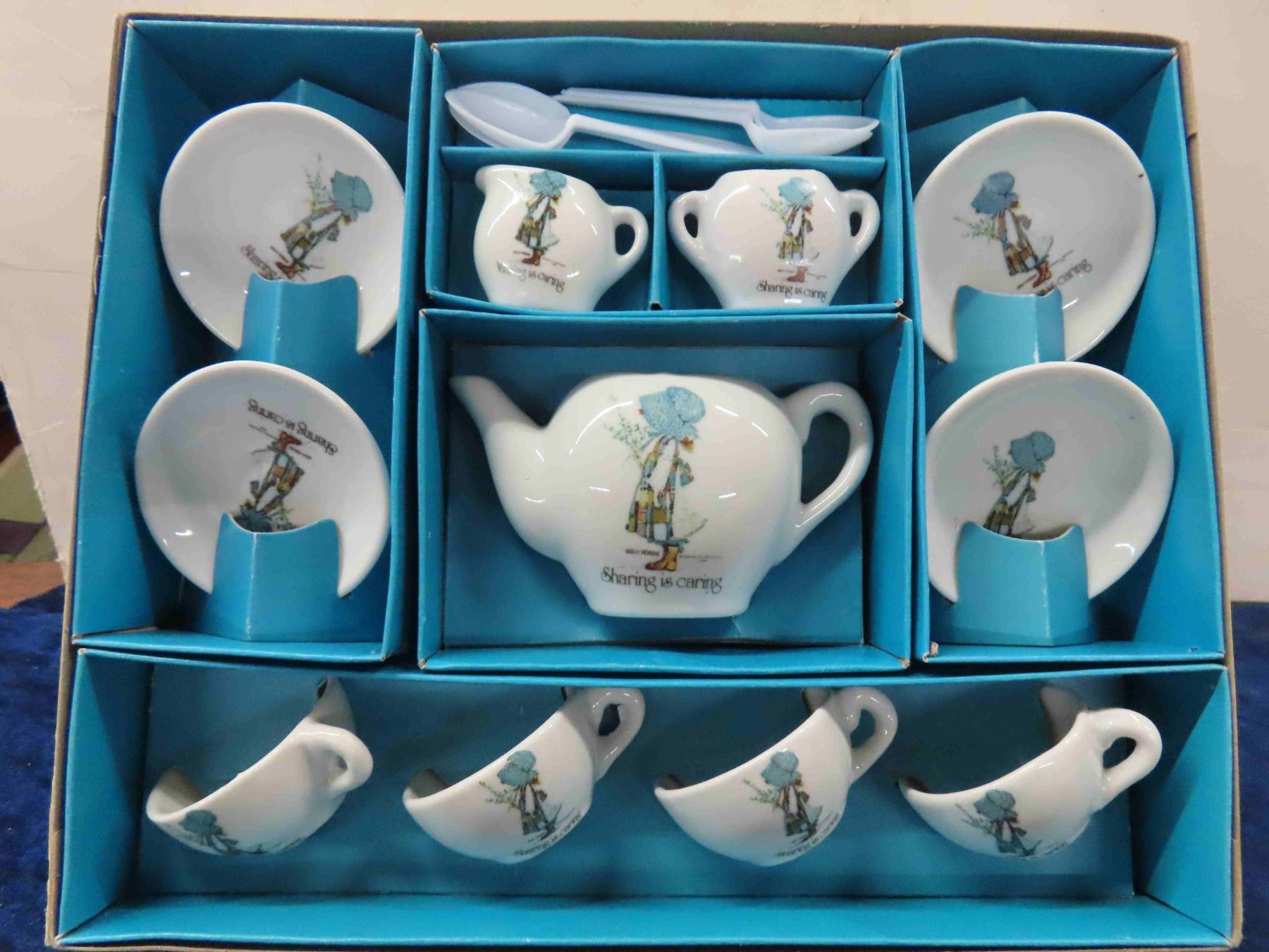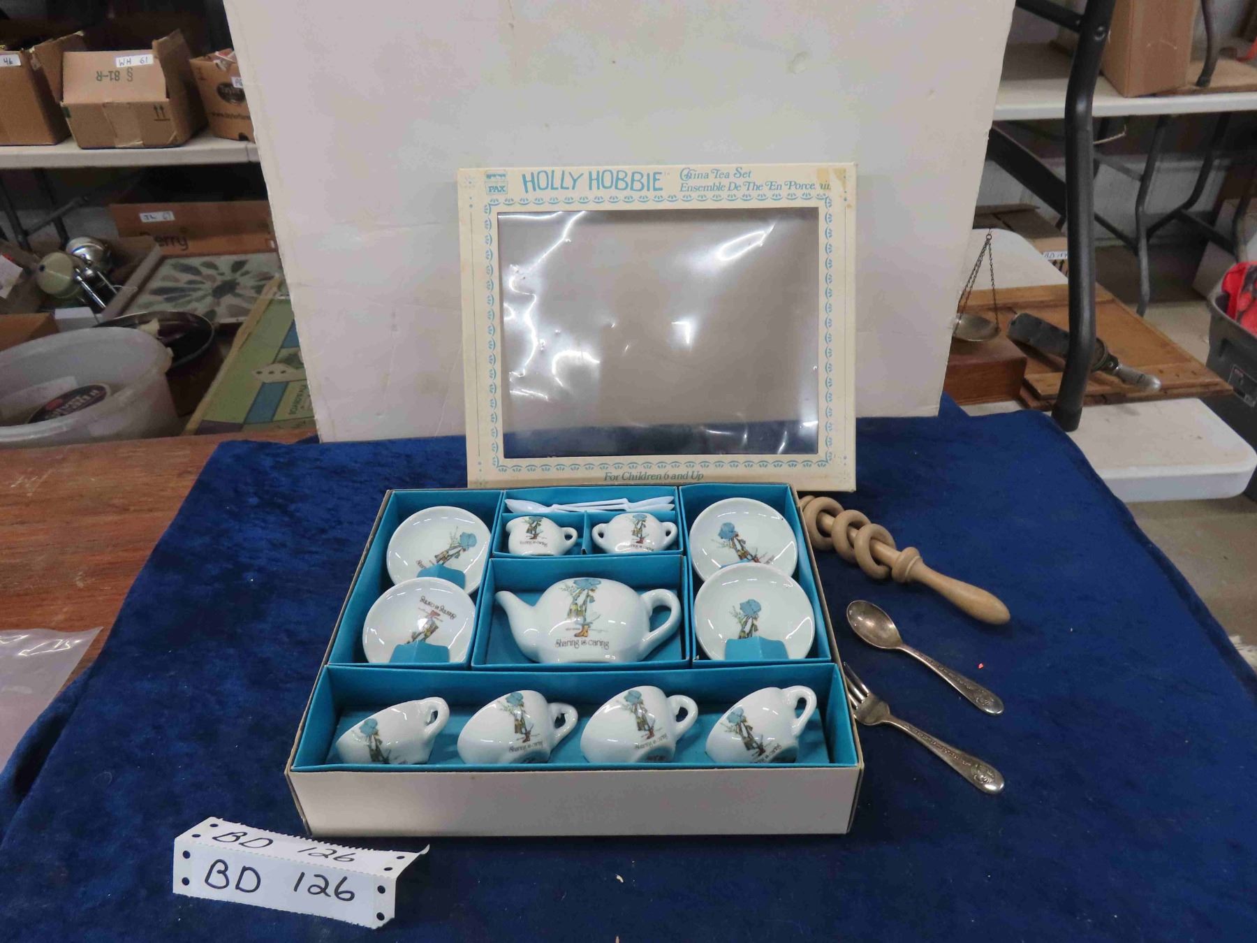 1970 Holly Hobbie China Tea Set, Mint in Box, Antique Wooden Baby Rattle &